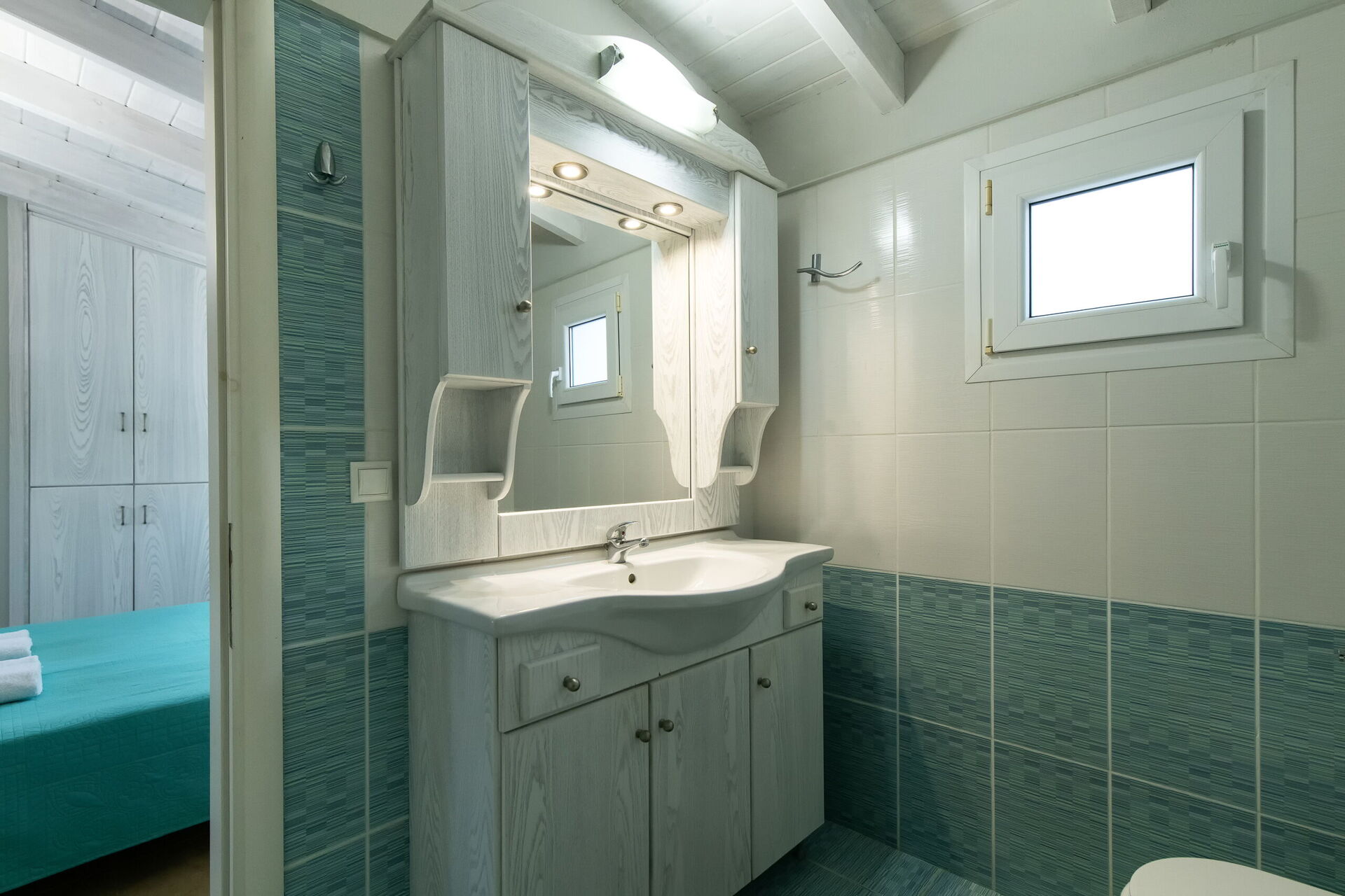 Primo piano (accessibile tramite una scala a chiocciola): camera matrimoniale (aria condizionata) con bagno con vasca.