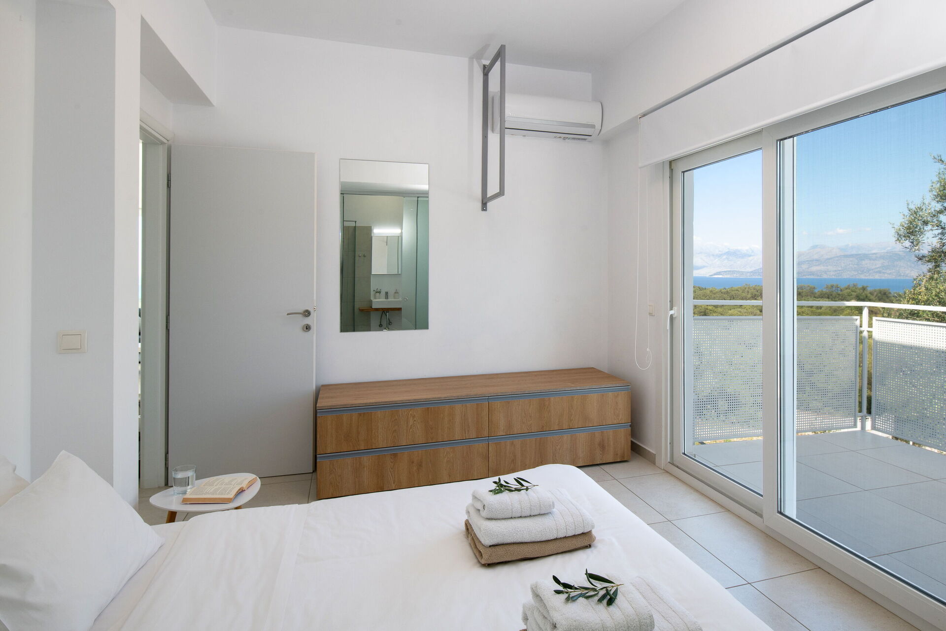 Il piano superiore è identico a quello inferiore, tranne per il fatto che la camera da letto principale ha solo un letto matrimoniale e non un divano letto supplementare. Ampi terrazzi su entrambi i piani offrono una vista magica sul Mar Ionio e sulla costa albanese.