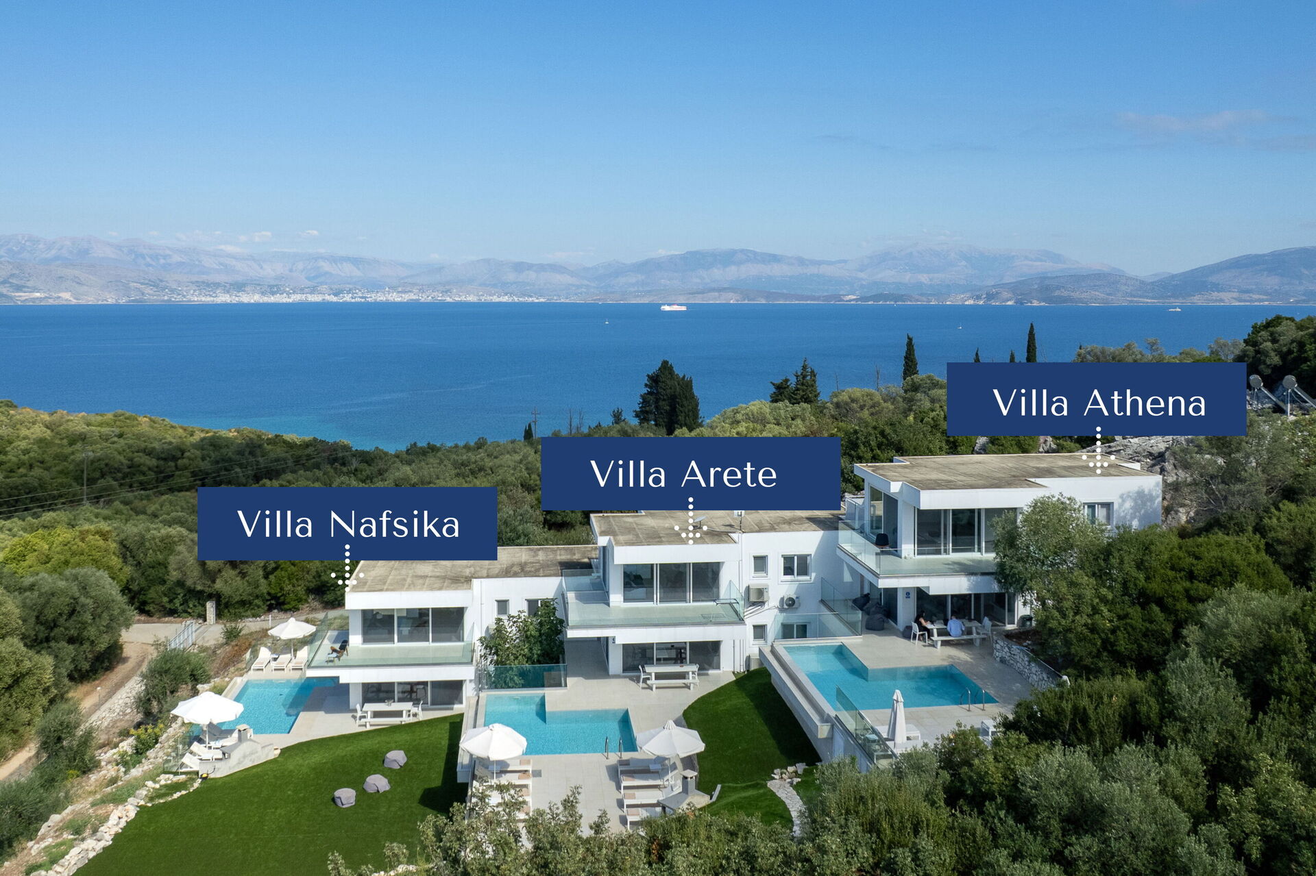 Villa Nafsika è una nuova struttura che occupa una posizione privilegiata nella zona di Perithia, sulla rinomata costa nord-orientale di Corfù.