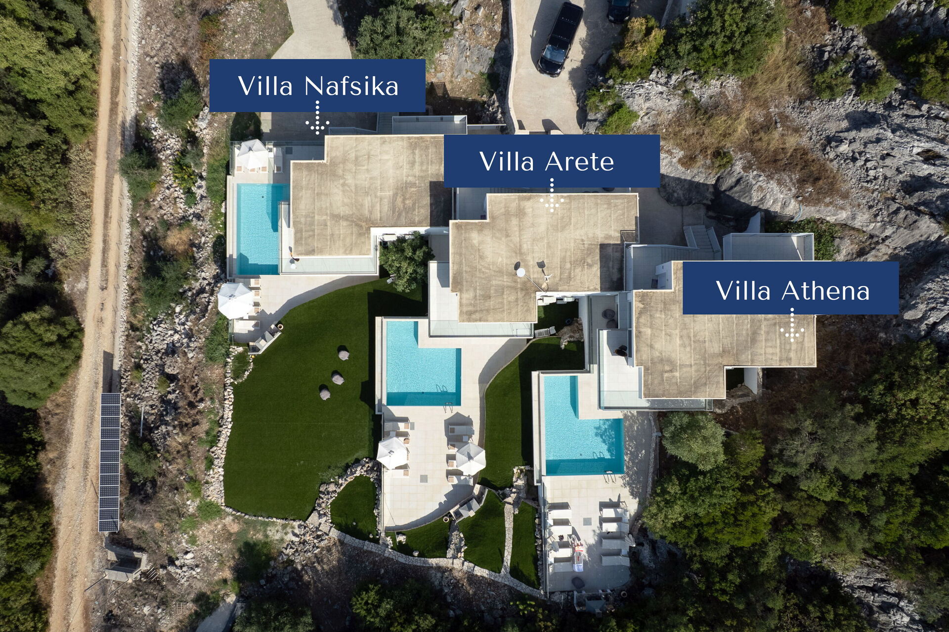 Really great place with stunning views, lovely pool and excellent air conditioning! Notes - the villas are split into two apartments which means you get two kitchens, two living rooms and two outdoor areas; great perk. The hosts left a bottle of wine on arrival which was a lovely touch. There is plenty of spare towels and bedding etc. Pros - great space for entertaining, stunning and well-maintained property, comfy beds, good showers, and good location (secluded but within 10mins walk of a few shops and restaurants) Cons - the hill up to the villas is quite steep but still perfectly manageable, getting a taxi into the closest towns can be a bit tricky at busy times (though this is true of most of Corfu) and there were quite a lot of insects when you say out at night with the lights on. In summary a fantastic place I wouldn't hesitate to recommend!