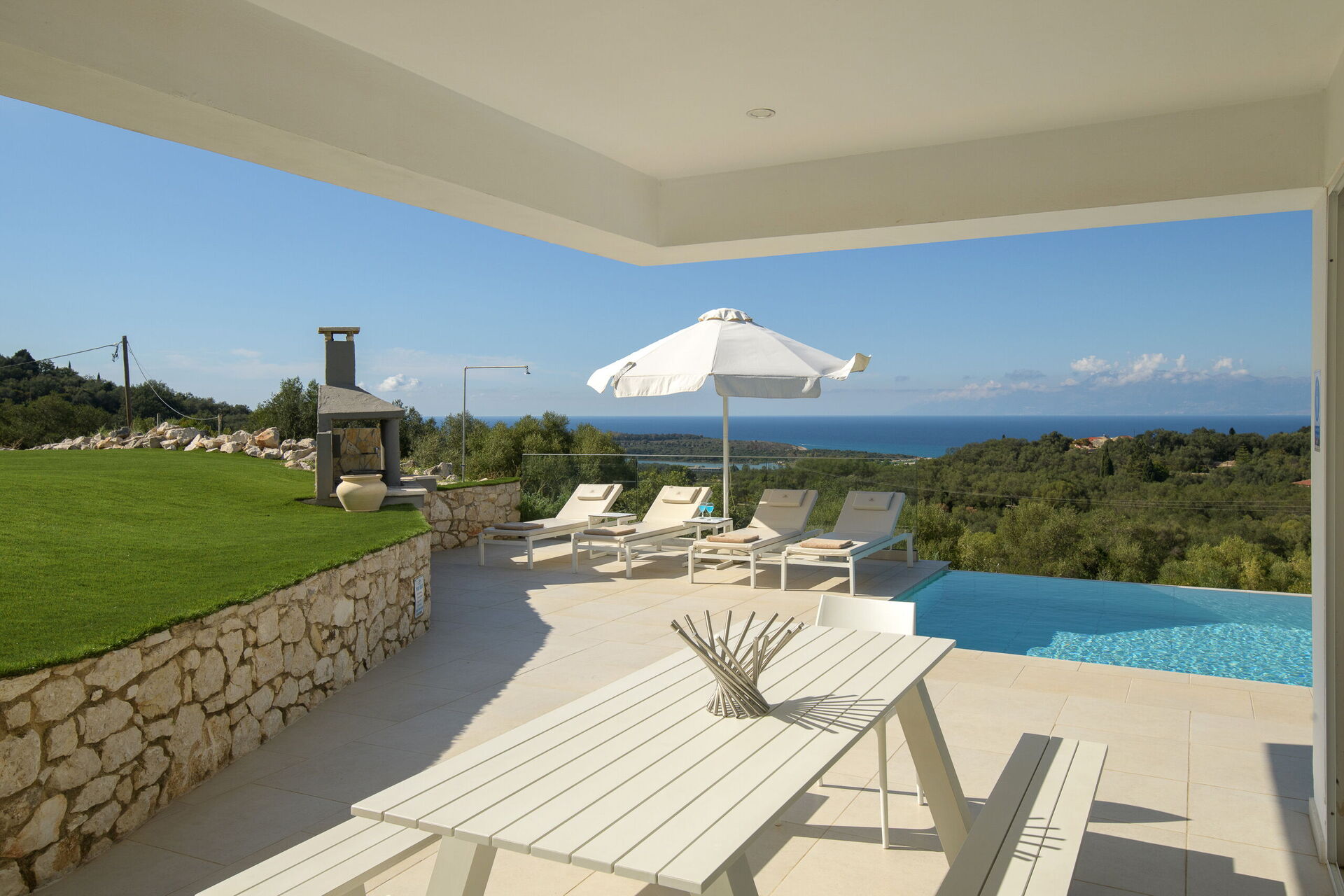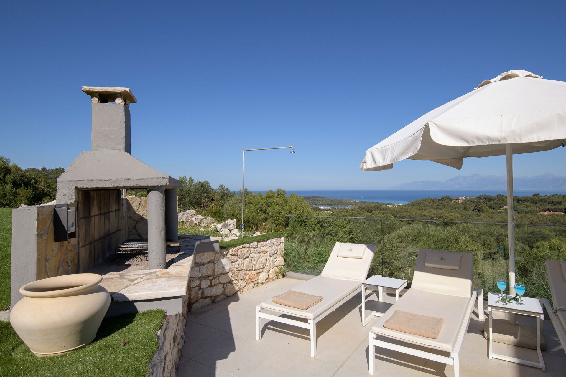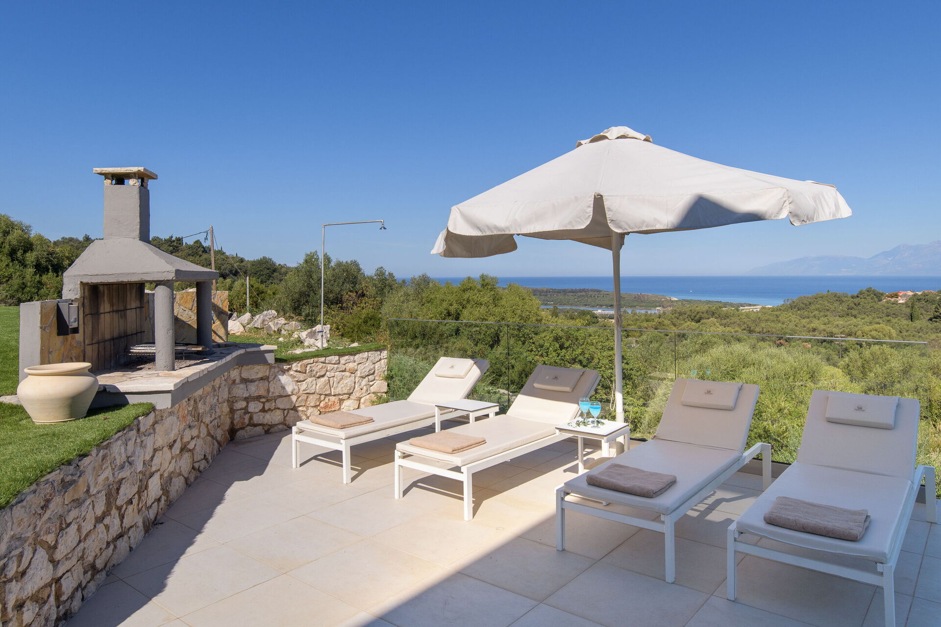 All'esterno ci sono terrazze splendidamente pavimentate e attrezzate con lettini per permettere a tutti gli ospiti di potersi godere a pieno la vista mozzafiato e la brezza marina. È inoltre disponibile una zona pranzo con barbecue, per deliziosi pasti all'aperto.