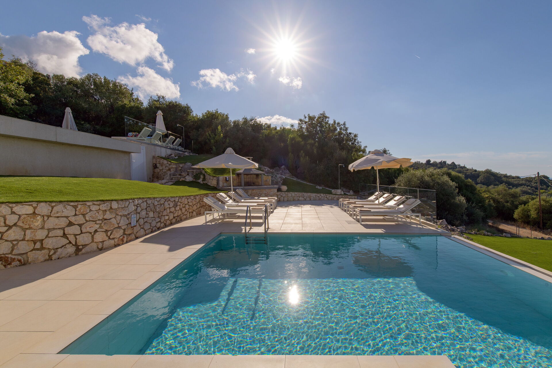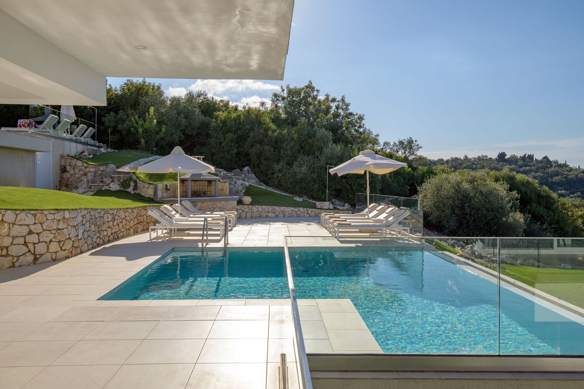 Moderna villa con piscina privata situata lungo la famosa costa nord-orientale di Corfù, in Grecia.