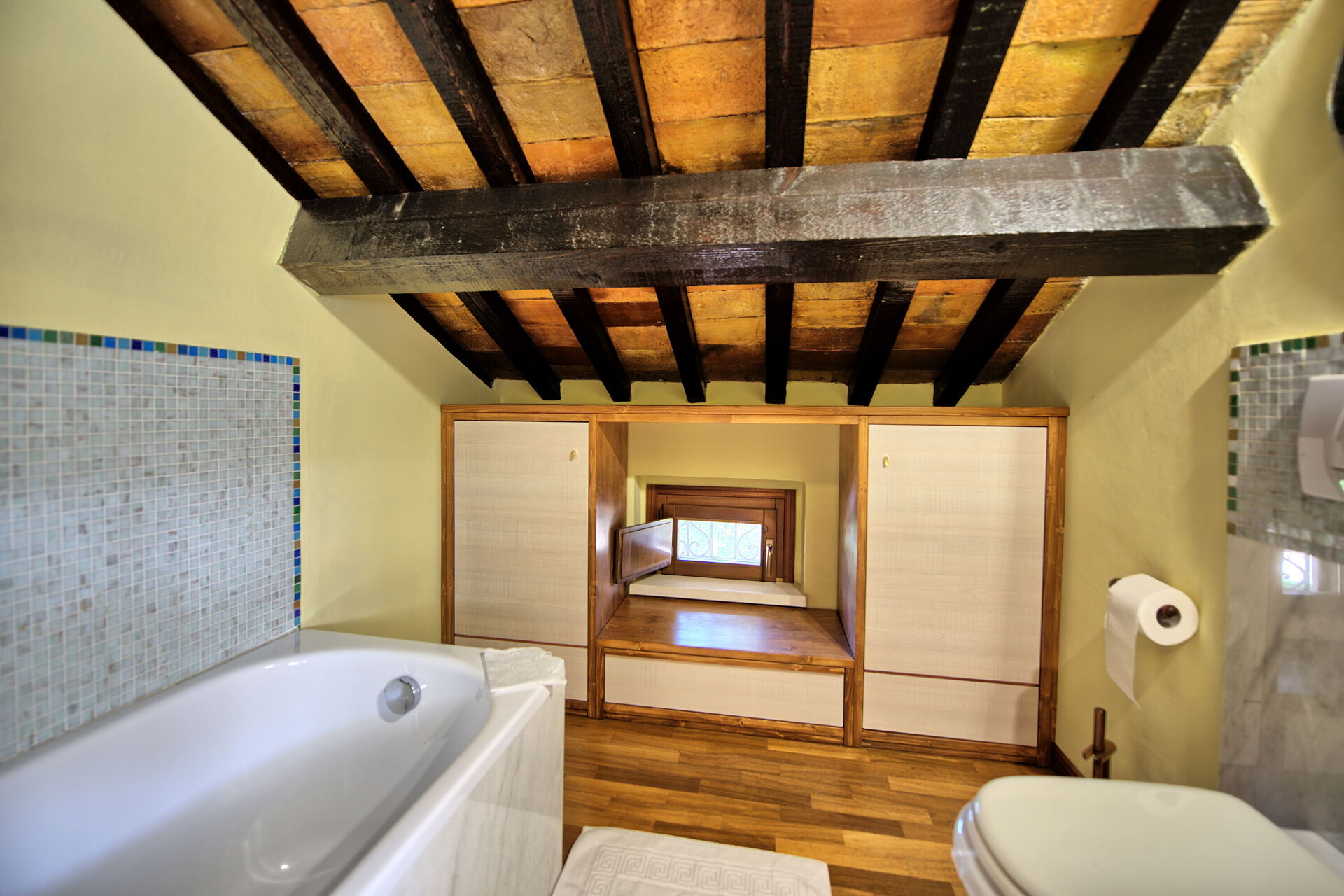 Primo piano (accessibile da scala interna vicino alla cucina): camera matrimoniale (misure del letto: 160 x 190 cm; aria condizionata, rifiniture di pregio parquet, e travi) con wc privato ricavato dal sotto tetto (altezza minima: 1,20 metri; altezza massima: 2.10) con mezza vasca da bagno