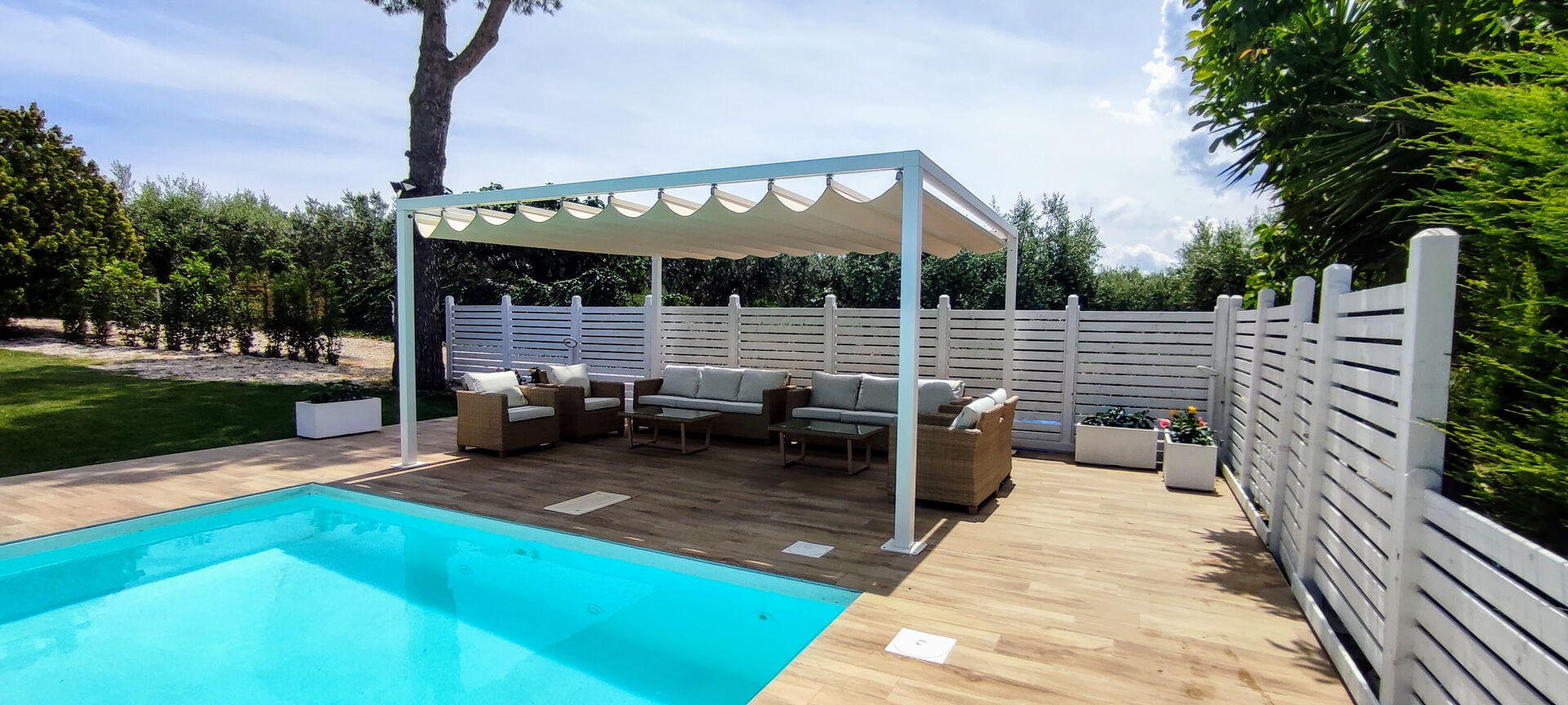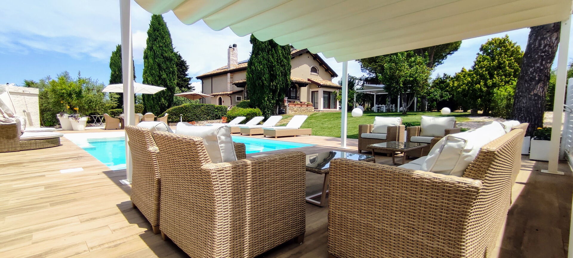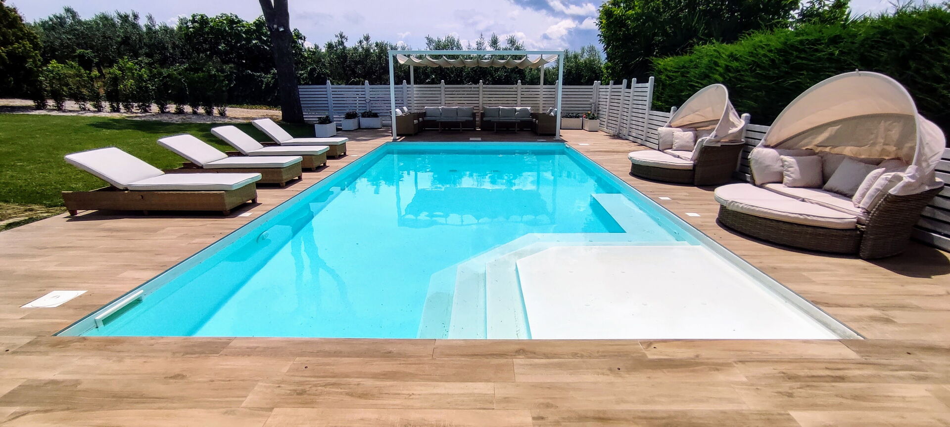 Il bel giardino ricco di piante e un prato ben curato fanno da cornice ad un'elegante piscina, ad uso esclusivo. Potrete godere del sole abruzzese sui lettini prendisole e organizzare pranzi e cene all'aperto nel gazebo attrezzato con tavolo, sedie, forno a legna e grande barbecue in muratura.