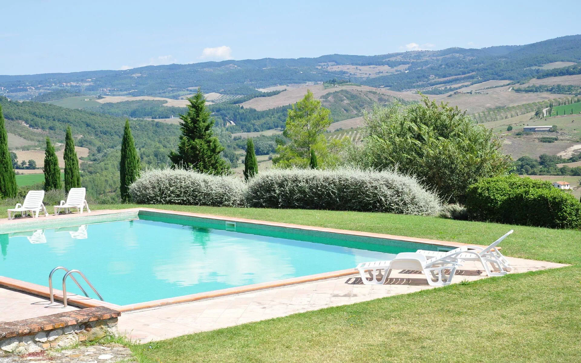L’ ampia piscina si trova a pochi metri dal casale ed ha una bella veduta sulla campagna circostante.