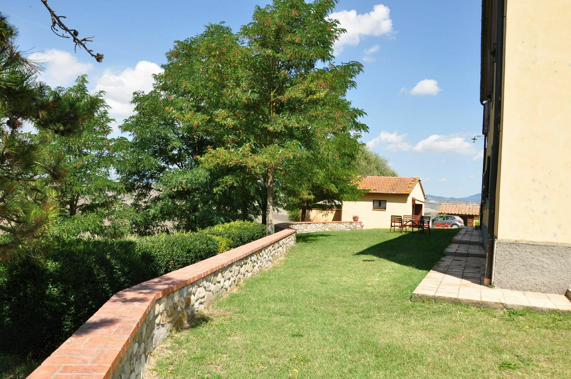 Le Querce ha un giardino molto ampio dove si trova la piscina.