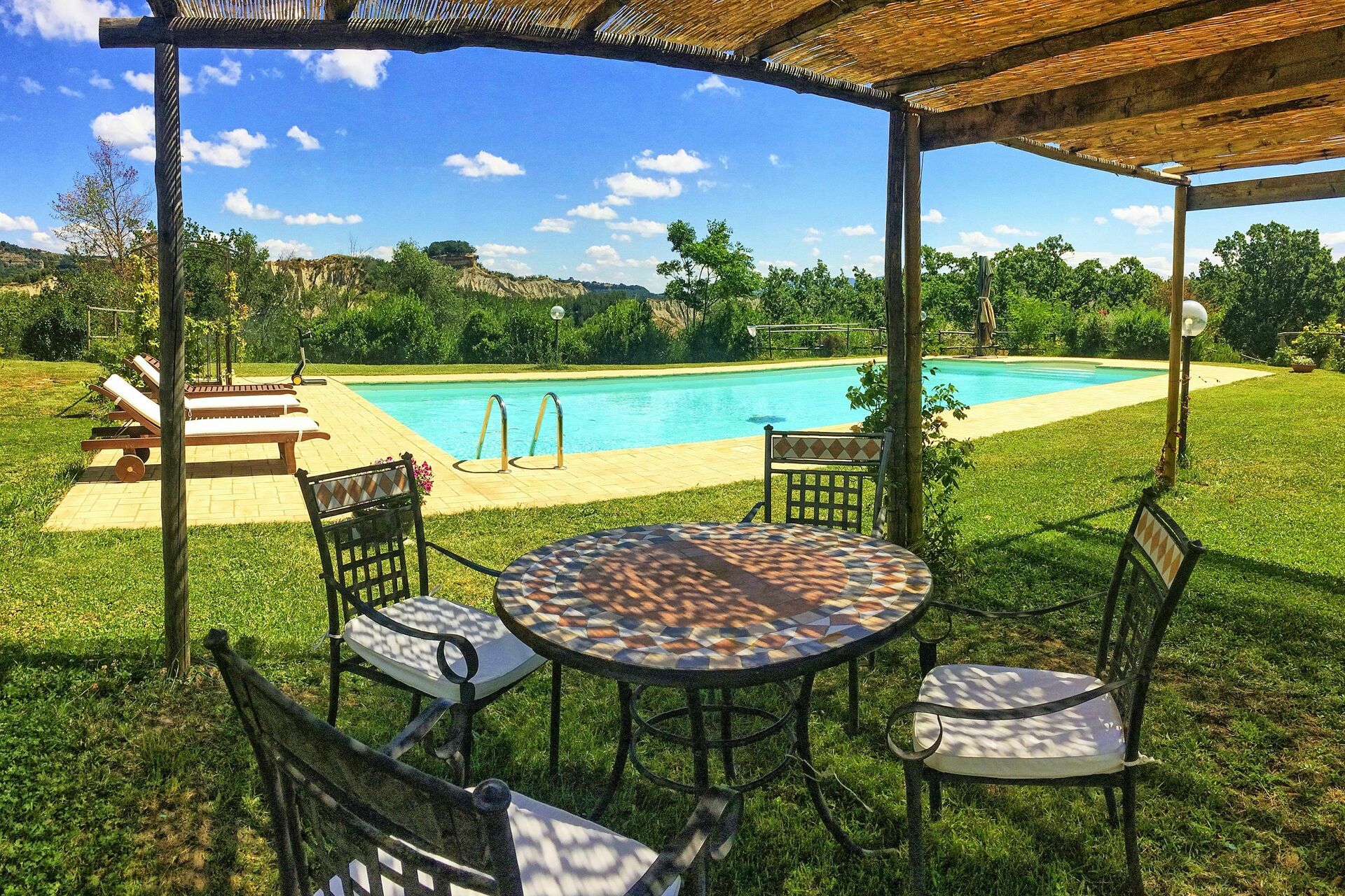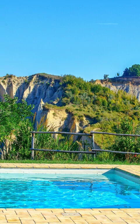 Panoramica villa per vacanze con 3 camere (7 posti letto) e piscina privata in affitto davanti allo storico e bellissimo paese di Civita di Bagnoregio, a nord del Lazio.