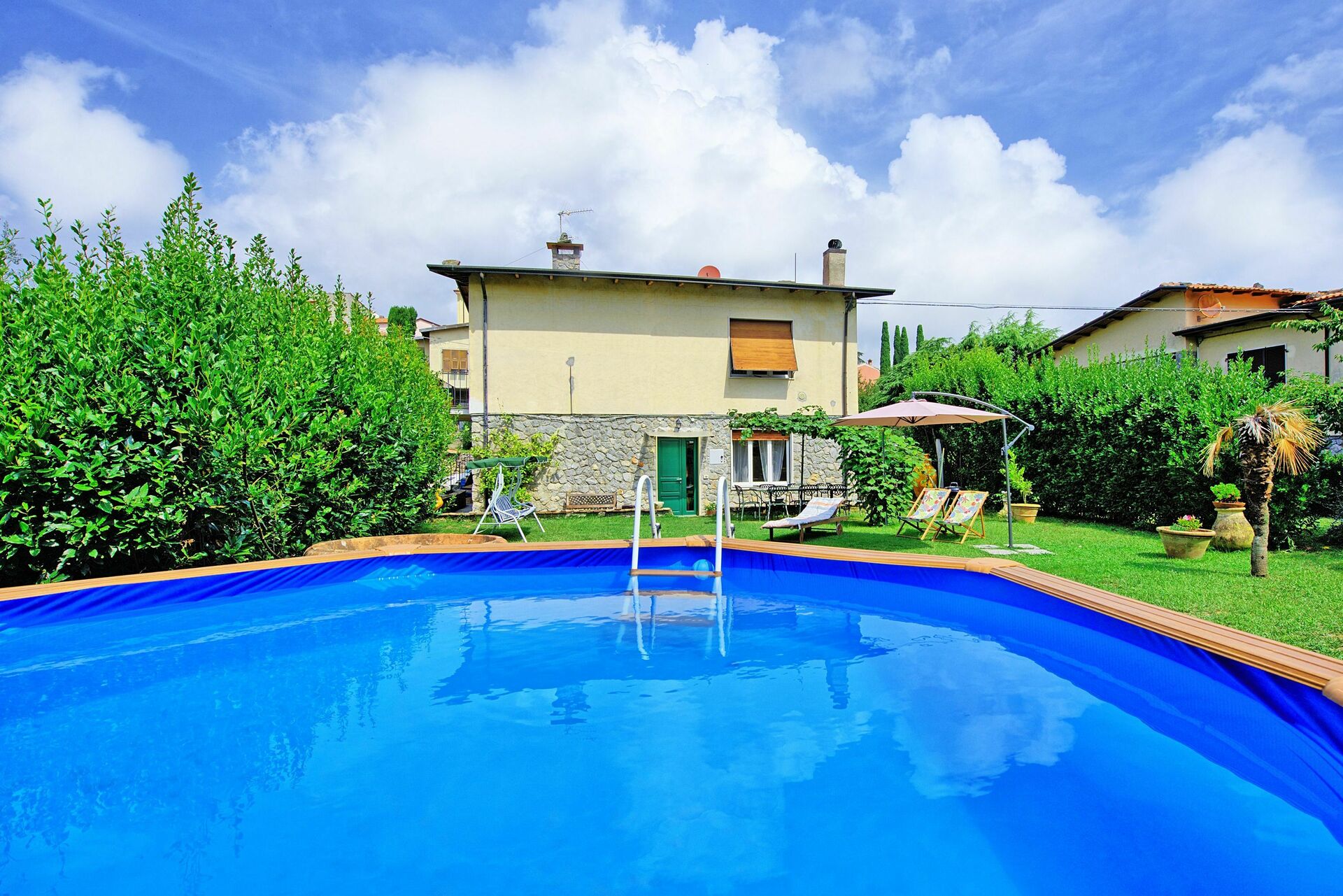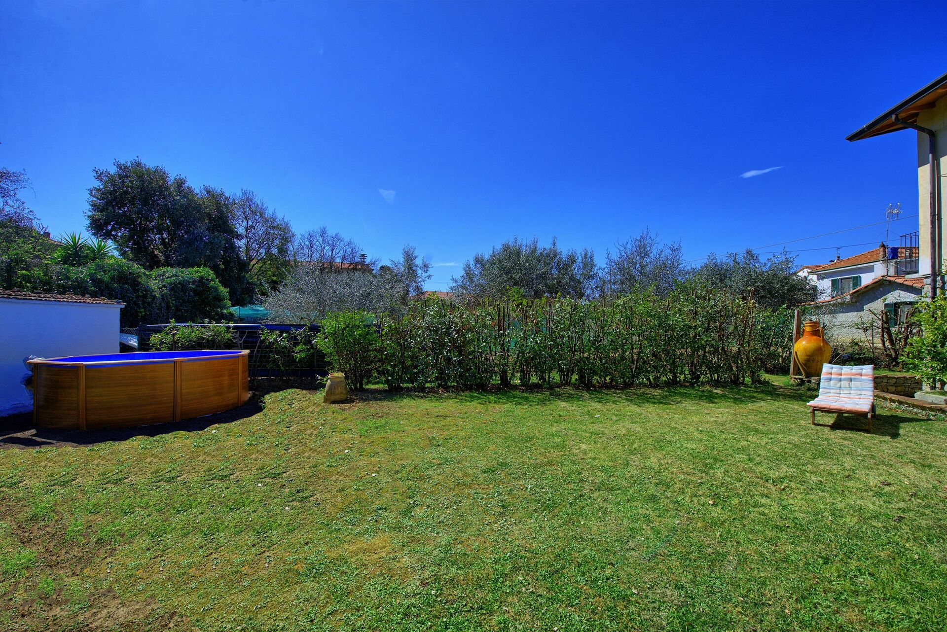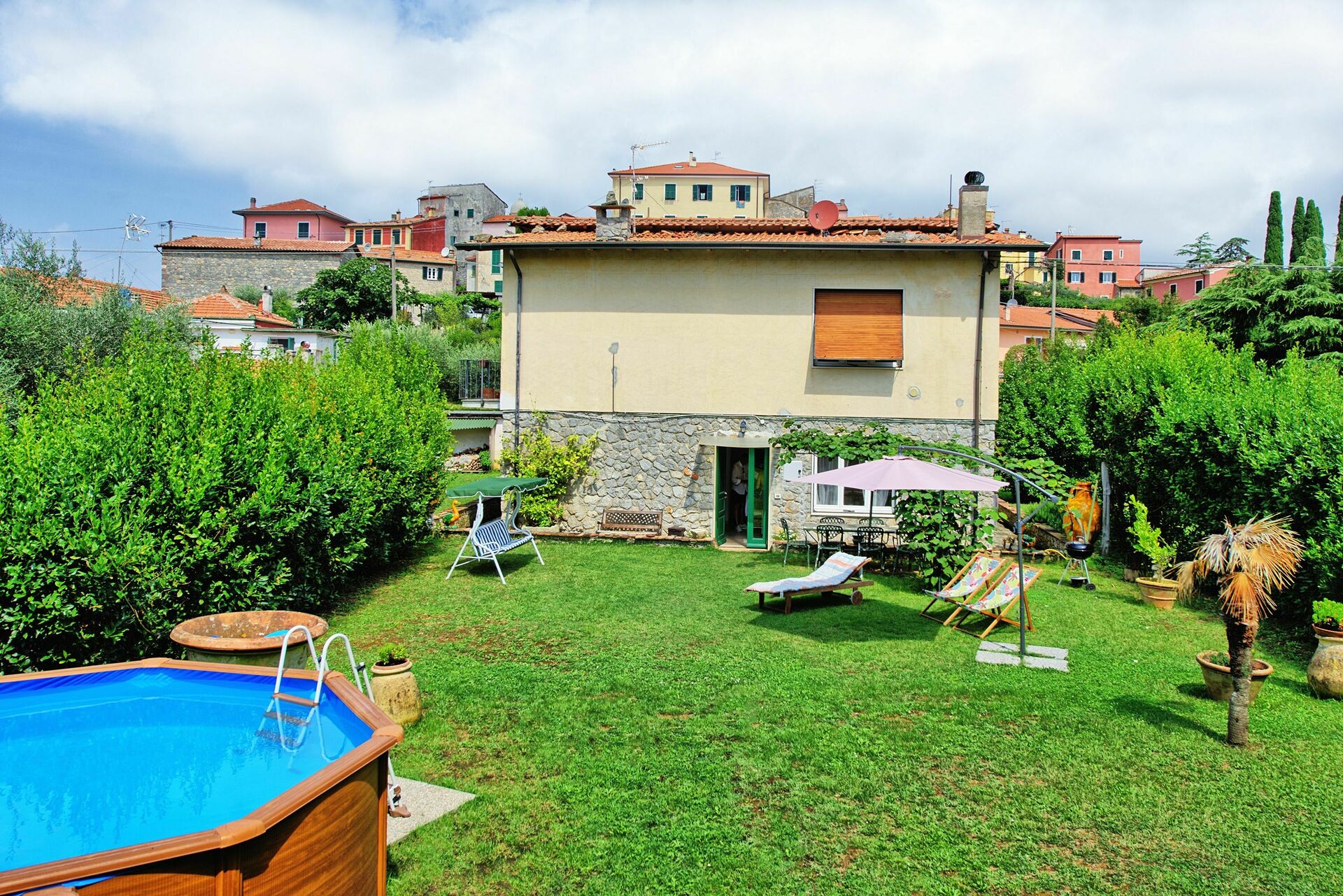 Pur trovandosi all'interno del paese questo appartamento in affitto dispone di un ampio giardino che comprende un pergolato davanti alla casa (attrezzato con tavolo e sedie), un barbecue ed una piscina privata (fuori terra) arredata con sdraio ed ombrellone dove poter trascorrere i caldi pomeriggi estivi. Alla fine del giardino inizia un bosco (appartenente sempre ai proprietari dell'appartamento) di querce e lecci.