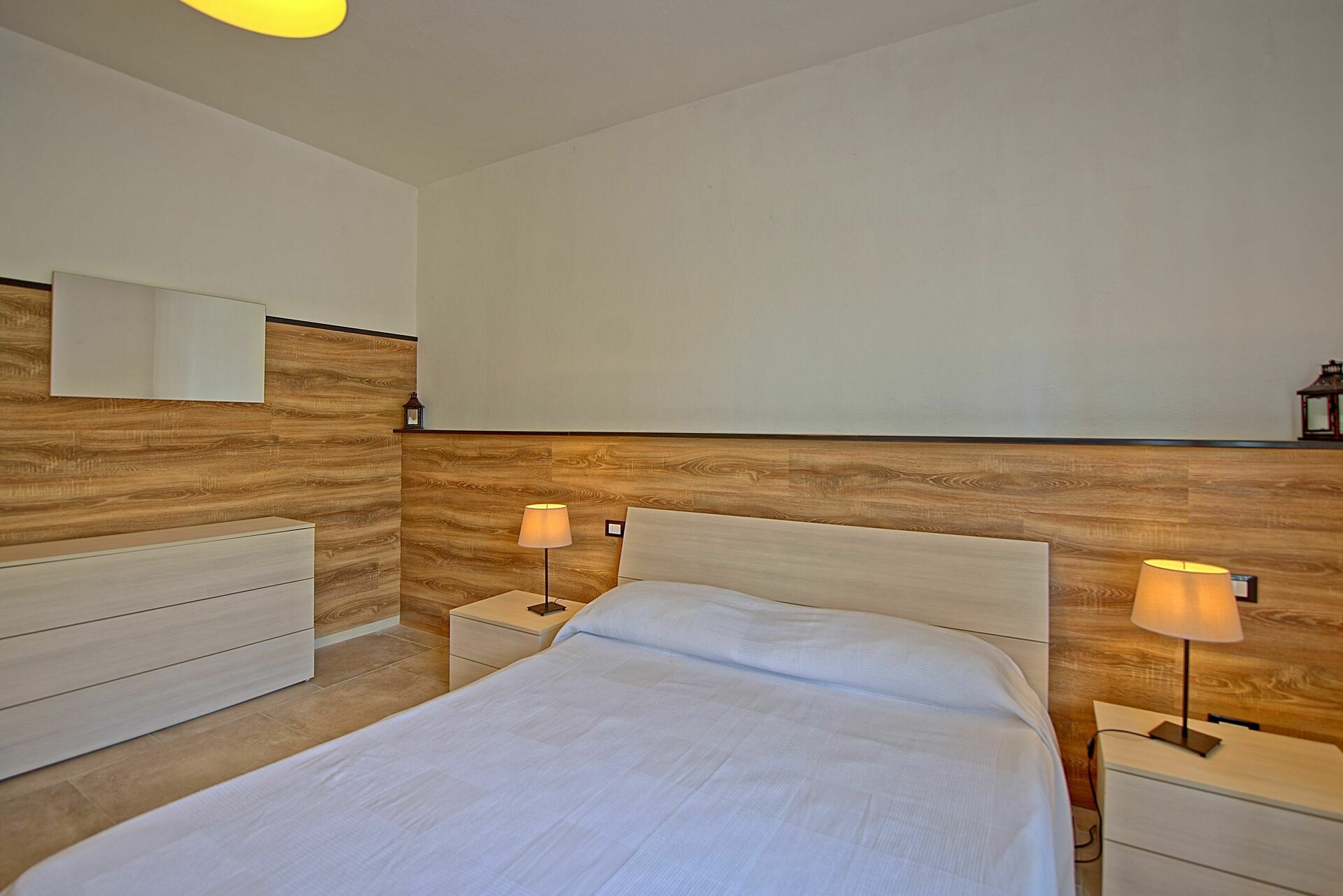 Piano terreno: ingresso su soggiorno (TV) con divano letto matrimoniale e zona pranzo con angolo cottura (forno, freezer, microonde, lavastoviglie, 4 fuochi), bagno con mezza vasca (senza bidet), camera matrimoniale (aria condizionata), disimpegno con lavatrice, bagno con doccia, camera matrimoniale (aria condizionata).