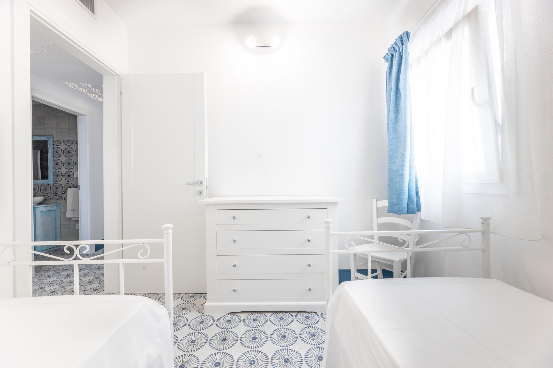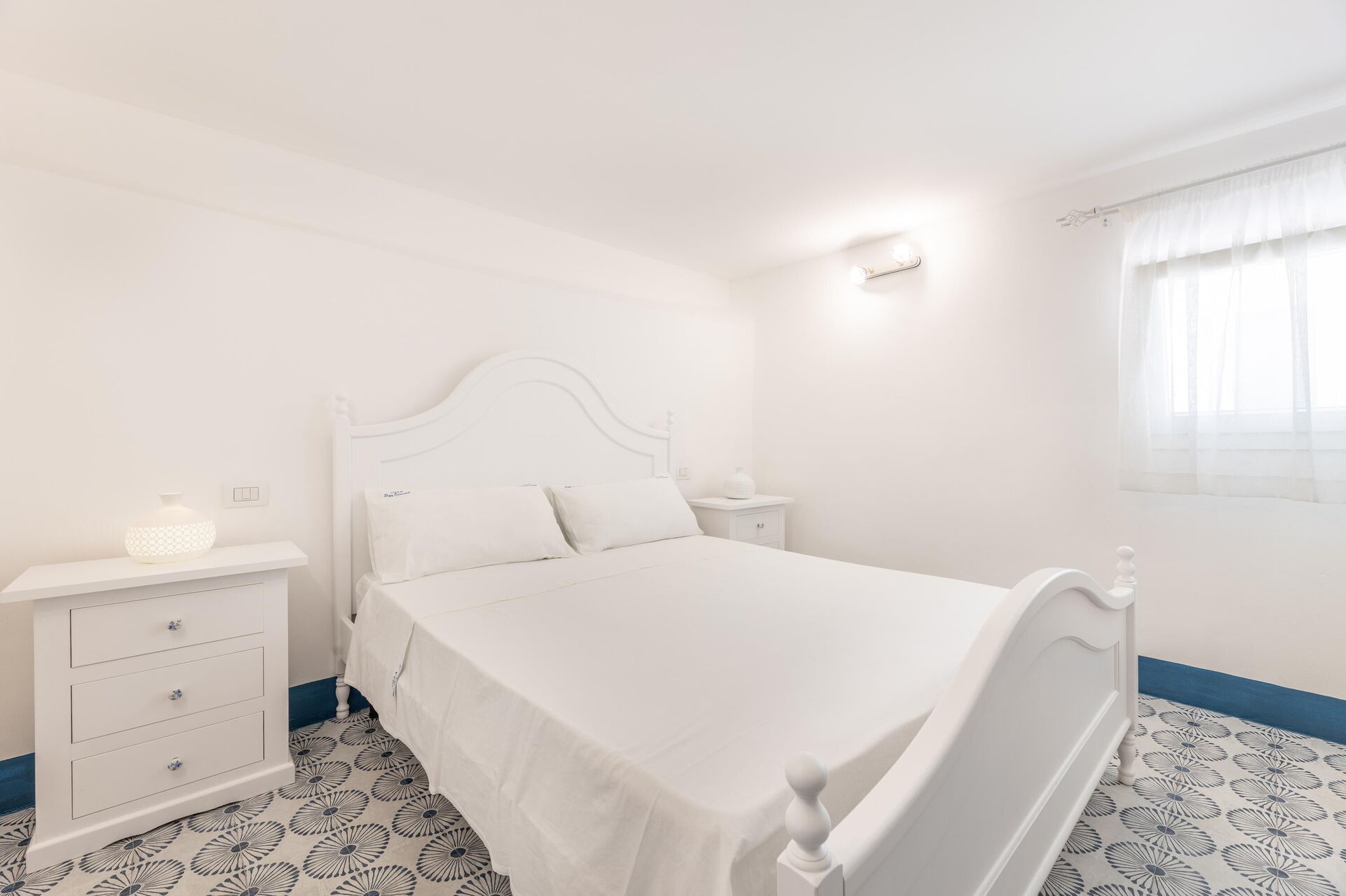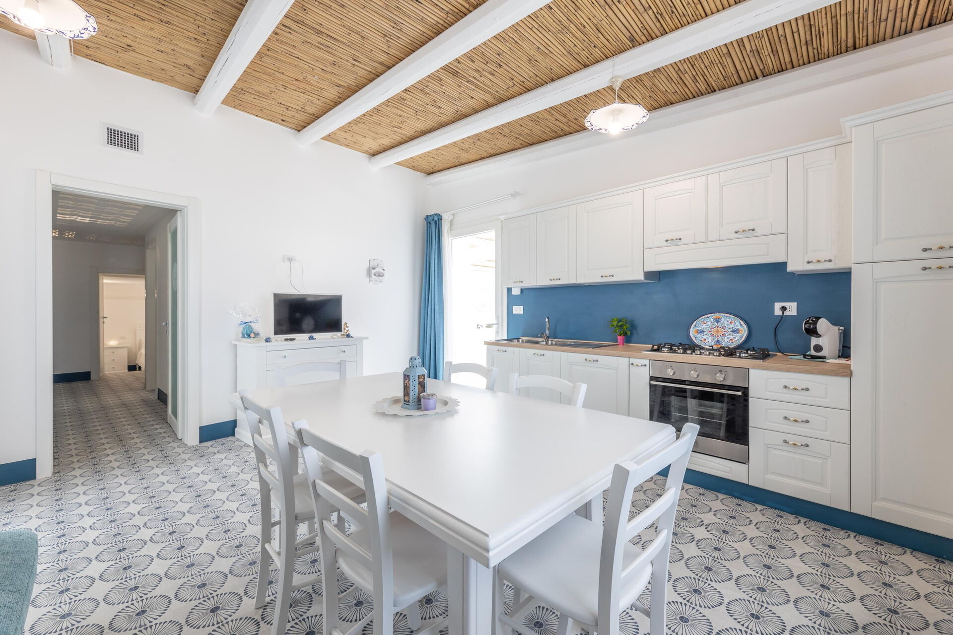 Piano terreno: soggiorno (aria condizionata, tv) con angolo cottura (piano cottura, forno, freezer, frigorifero, lavastoviglie, macchina da caffè) e zona pranzo con uscita sulla veranda, 2 camere matrimoniali (aria condizionata, zanzariera), 3 bagni con doccia, camera con 2 letti singoli (aria condizionata, zanzariera).