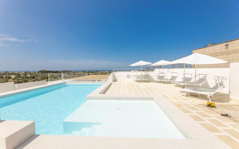 Questa esclusiva villa per vacanze in Puglia ha un design contemporaneo e gode di una scenografica posizione panoramica con vista mozzafiato sul mare, ammirabile sia dalle ampie terrazze sia dalla piscina (riservata all'uso esclusivo degli ospiti).