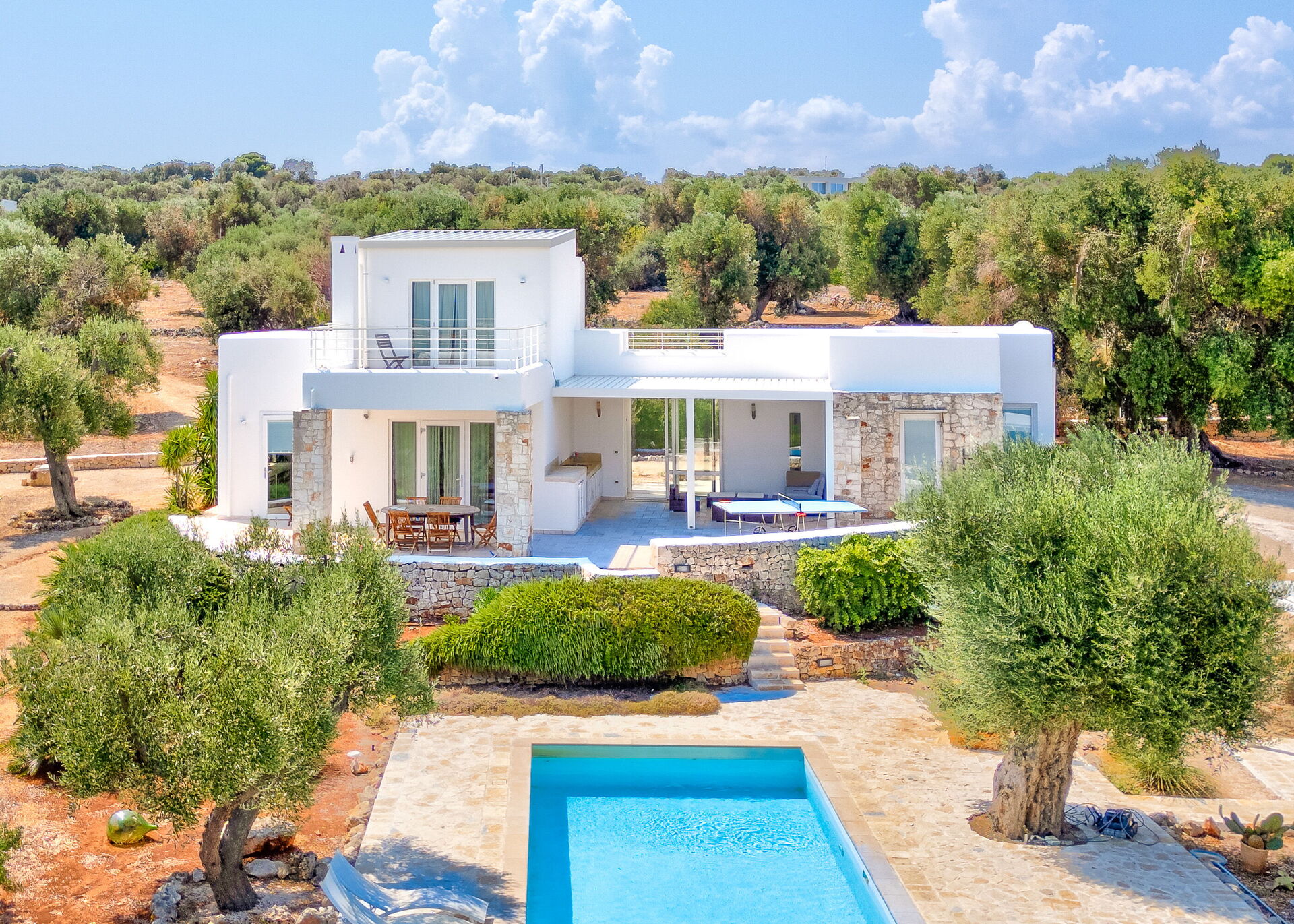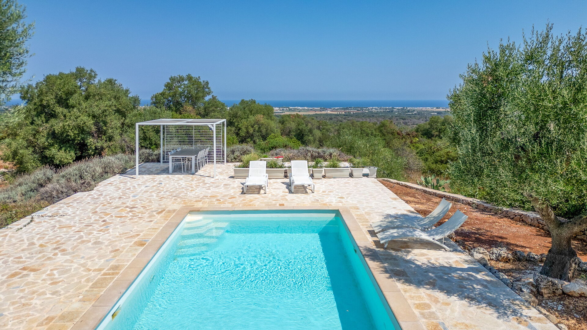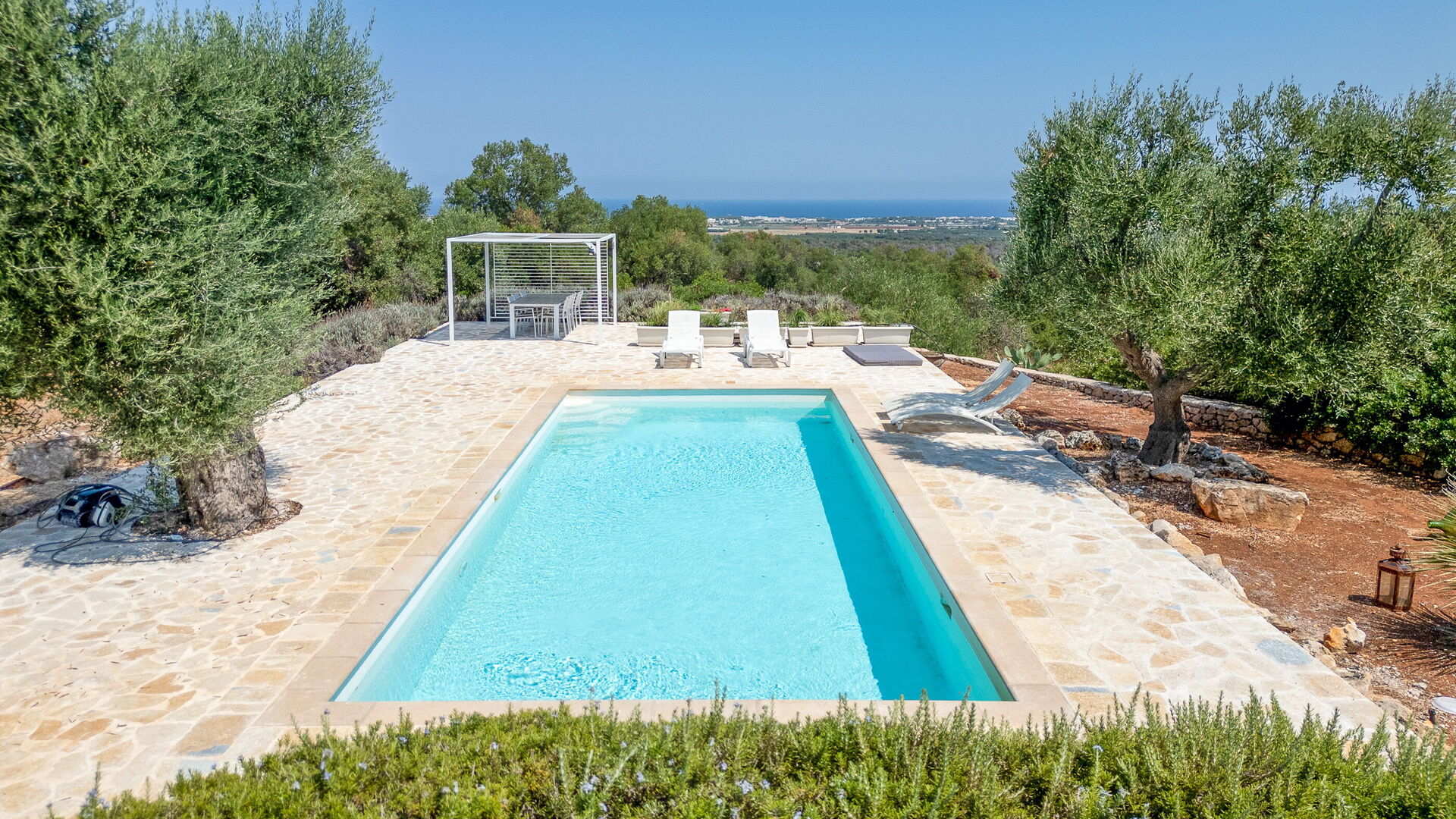 L’ampio giardino recintato presenta ulivi secolari e piante tipiche della macchia mediterranea. Al centro del giardino si trova la bella piscina riservata all' uso esclusivo degli ospiti. Grazie alla veranda a lato della villa e al pergolato in prossimità della piscina, potrete gustarvi ogni momento della giornata all’aria aperta grazie a zone pranzo e zone relax.