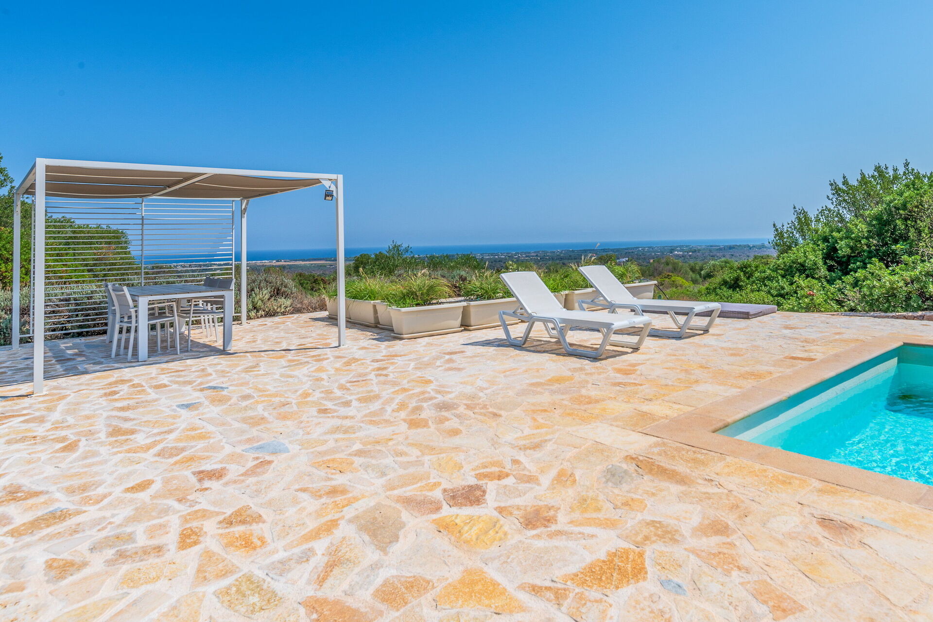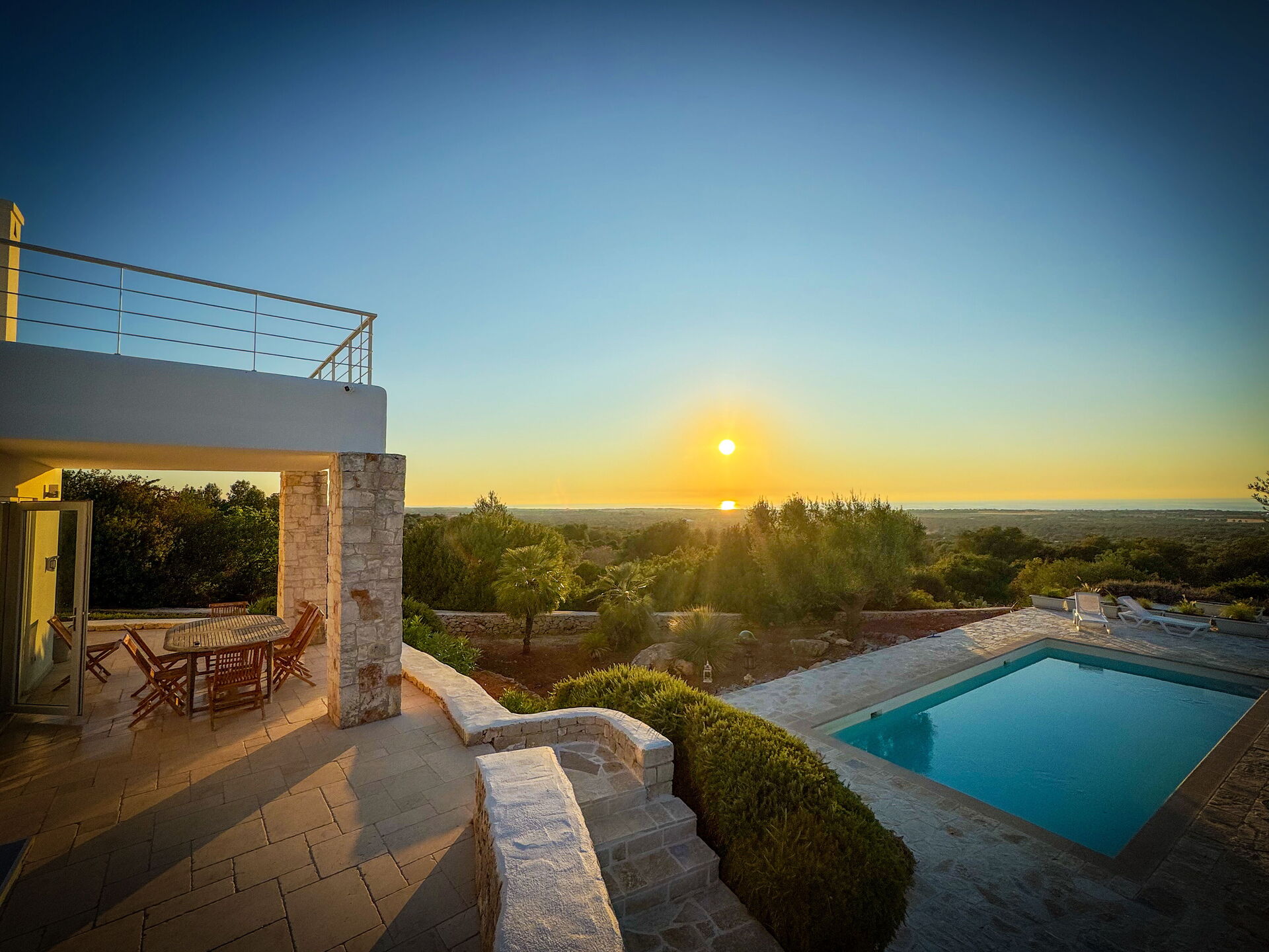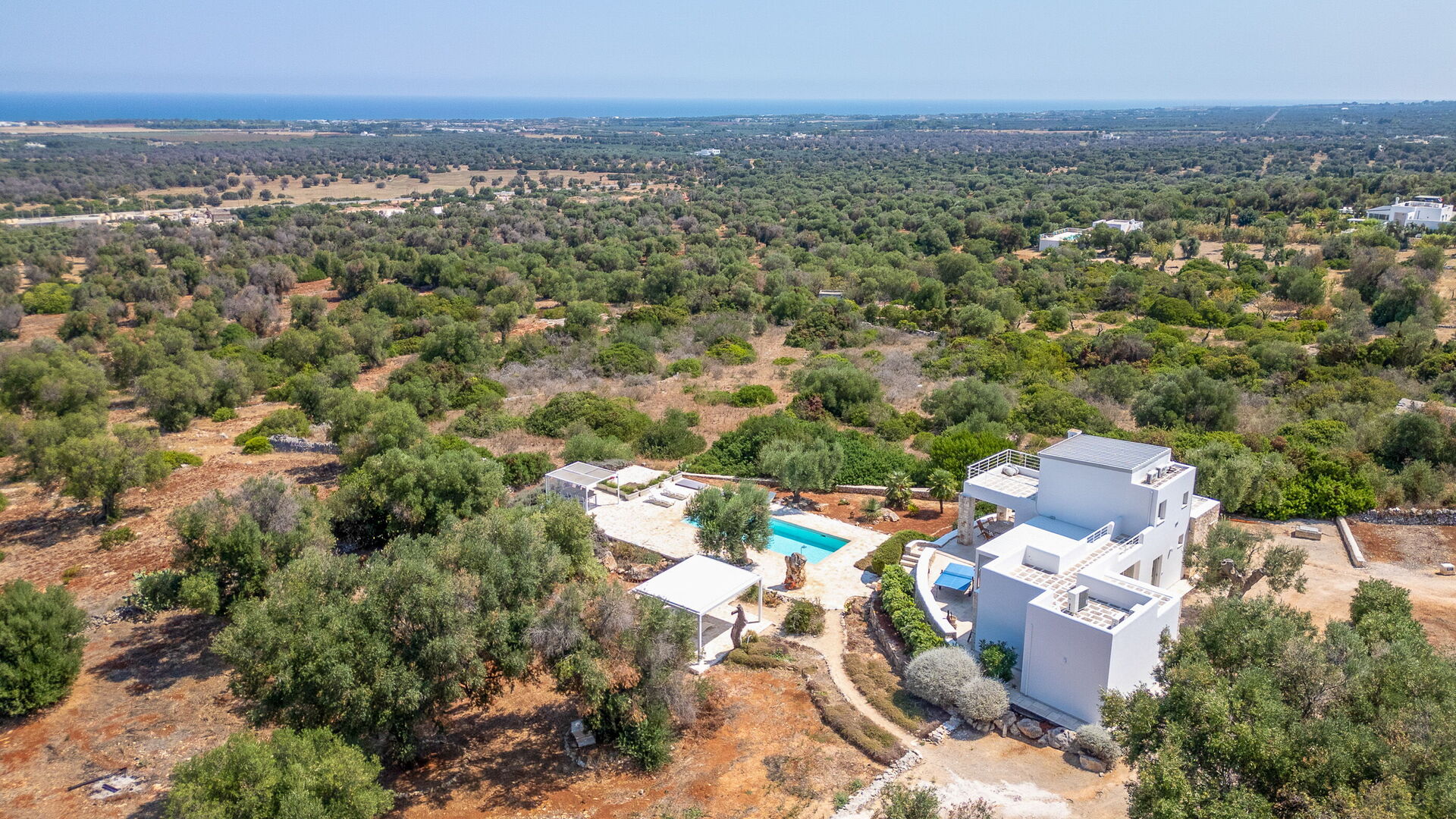 L’ampio giardino recintato presenta ulivi secolari e piante tipiche della macchia mediterranea. Al centro del giardino si trova la bella piscina riservata all' uso esclusivo degli ospiti. Grazie alla veranda a lato della villa e al pergolato in prossimità della piscina, potrete gustarvi ogni momento della giornata all’aria aperta grazie a zone pranzo e zone relax.