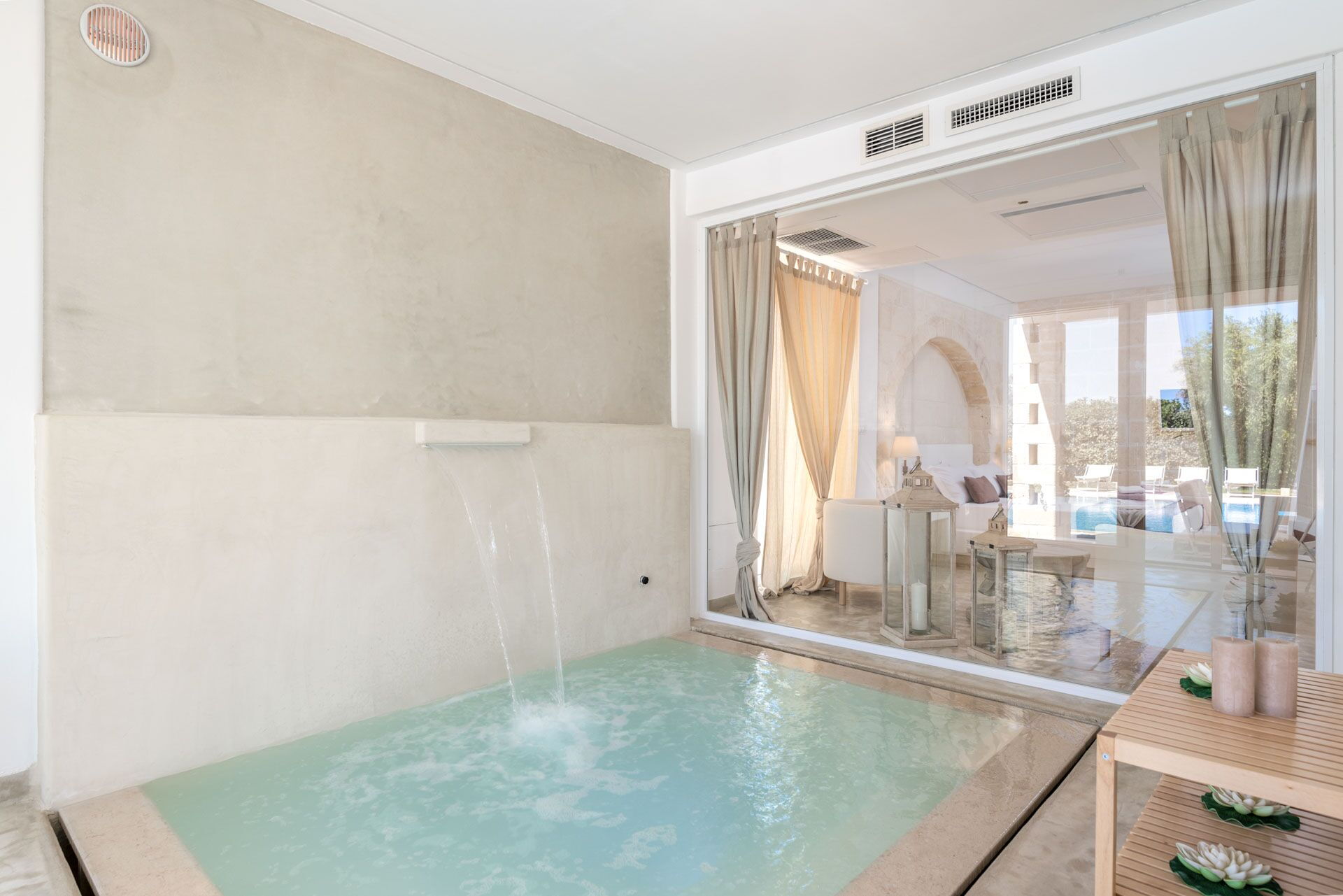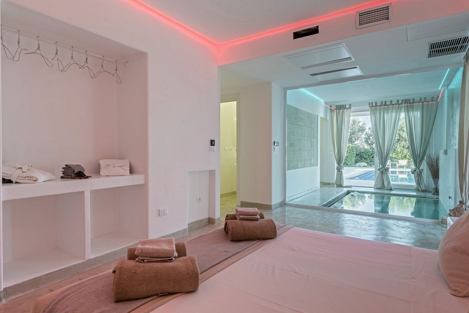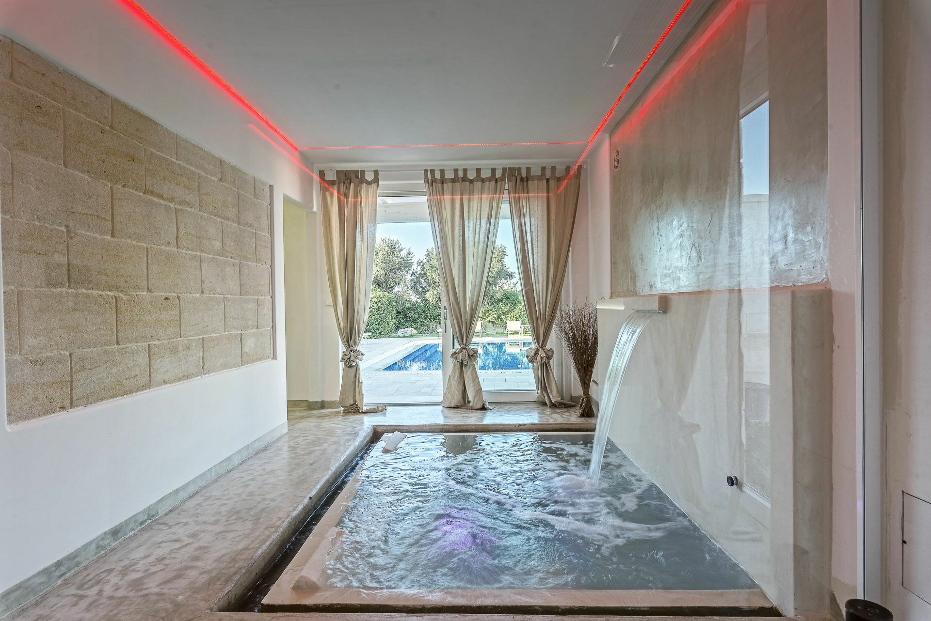 - piscina coperta (riscaldabile su richiesta) con getti idromassaggio e cascata d'acqua