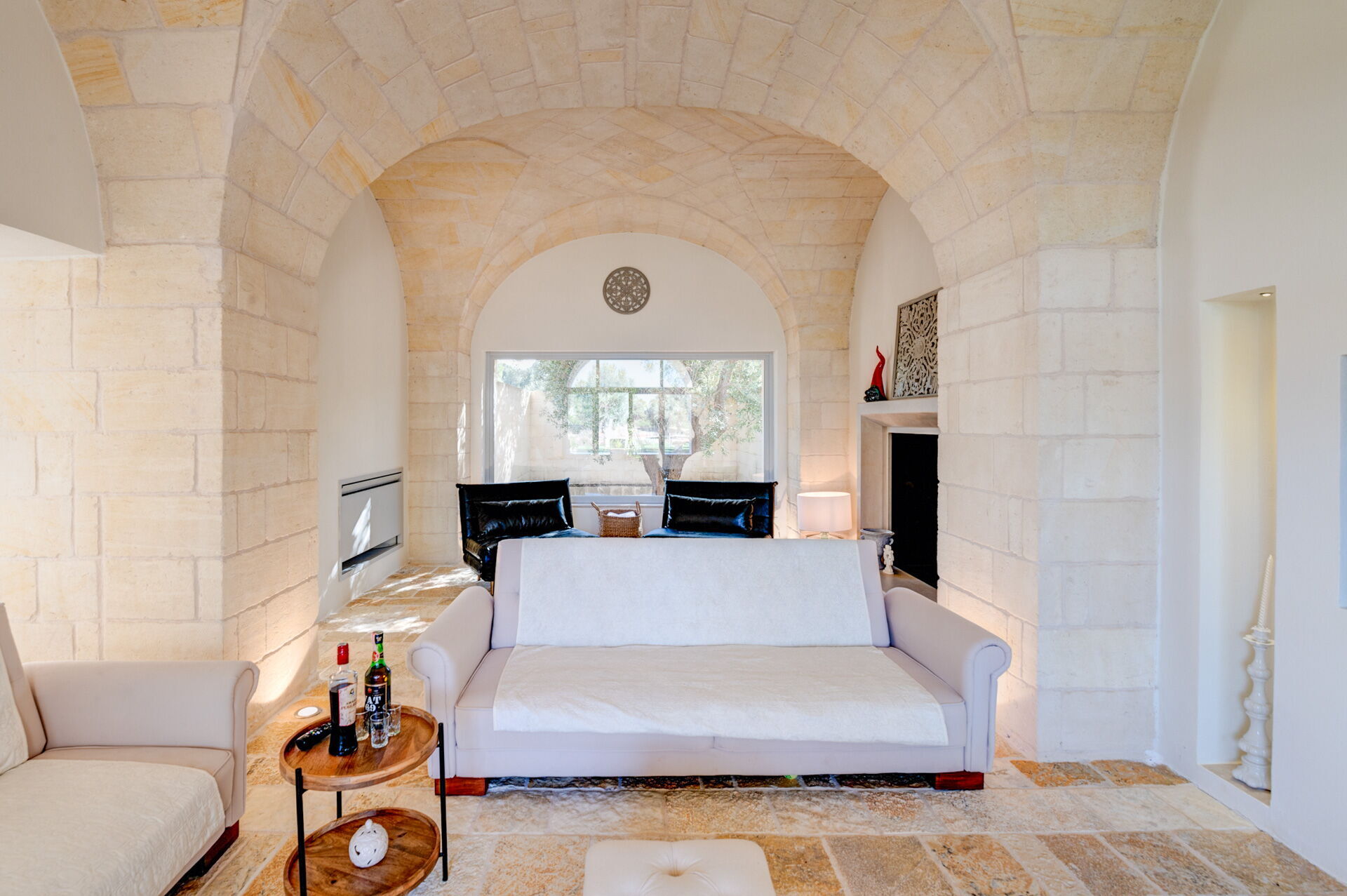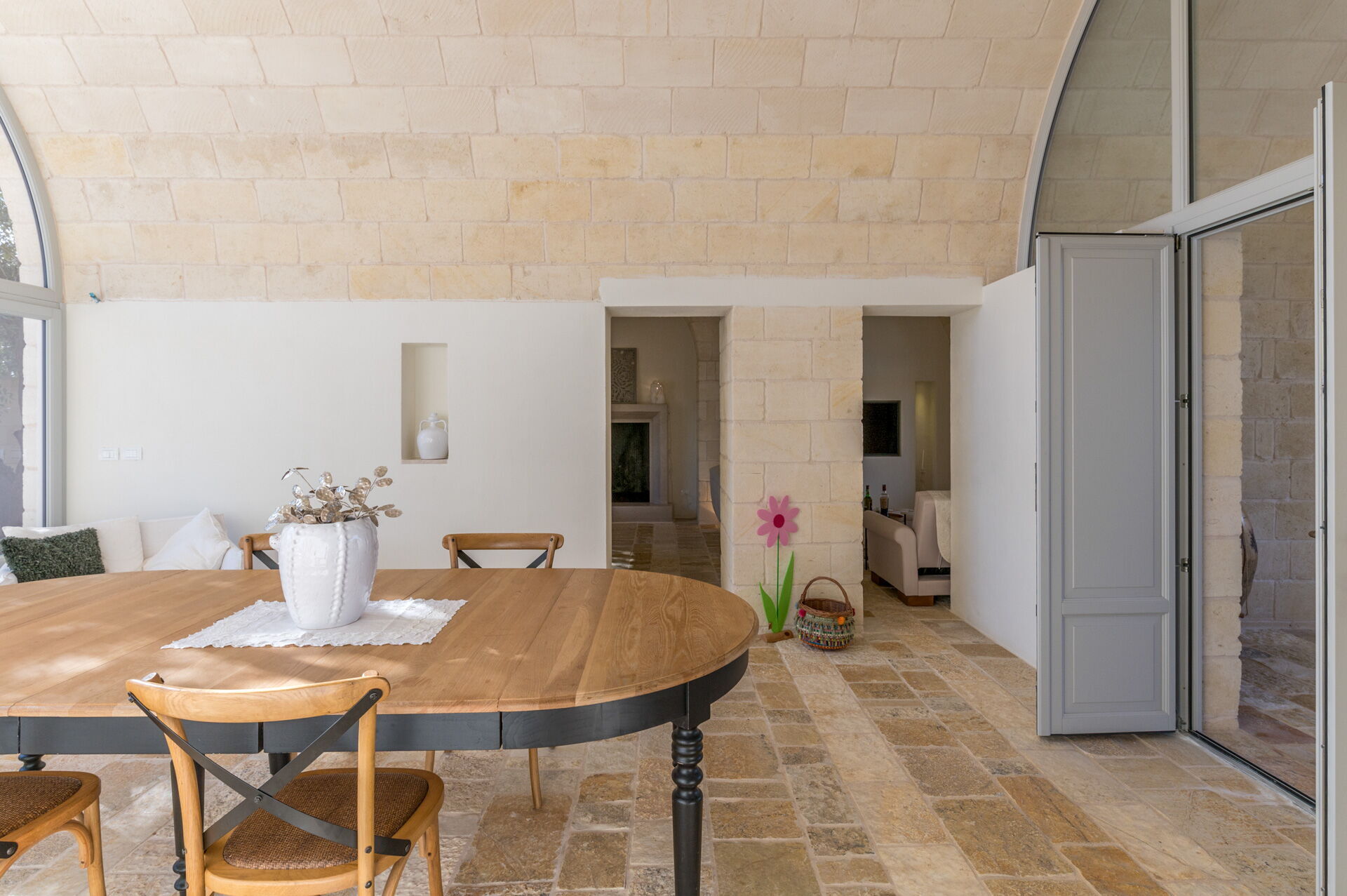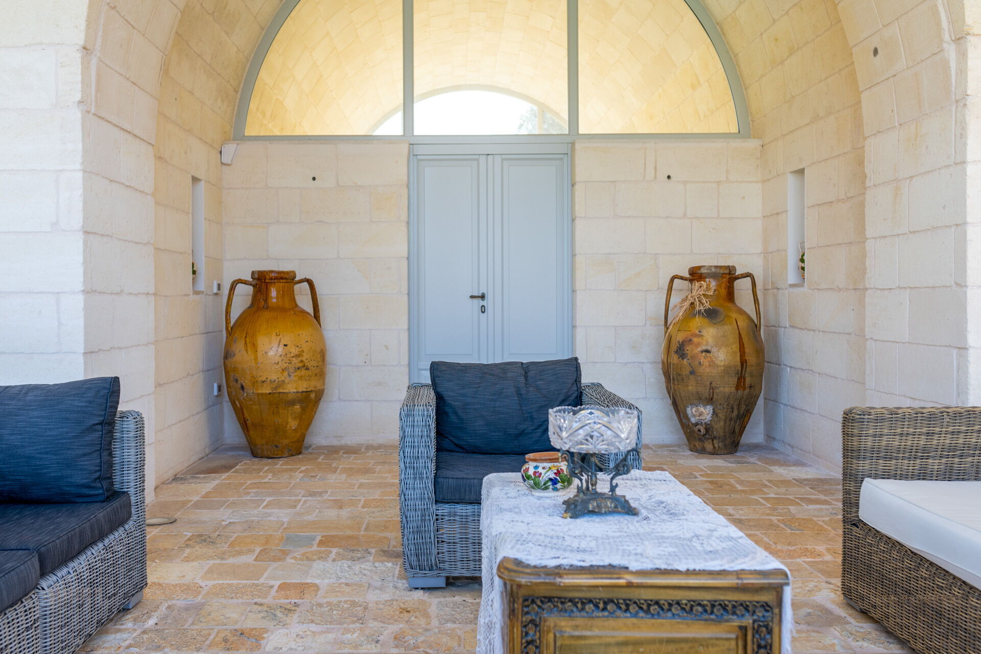 Internamente questa meravigliosa villa si distingue per i pregiati arredi e per la luminosità, dovuta alle grandi vetrate, in perfetto connubio con la tradizionale struttura architettonica salentina (soffitti a volta, pareti a pietra e mura bianche).