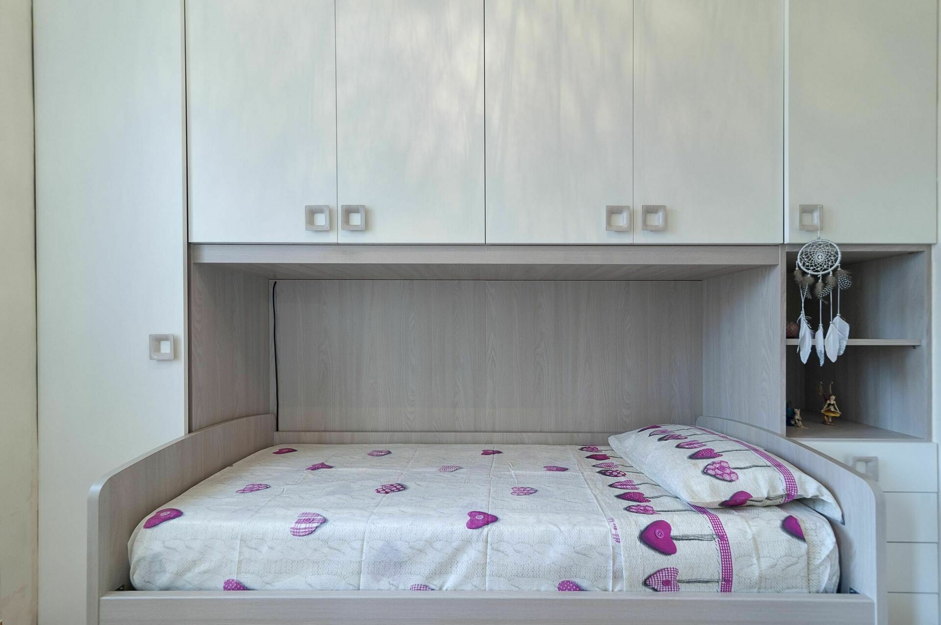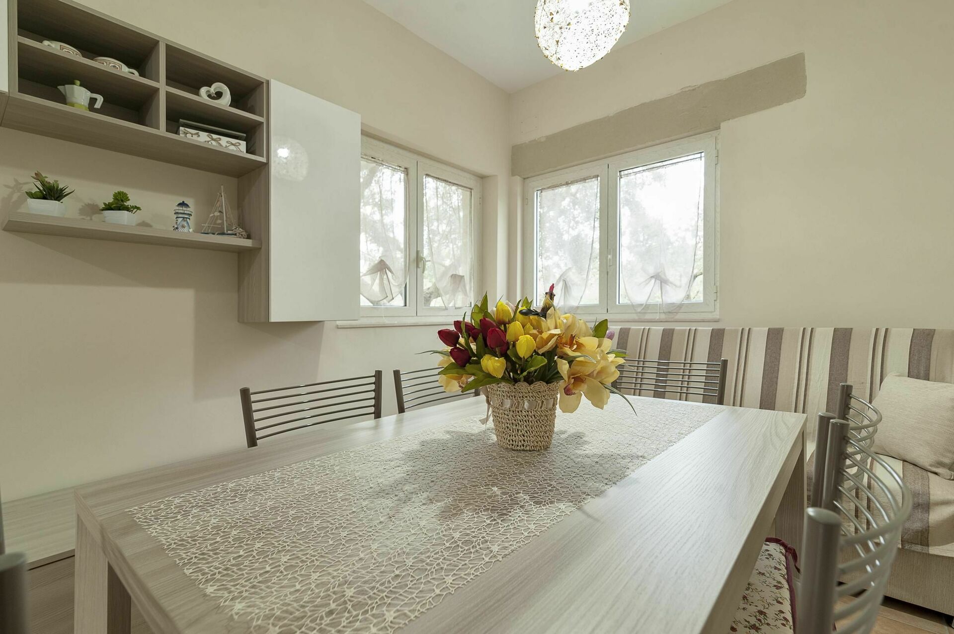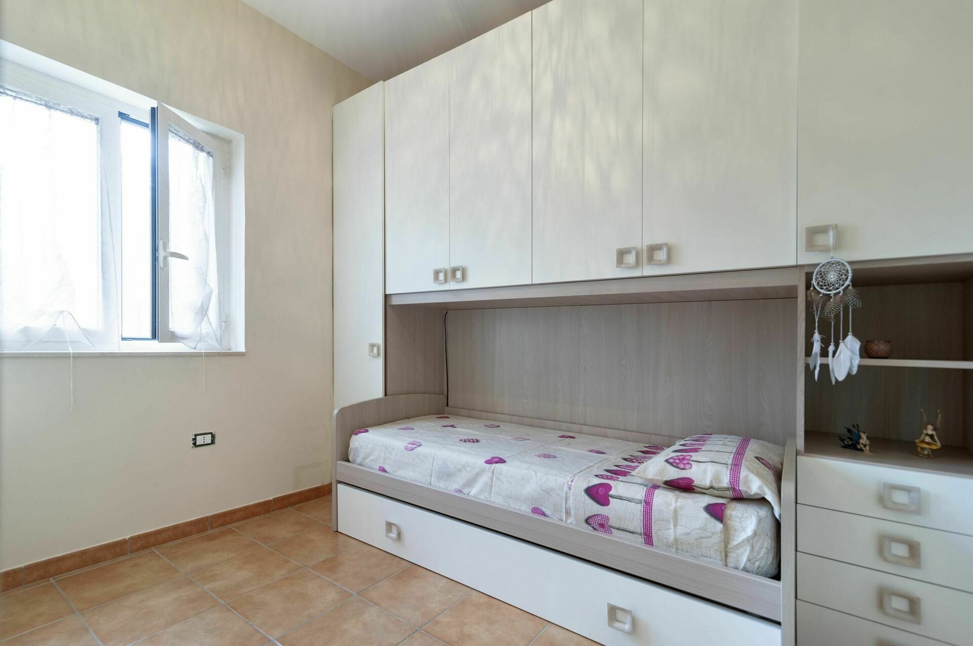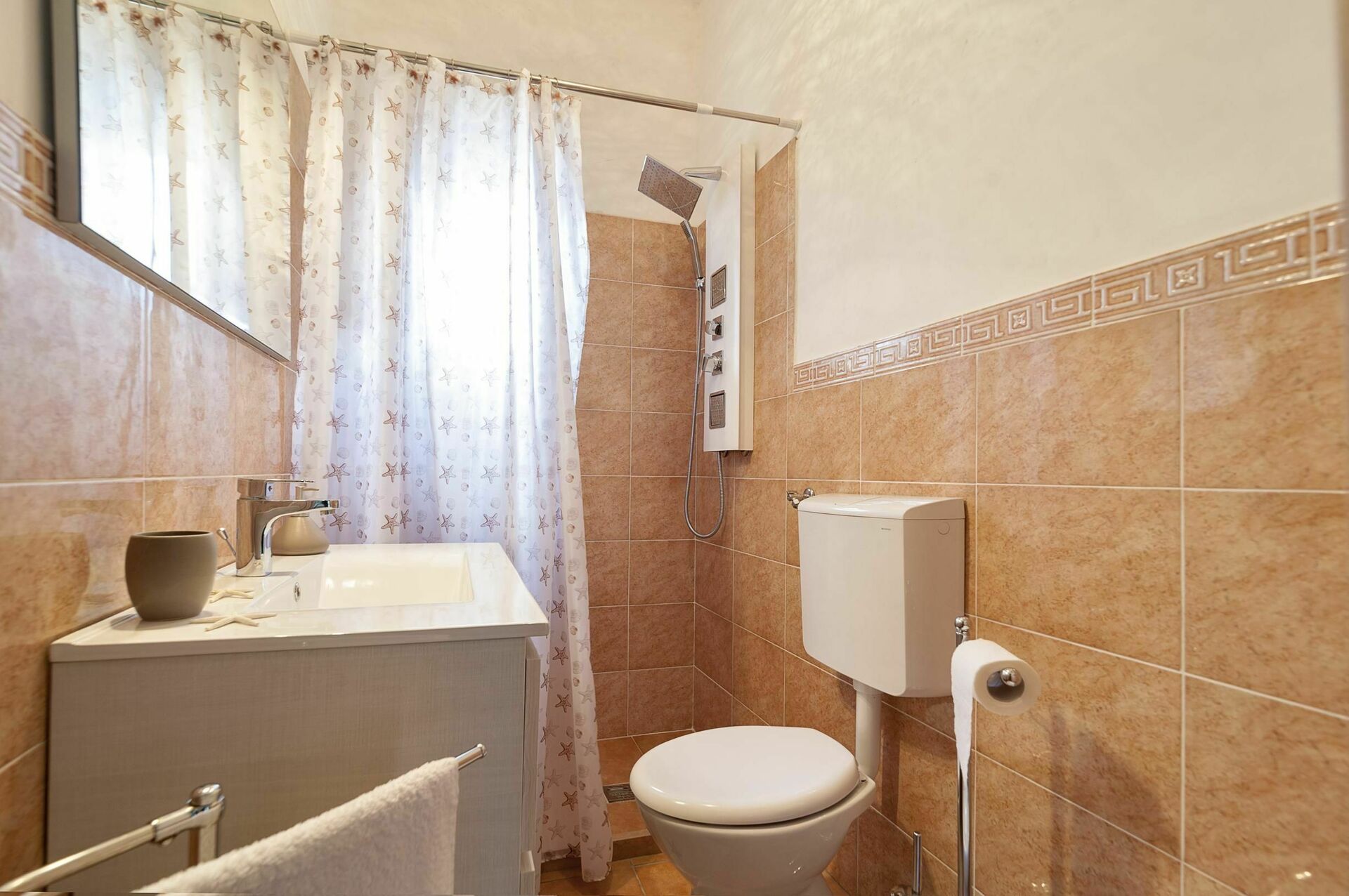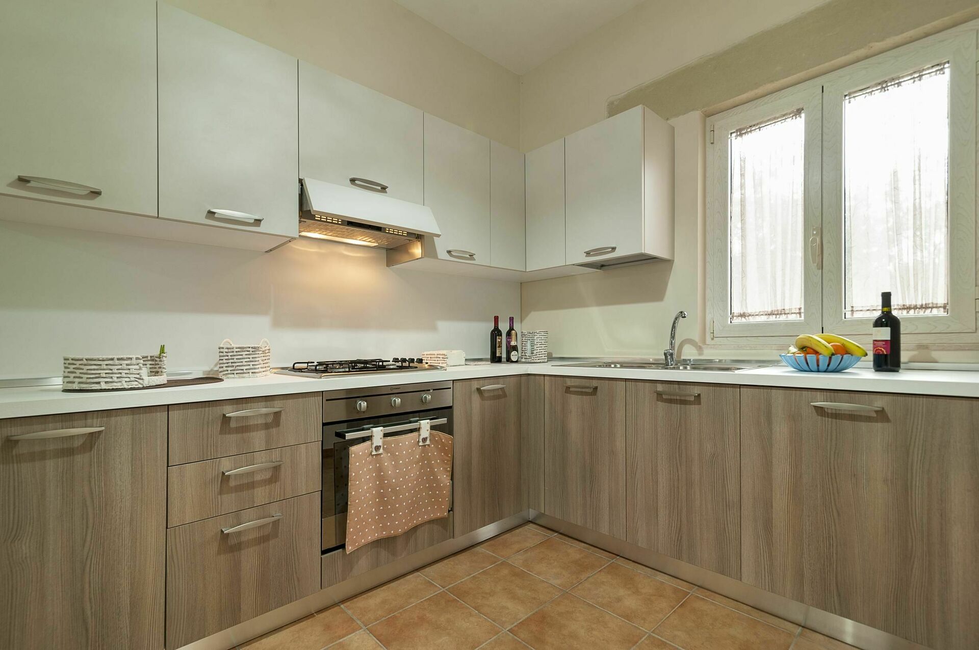 Piano terreno: soggiorno con 1 divano letto singolo e zona pranzo, cucina (lavastoviglie, forno, freezer, microonde), 1 camera matrimoniale, 1 camera con 2 letti singoli, 1 bagno con doccia.