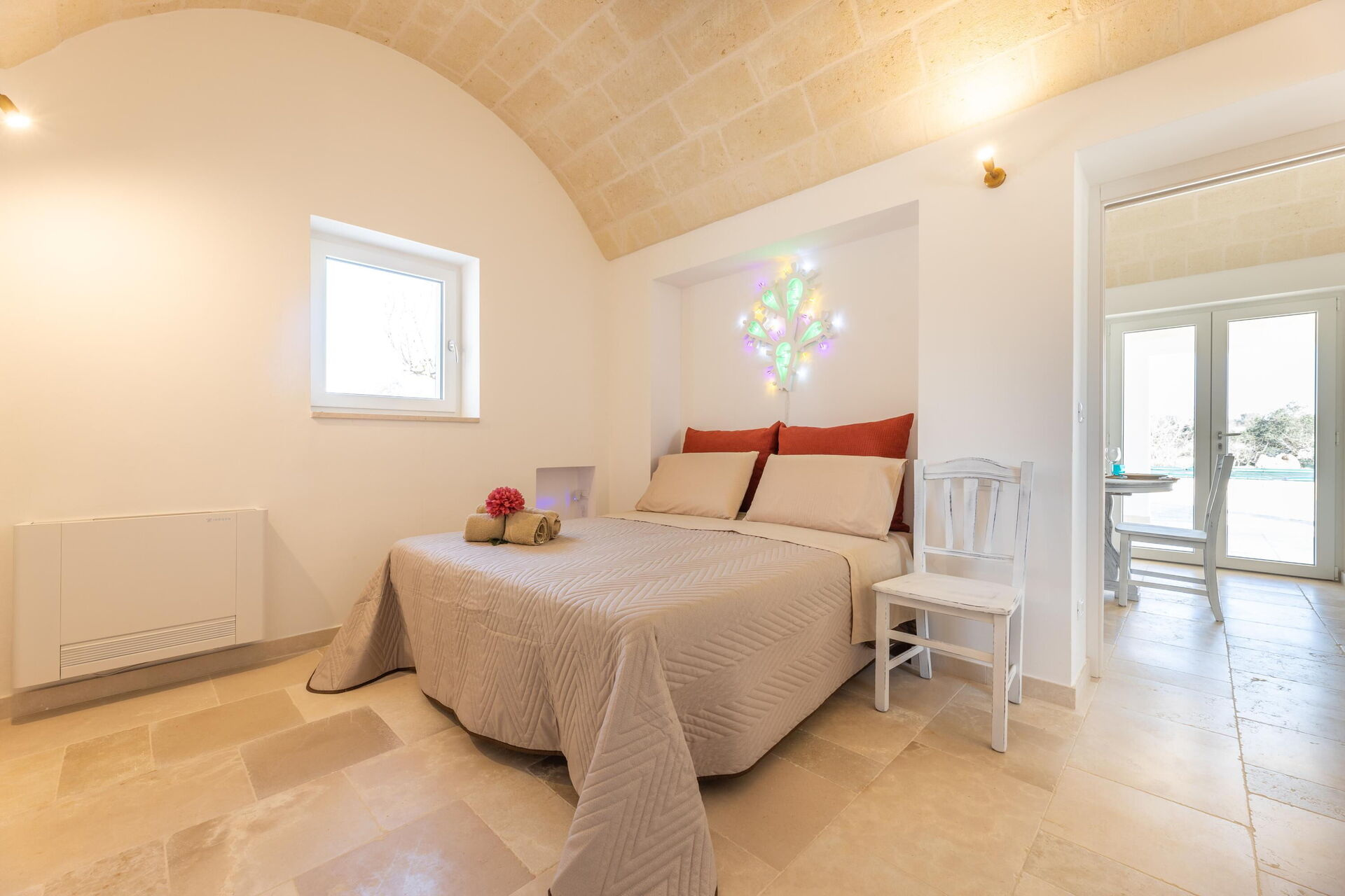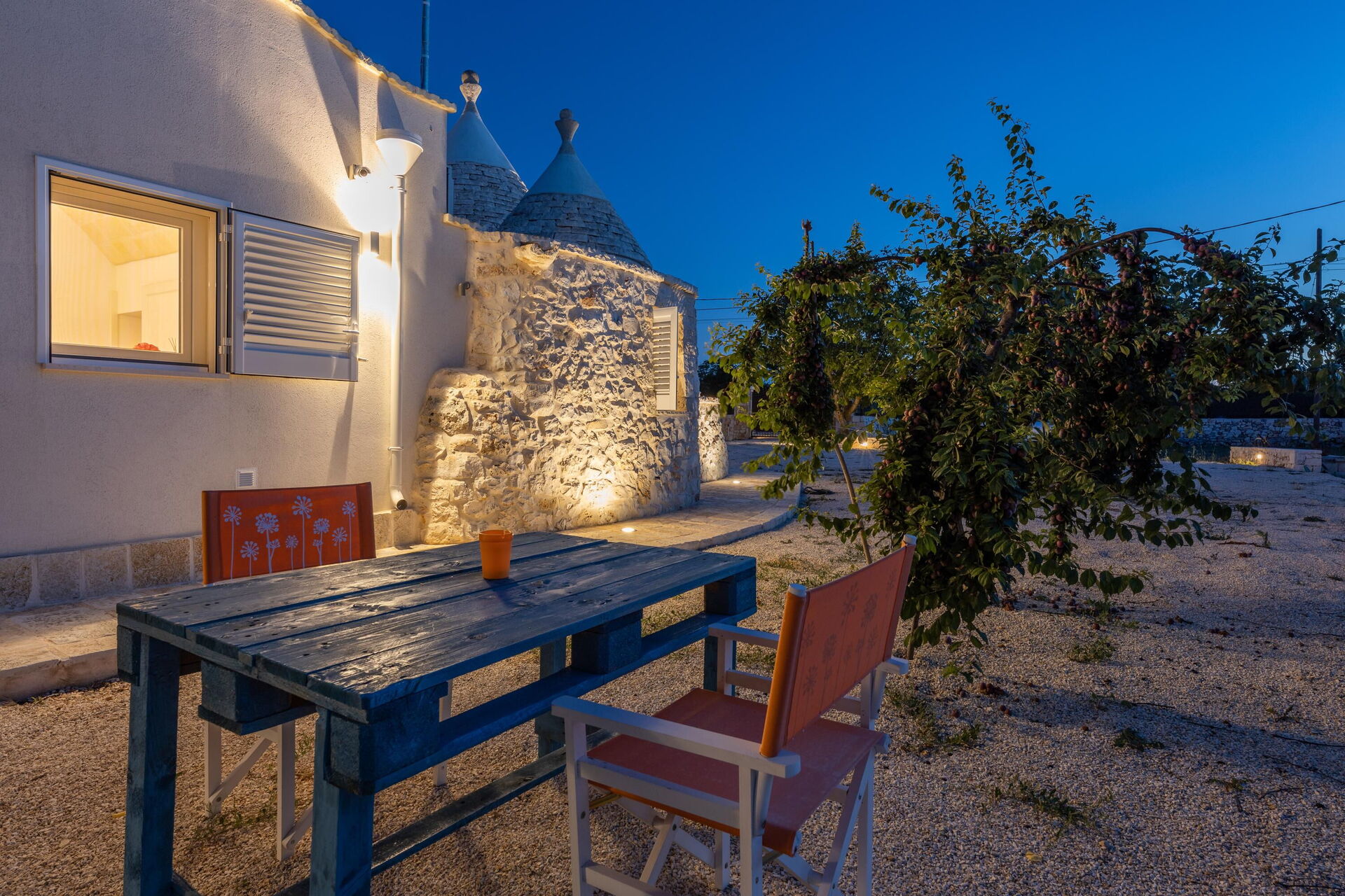 Recentemente ristrutturata, la proprietà si compone di una lamia con soffitti a botte e di un trullo con 4 coni. Sia l’interno che l’esterno della struttura risaltano per l’uso dei materiali tradizionali: la pietra, il tufo e il legno.