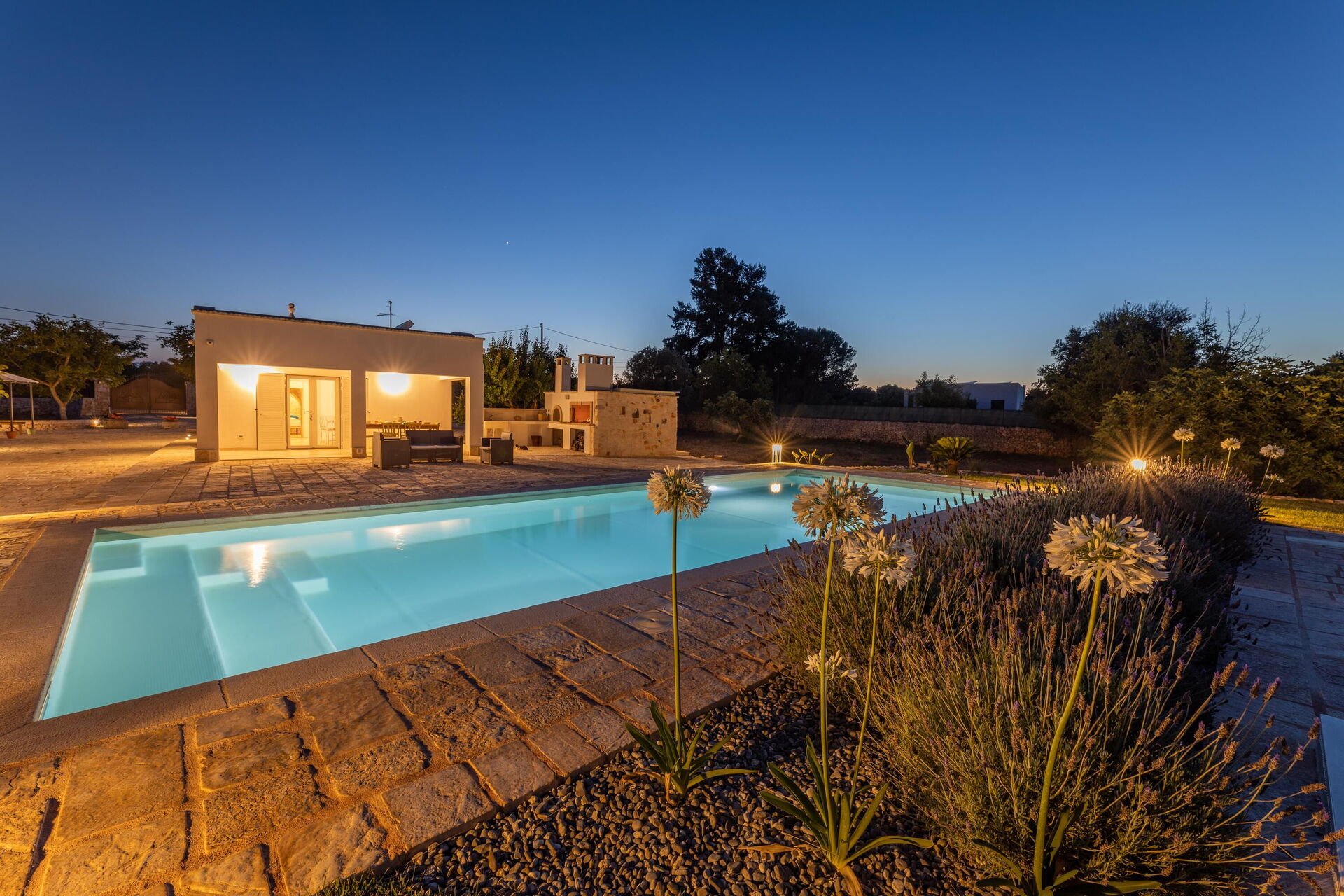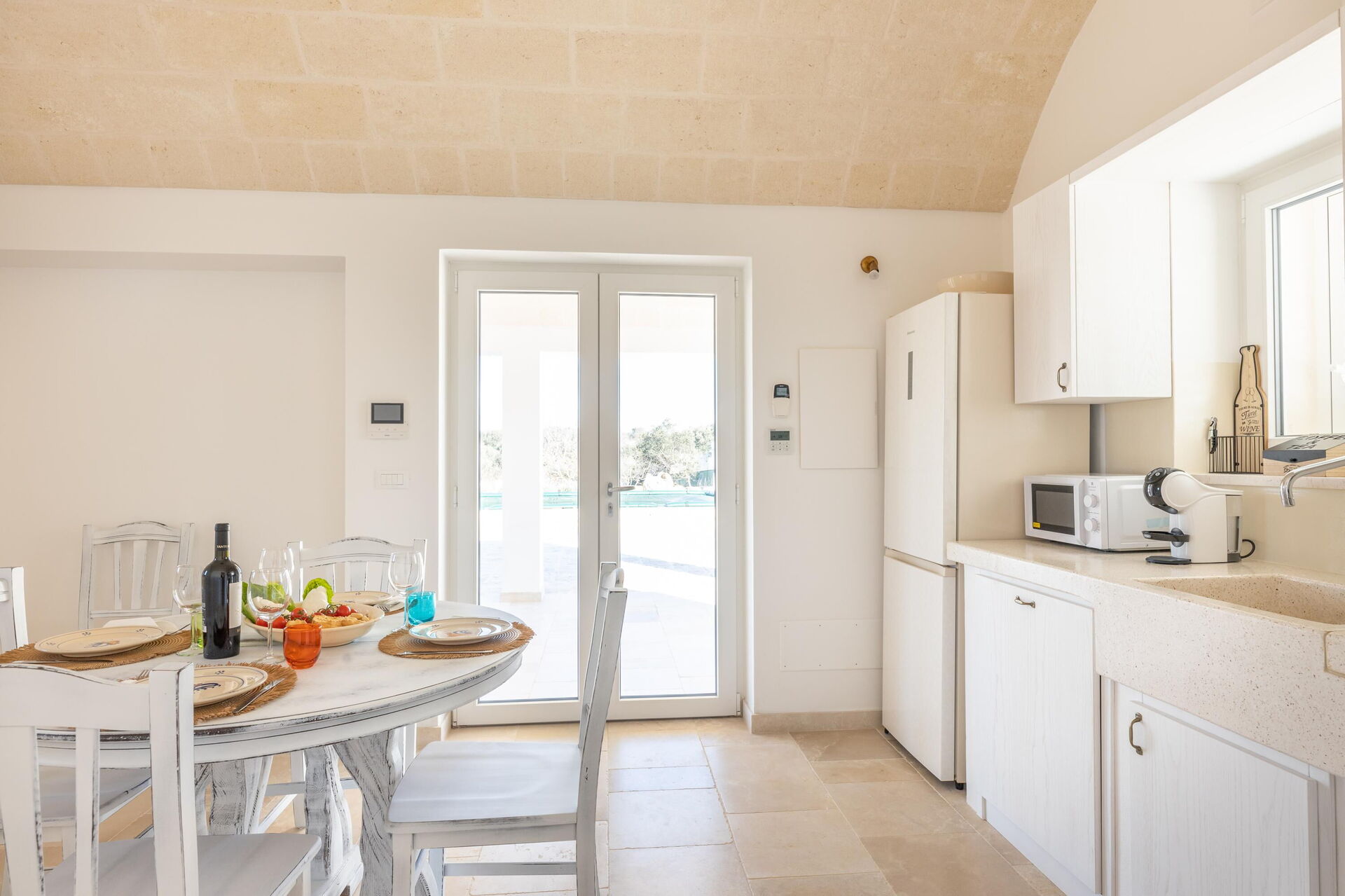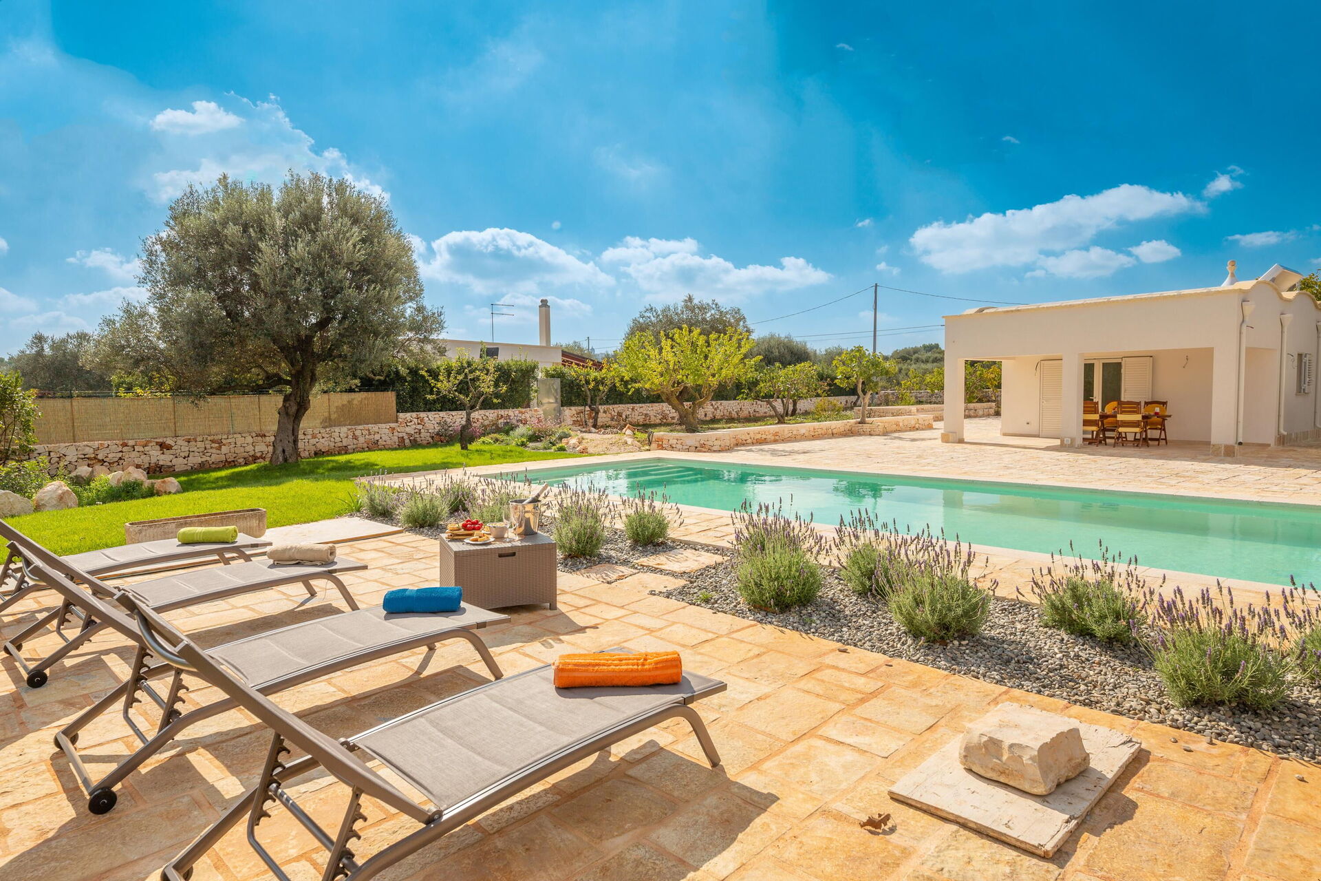 Immersa in un ampio giardino recintato di circa 4000 metri quadri, questa villa in affitto vi permetterà di trascorrere le calde giornate pugliesi all’aperto: rilassandovi sul bordo dell’elegante piscina privata con ingresso a scala romana; godendovi un appetitoso momento di convivialità con i vostri amici sotto alla veranda; passeggiando per il parco tra alberi e ulivi.