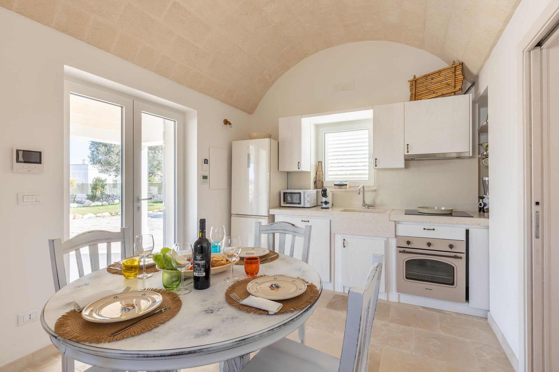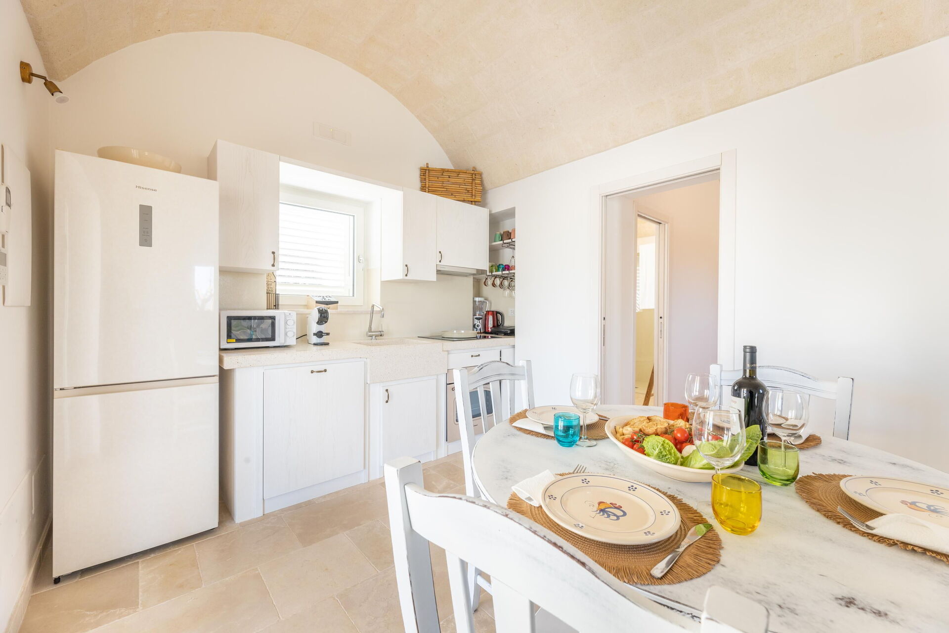 Piano terreno: ingresso su cucina (lavastoviglie, microonde, freezer e forno) e soggiorno con divano letto matrimoniale (disponibile su richiesta e a un costo extra), camera matrimoniale con bagno privato con doccia, ampia camera matrimoniale ricavata nel trullo, bagno con doccia.