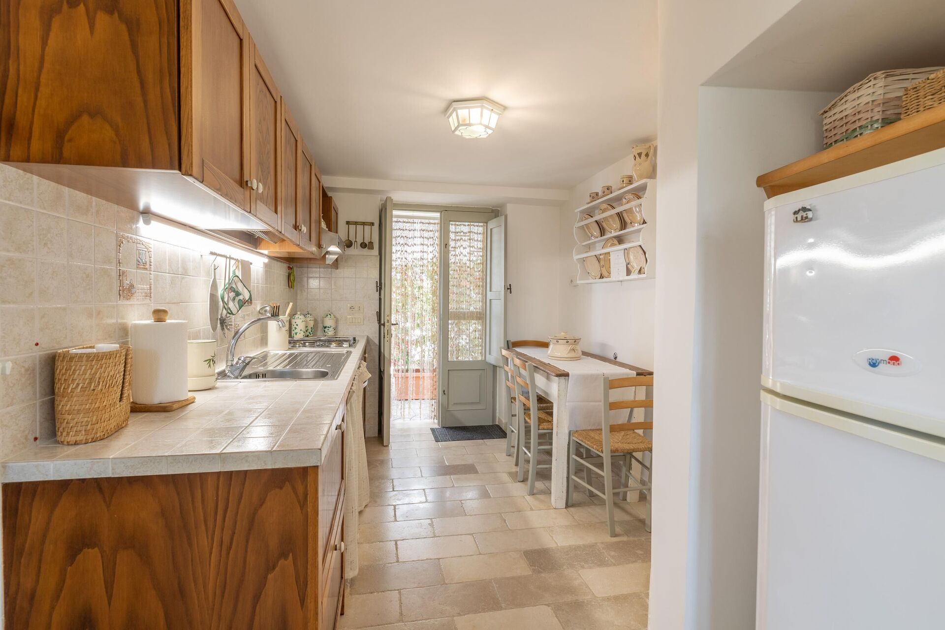 Piano rialzato: ingresso dalla veranda sulla cucina (freezer, forno), 2 camere matrimoniali, bagno con doccia.