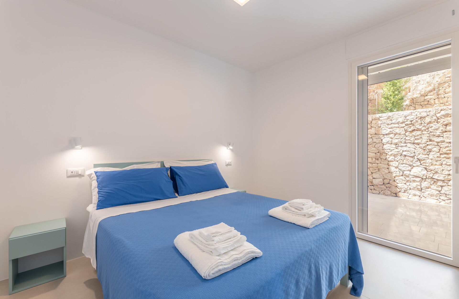 Primo piano: soggiorno (aria condizionata, tv) con divano letto matrimoniale, angolo cottura (piano cottura, forno, freezer, frigorifero, lavastoviglie, macchina da caffè) e zona pranzo e uscita sulla terrazza coperta con vista mare, camera matrimoniale (aria condizionata, zanzariera), camera con due letti singoli (aria condizionata, zanzariera) con uscita sulla terrazza coperta con grandi aperture ad arco e vista mare, bagno con doccia.