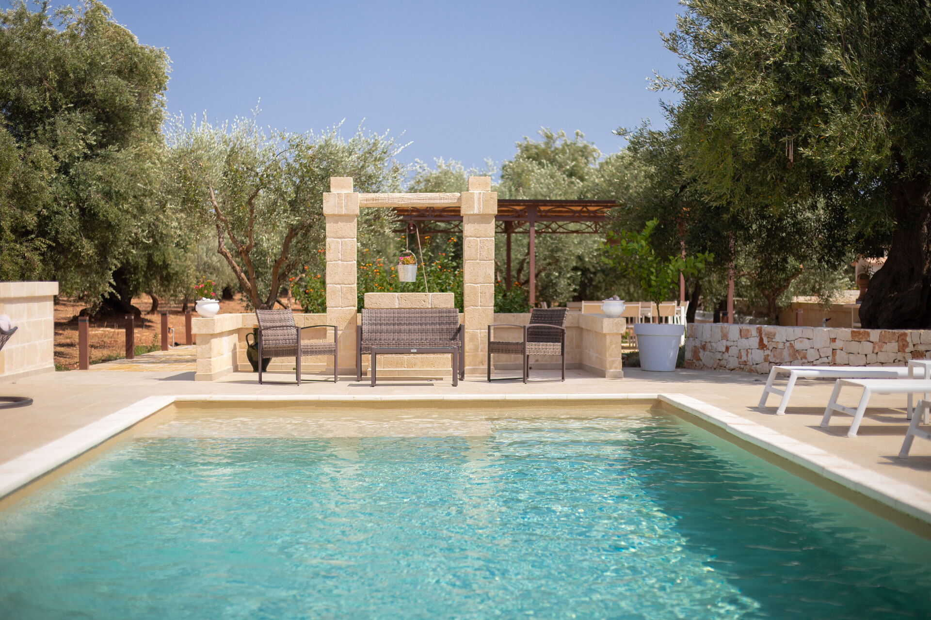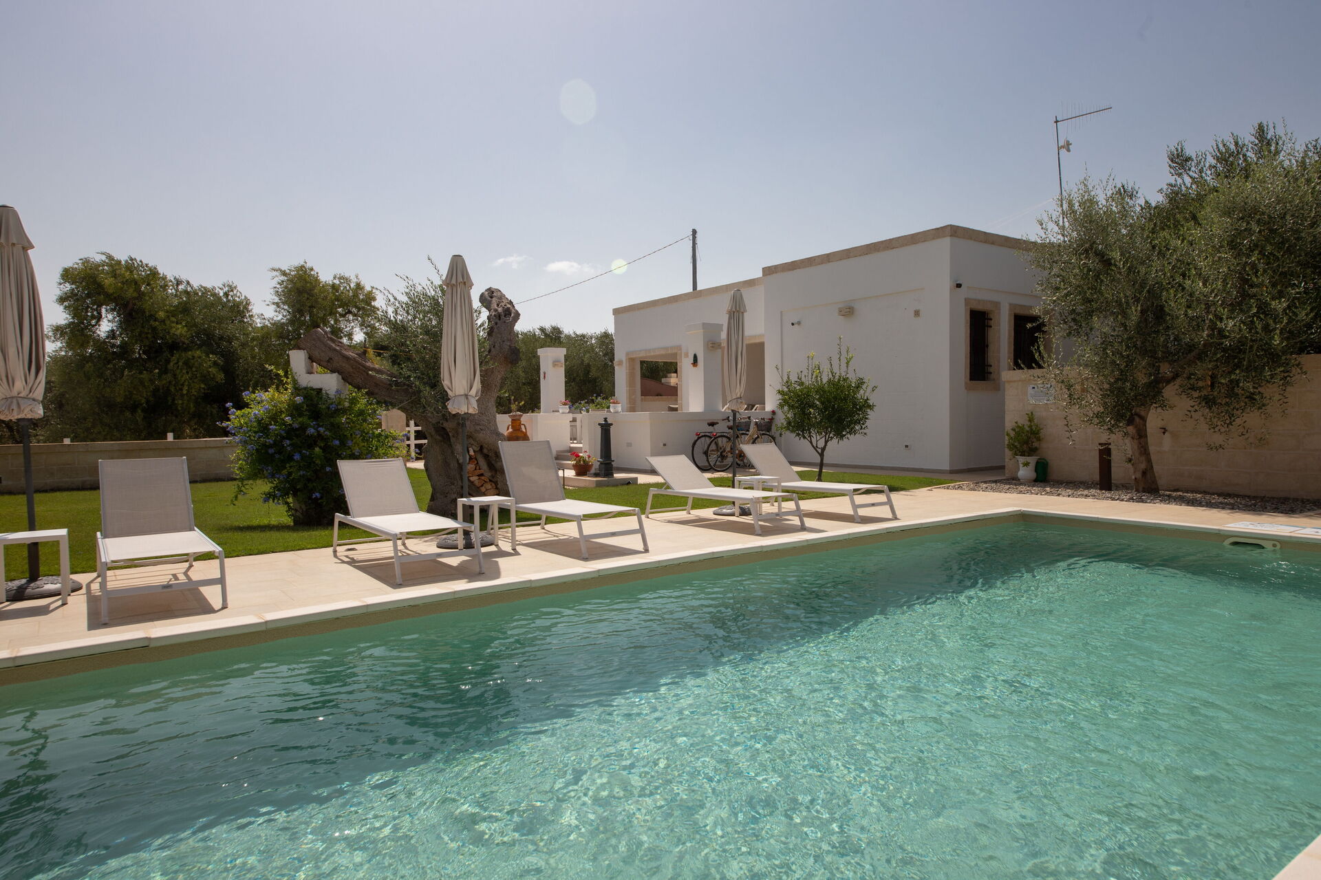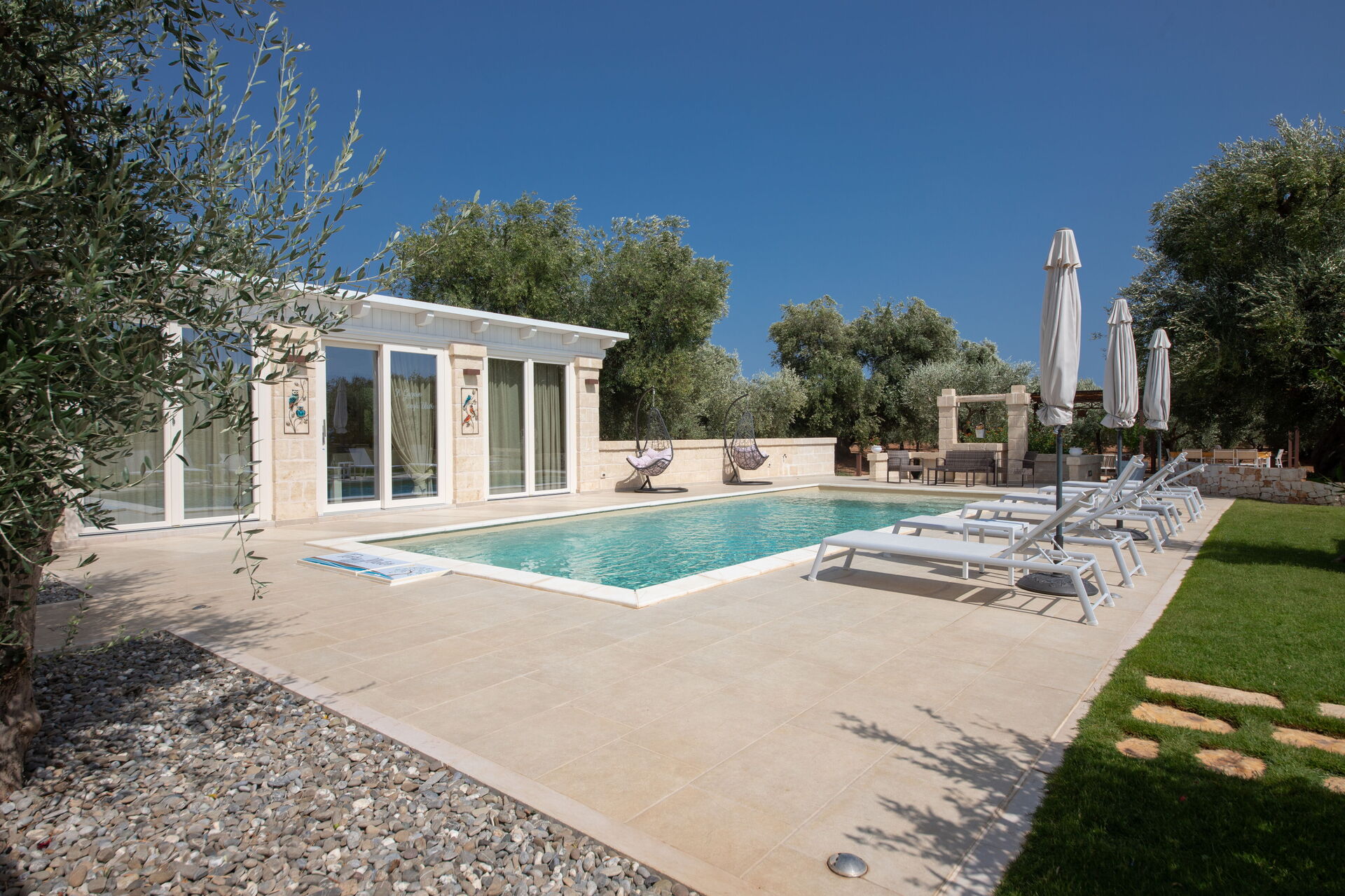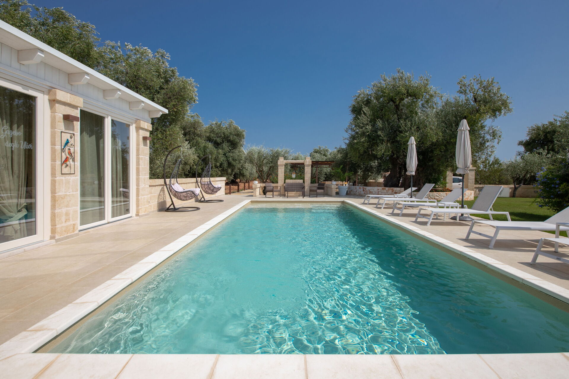 Esternamente, oltre all’elegante piscina ad uso esclusivo degli ospiti, la proprietà dispone di ampie zone comuni per poter trascorrere le vostre giornate all’aria aperta: un grande pergolato con una bella zona relax e un barbecue in muratura.