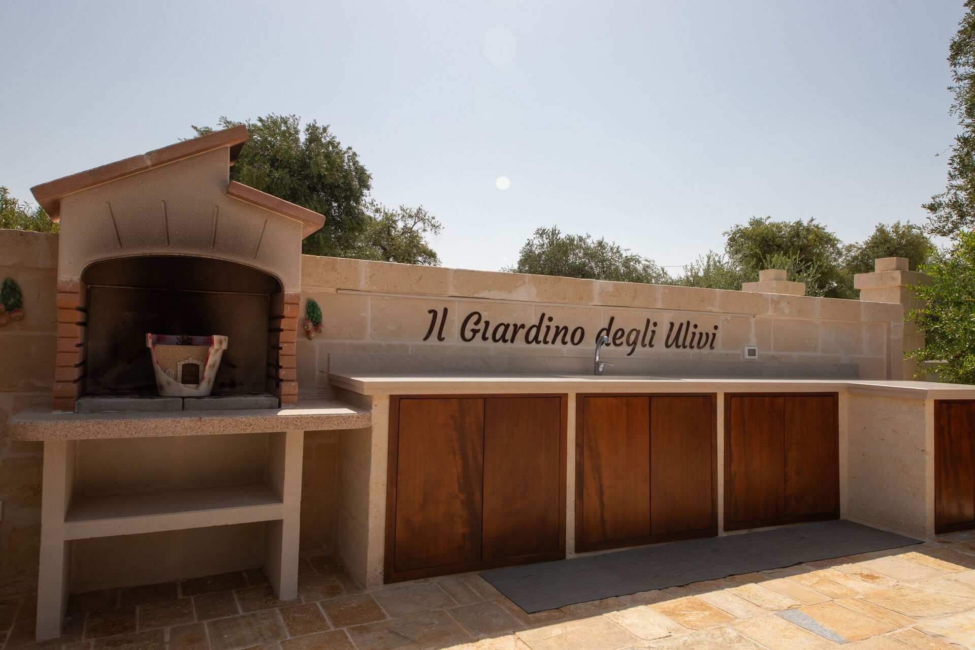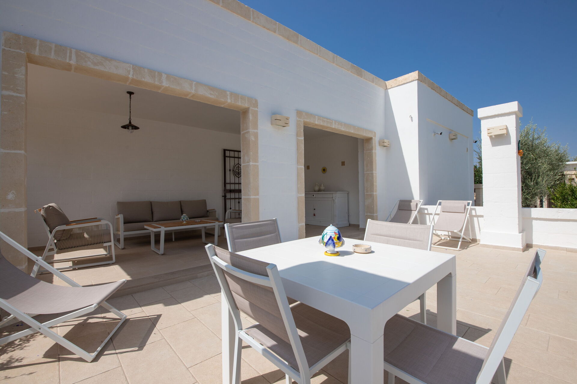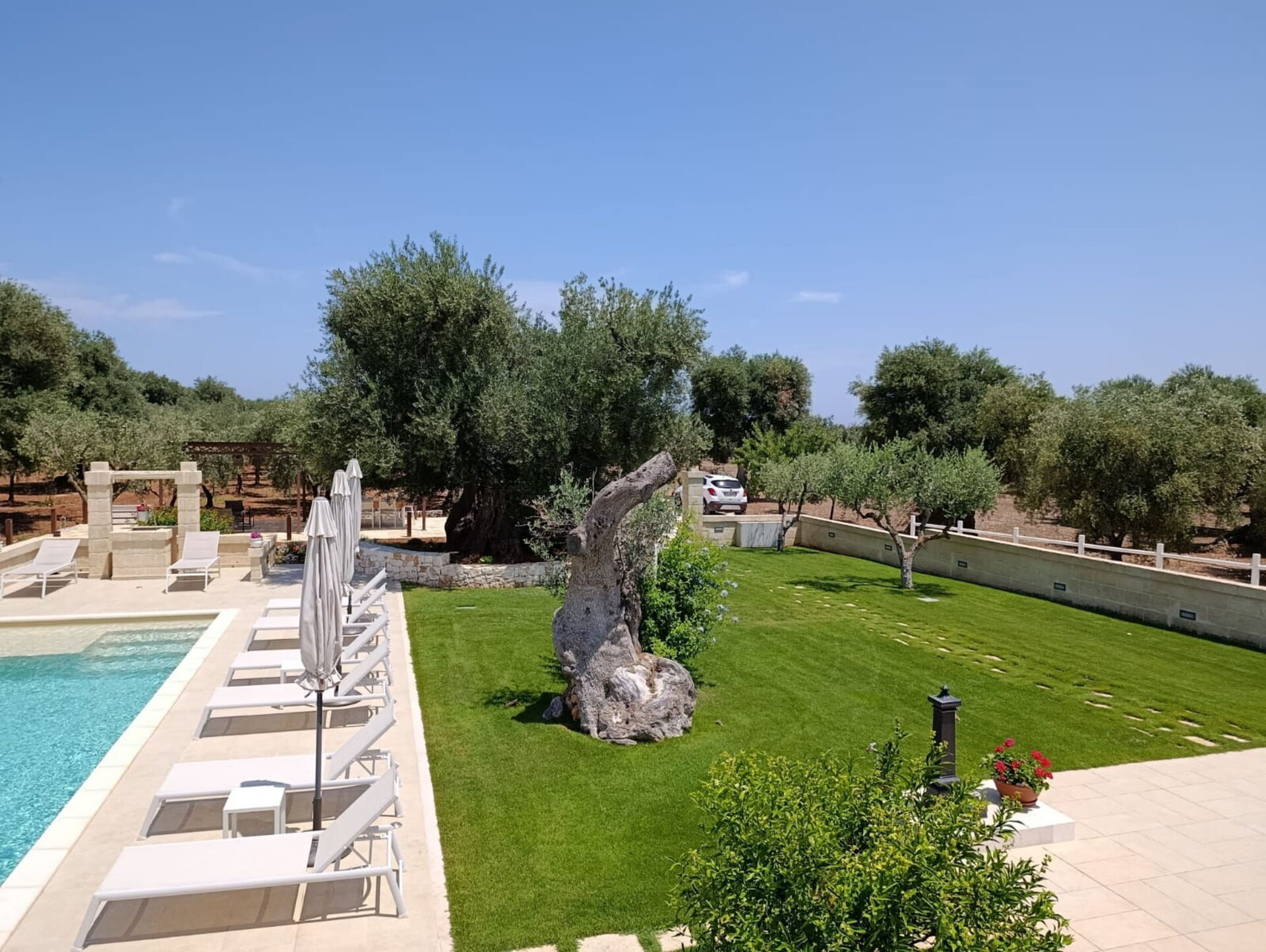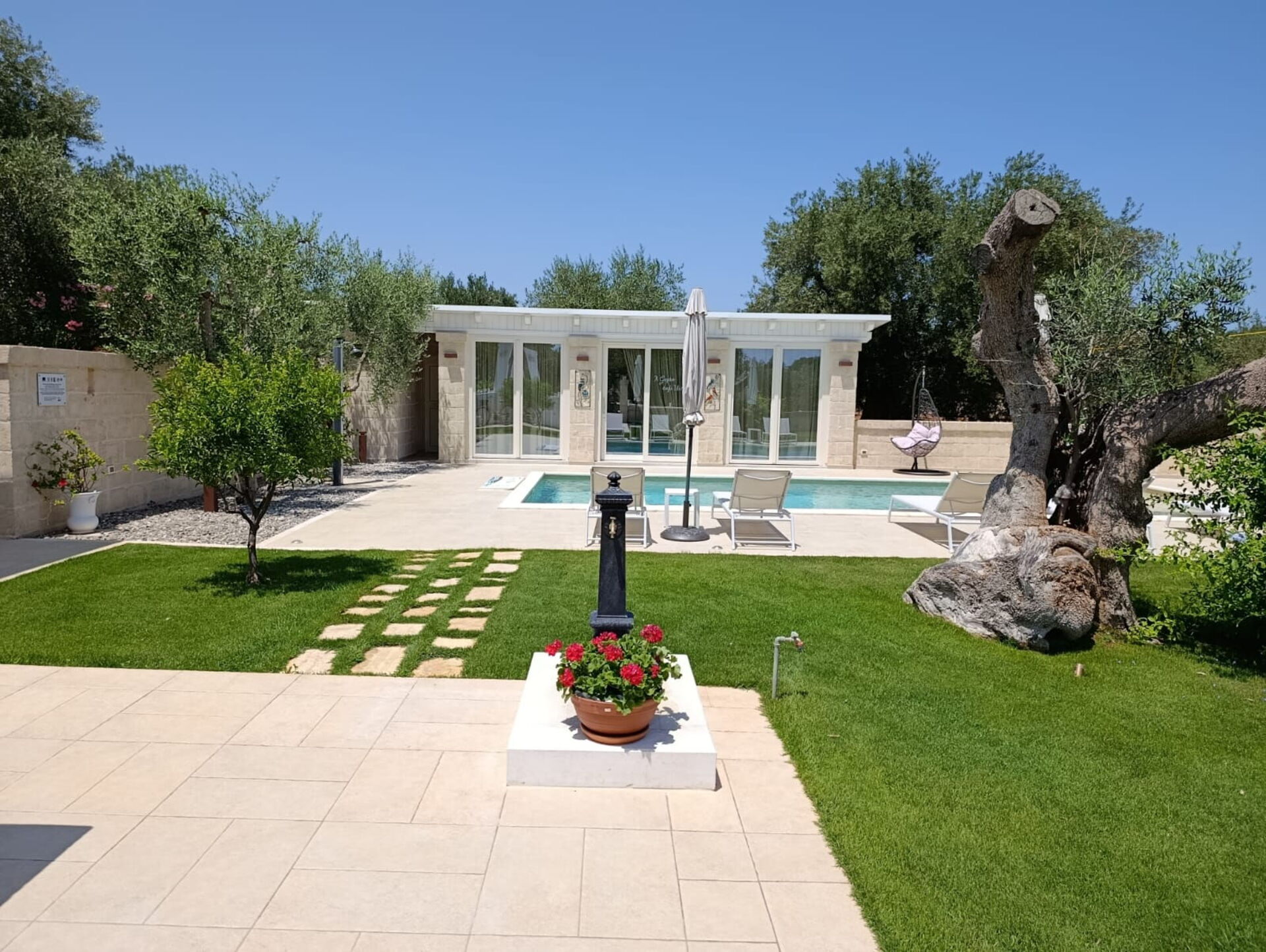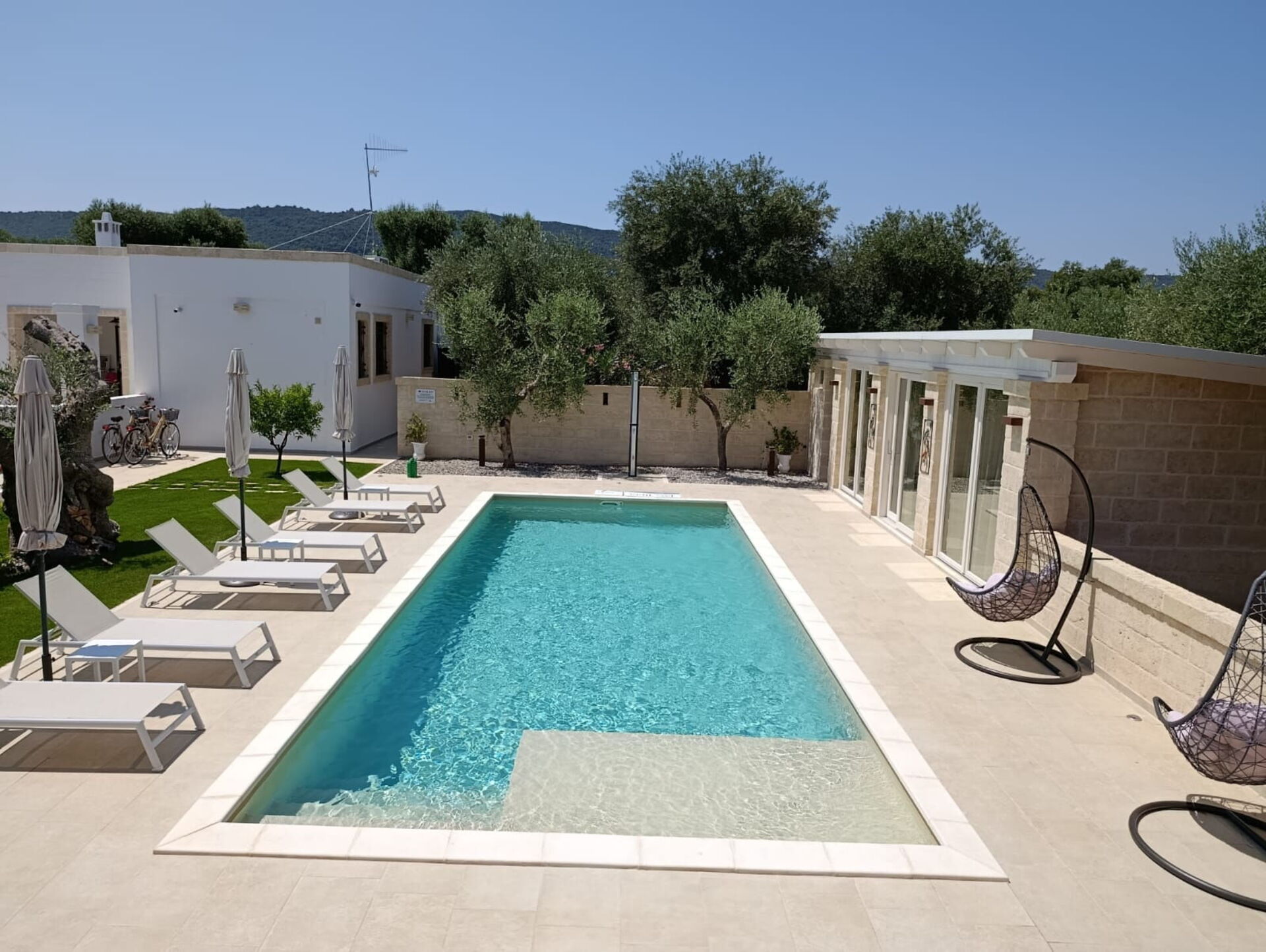 Esternamente, oltre all’elegante piscina ad uso esclusivo degli ospiti, la proprietà dispone di ampie zone comuni per poter trascorrere le vostre giornate all’aria aperta: un grande pergolato con una bella zona relax e un barbecue in muratura.