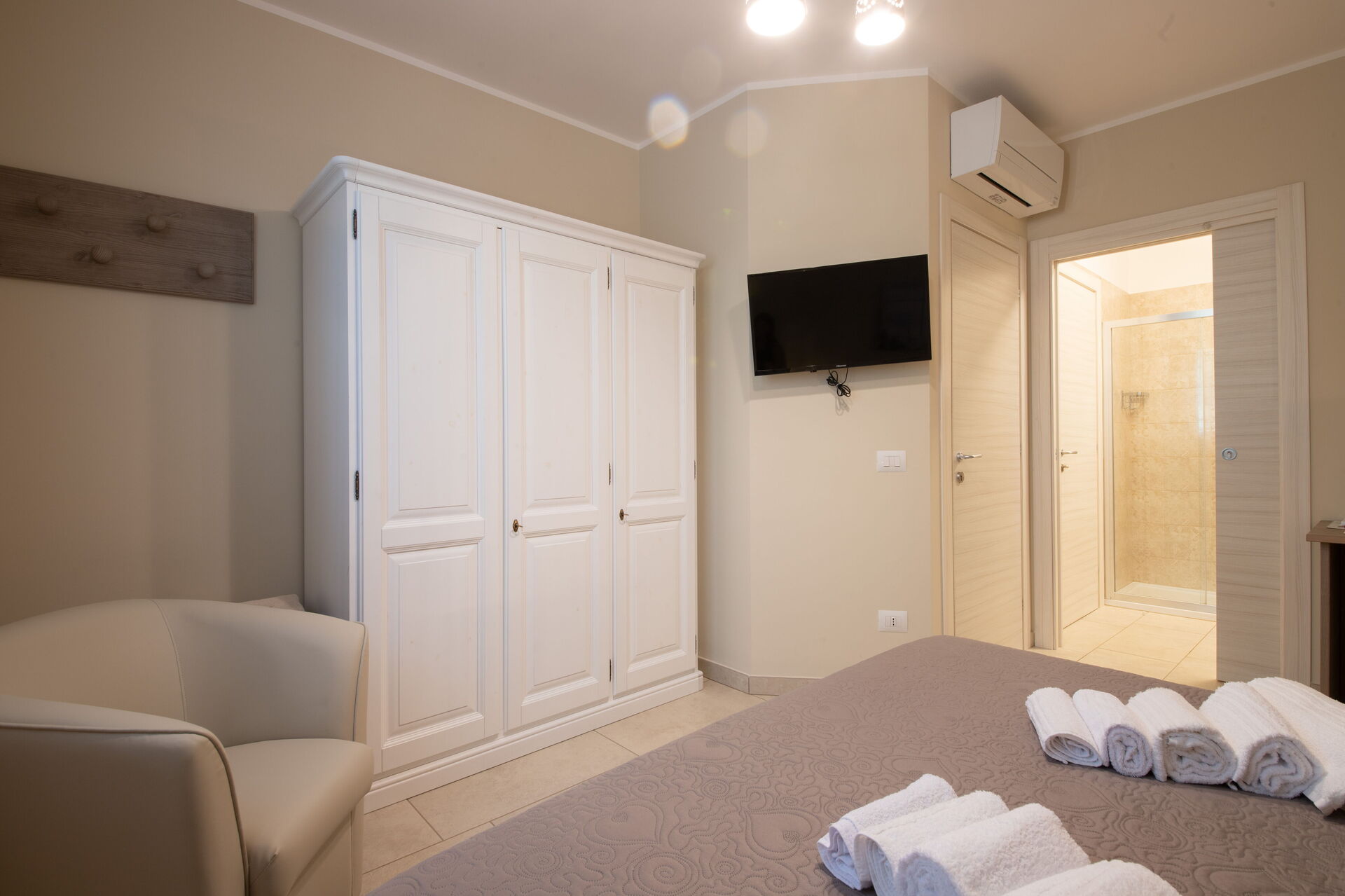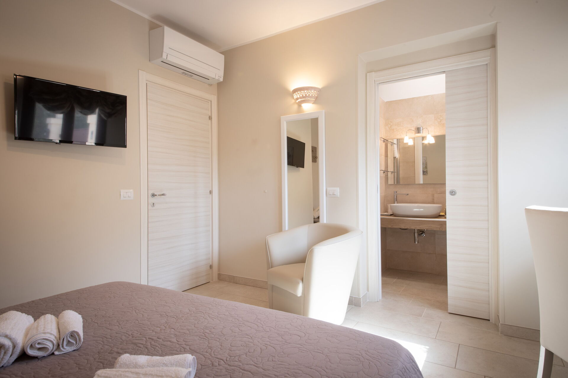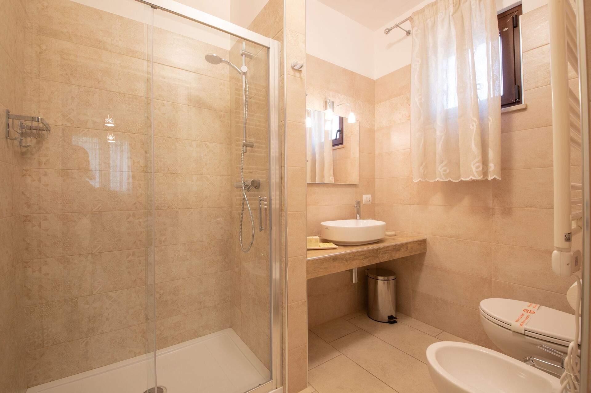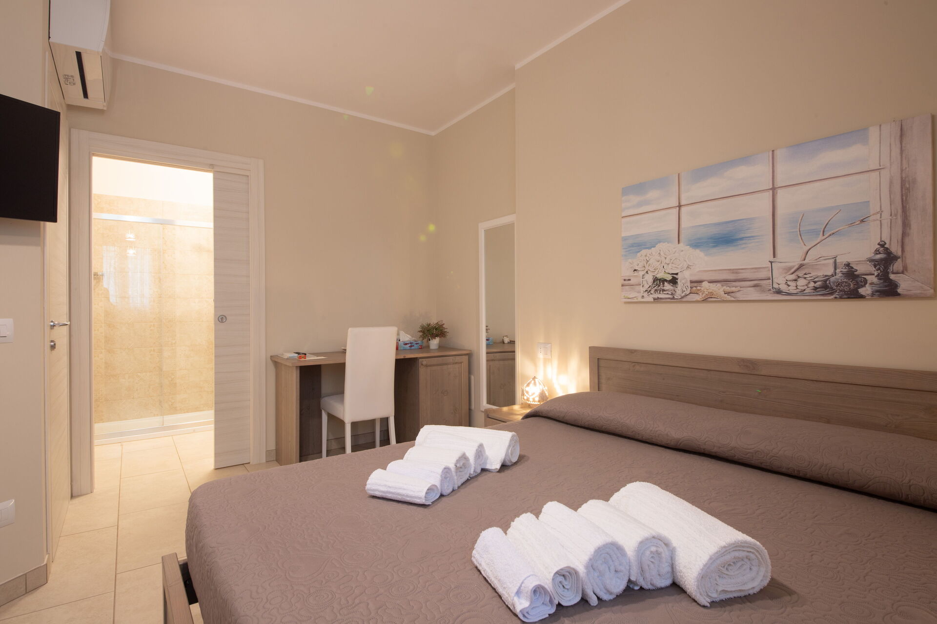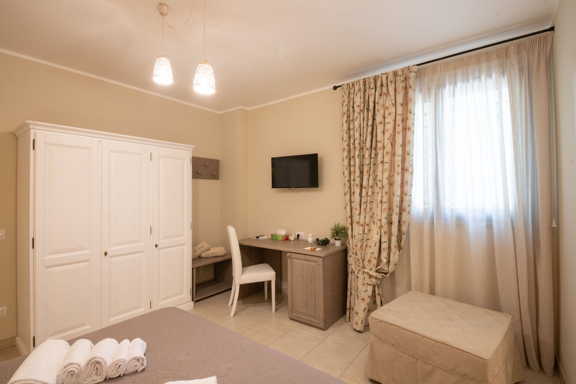 Piano terreno rialzato: soggiorno, 2 camere matrimoniali (aria condizionata, frigobar, tv, zanzariere) con bagno privato con doccia, camera con 2 letti singoli (aria condizionata, frigobar, tv, zanzariere) con bagno privato con doccia.