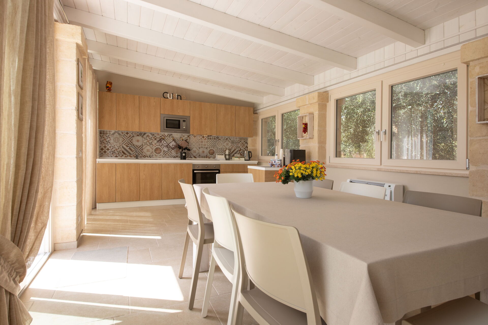 Piano terreno: luminoso soggiorno con zona pranzo (aria condizionata) e angolo cottura (piano a induzione, forno, microonde, tostapane, frigorifero).