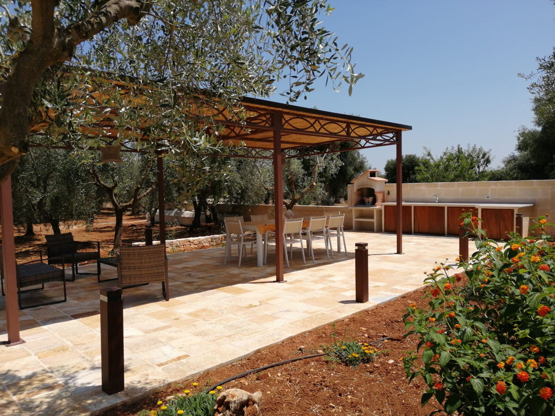 - Zona relax sotto pergolato con sedie e tavoli