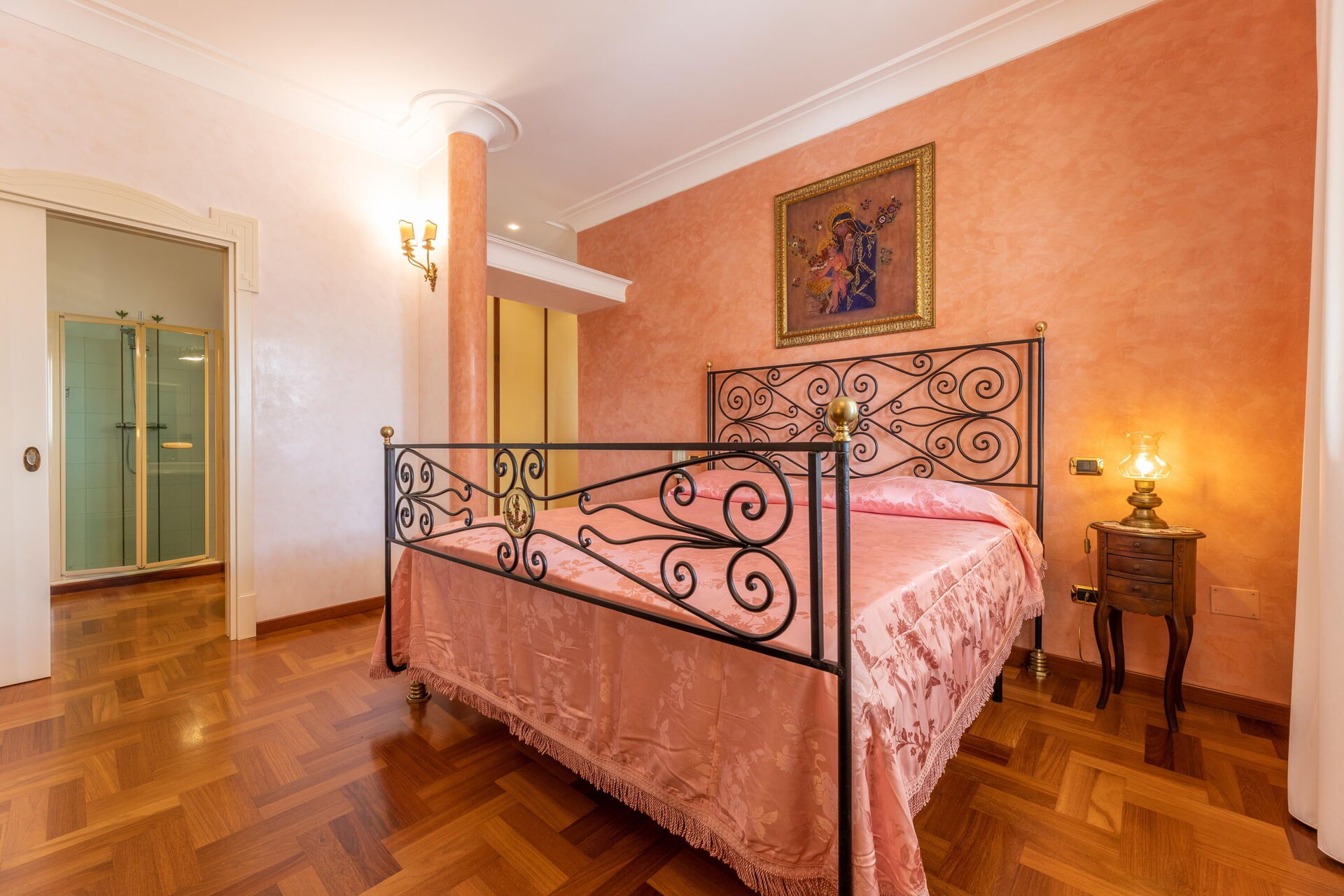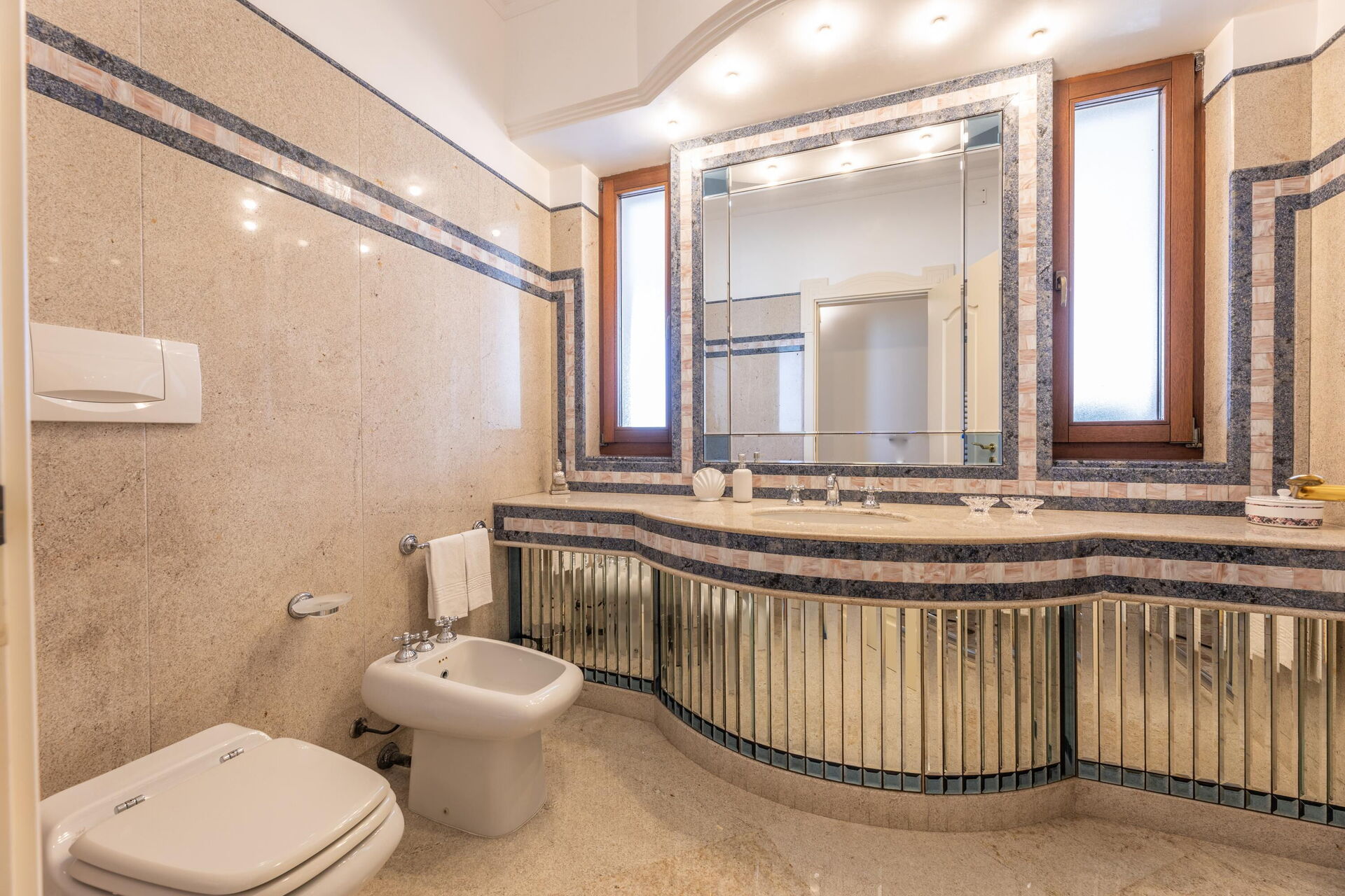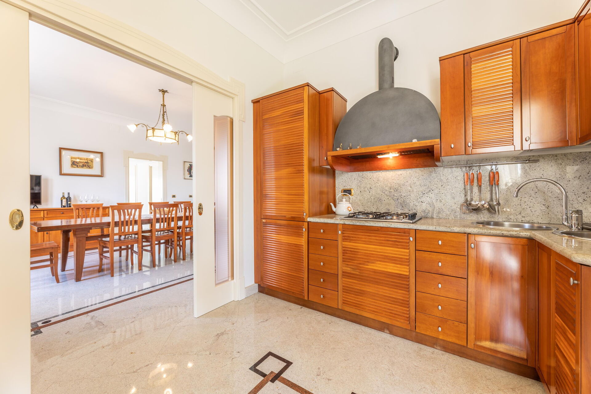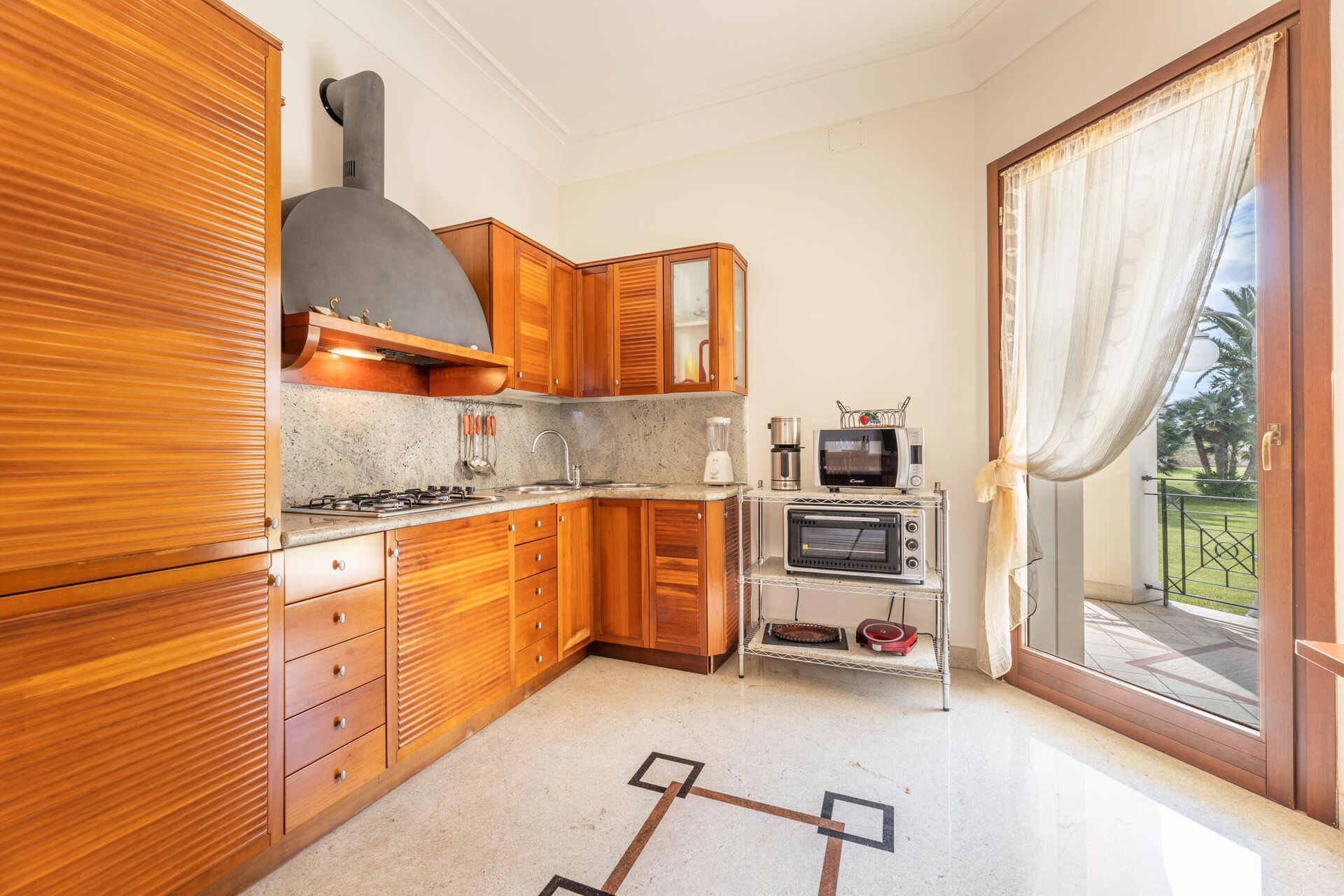 Piano terreno rialzato: ingresso, soggiorno (pianoforte), sala pranzo (tv satellitare) e con uscita sul loggiato, cucina (piano cottura, forno, freezer, frigorifero, lavastoviglie, microonde, macchina da caffè); camera matrimoniale con bagno privato con doccia, camera matrimoniale, bagno con vasca idromassaggio, camera con letto matrimoniale (trasformabile su richiesta in 2 letti singoli) e letto singolo (extra e su richiesta), bagno con doccia.