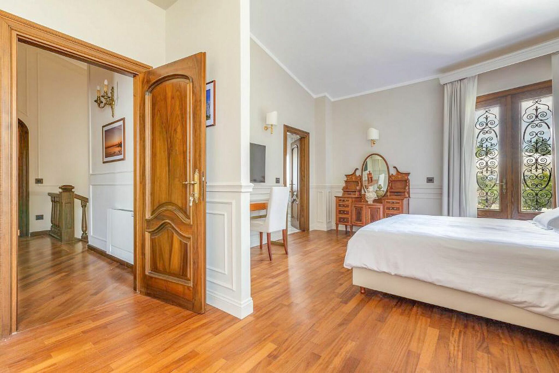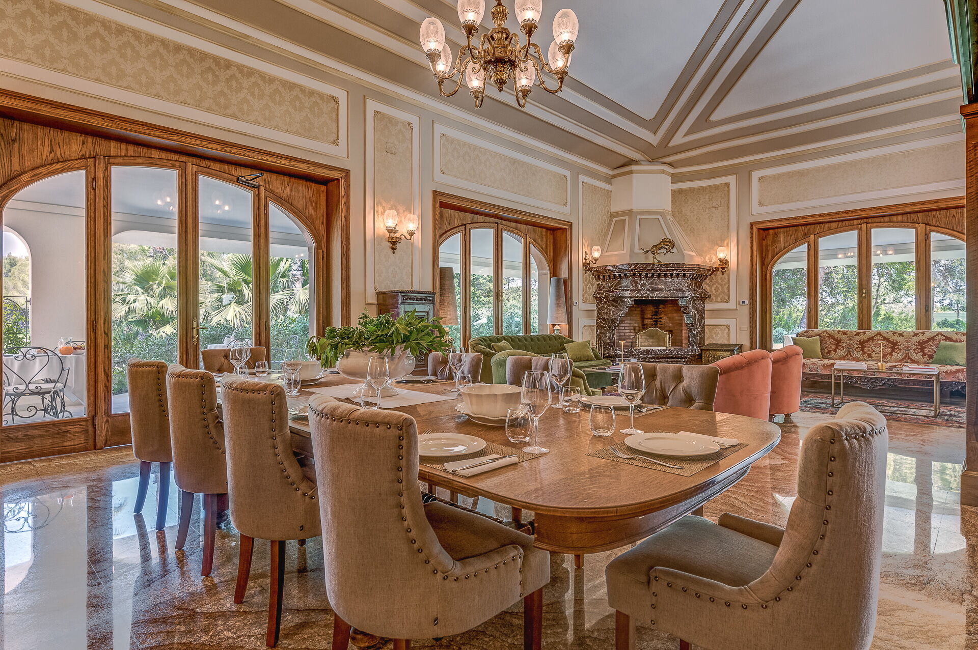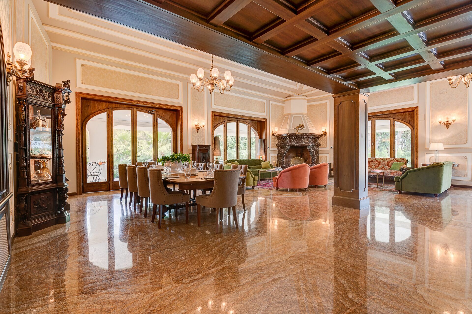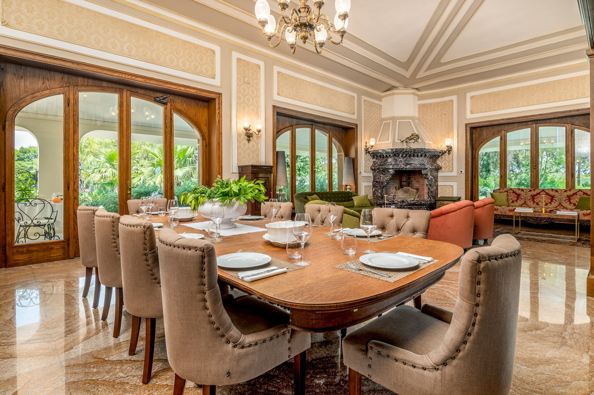 Piano terreno: ingresso, ampio soggiorno con camino, cucina principale, seconda cucina con accesso diretto all’esterno, 1 camera matrimoniale (letto king size) con bagno privato con doccia ed accesso a veranda privata con ulteriore accesso a giardino privato, 1 camera matrimoniale (letto king size) con bagno privato con doccia e vasca idromassaggio e accesso a veranda privata con ulteriore accesso a giardino privato