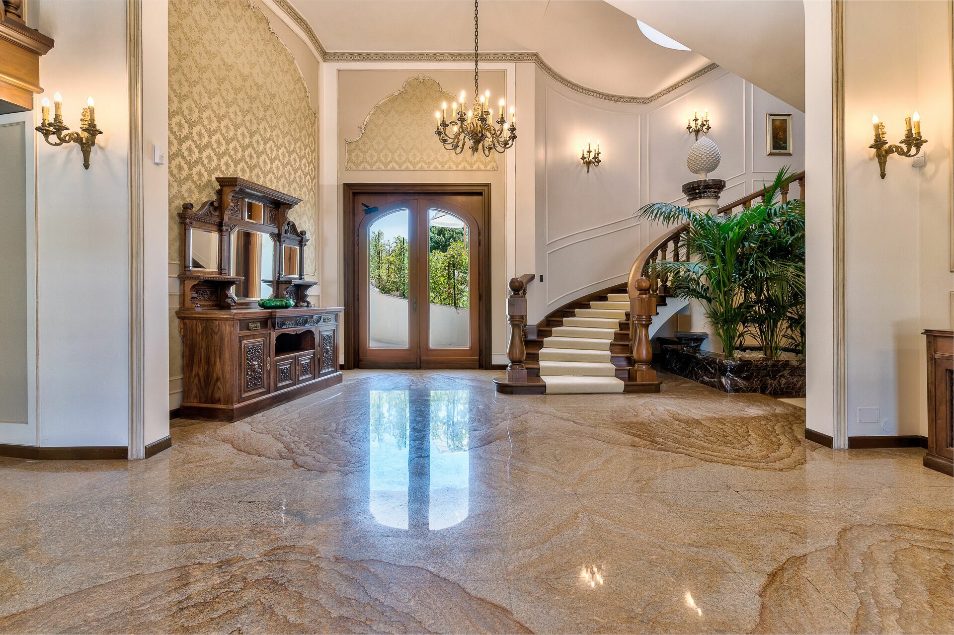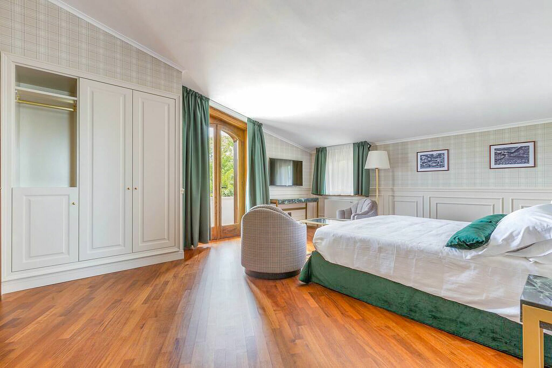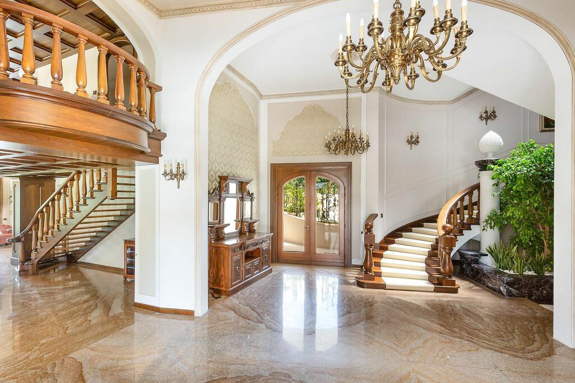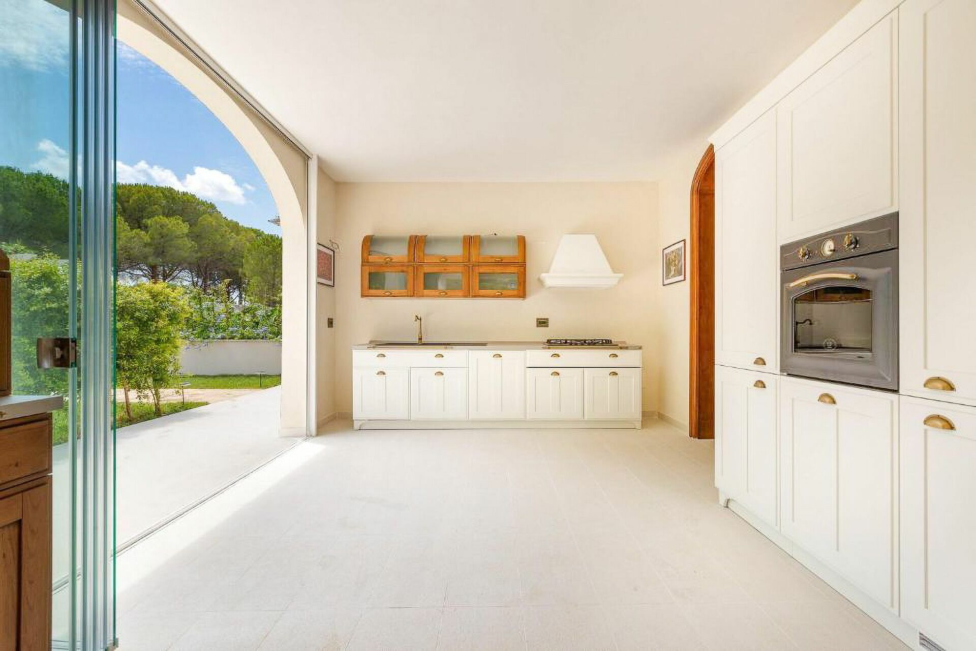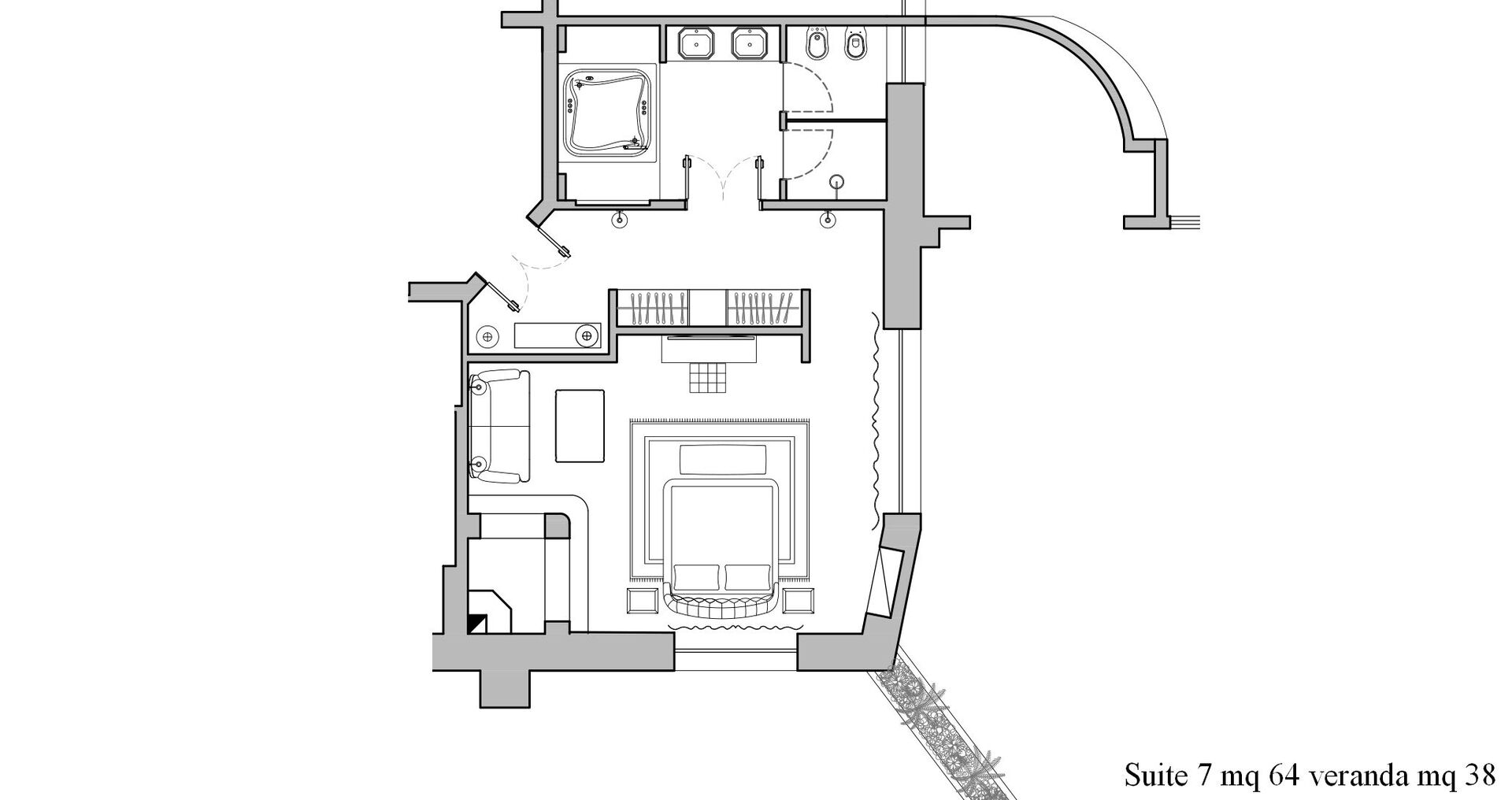 Piano terreno: ingresso, ampio soggiorno con camino, cucina principale, seconda cucina con accesso diretto all’esterno, 1 camera matrimoniale (letto king size) con bagno privato con doccia ed accesso a veranda privata con ulteriore accesso a giardino privato, 1 camera matrimoniale (letto king size) con bagno privato con doccia e vasca idromassaggio e accesso a veranda privata con ulteriore accesso a giardino privato