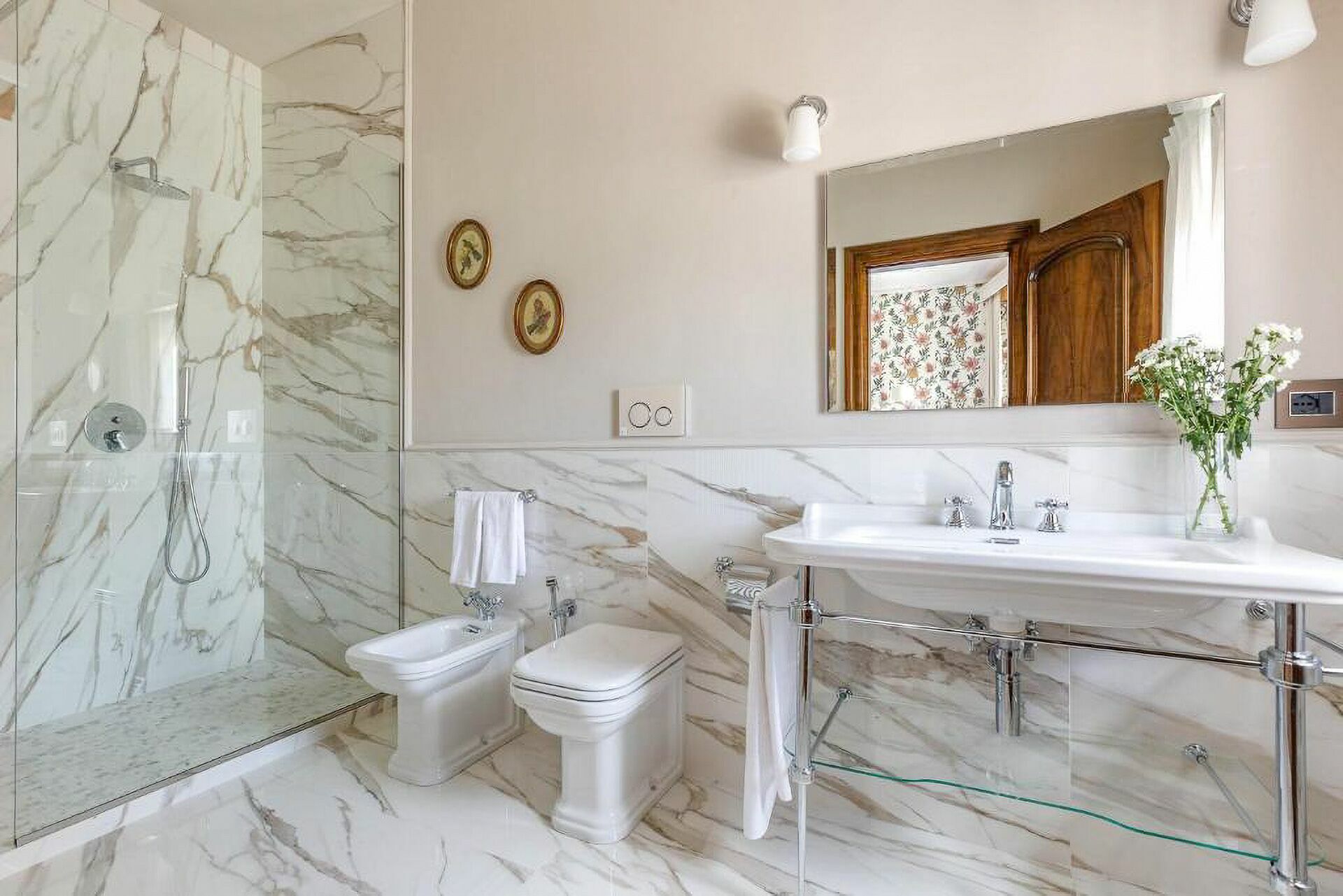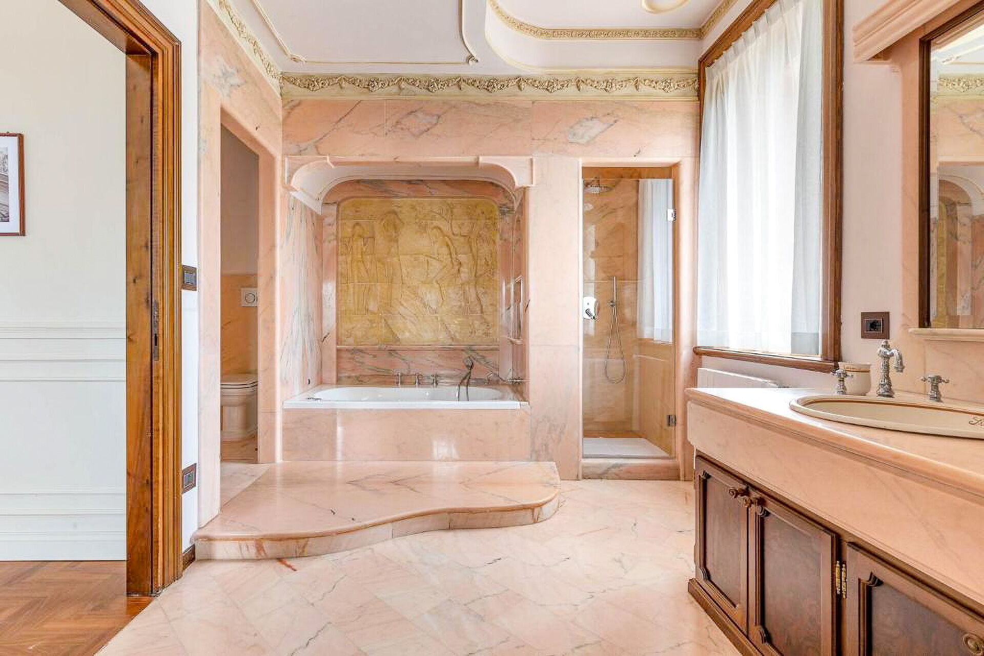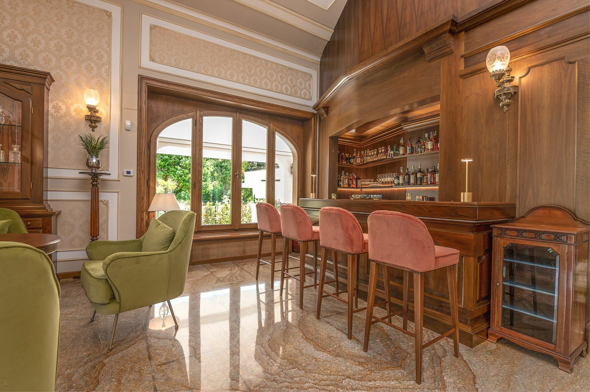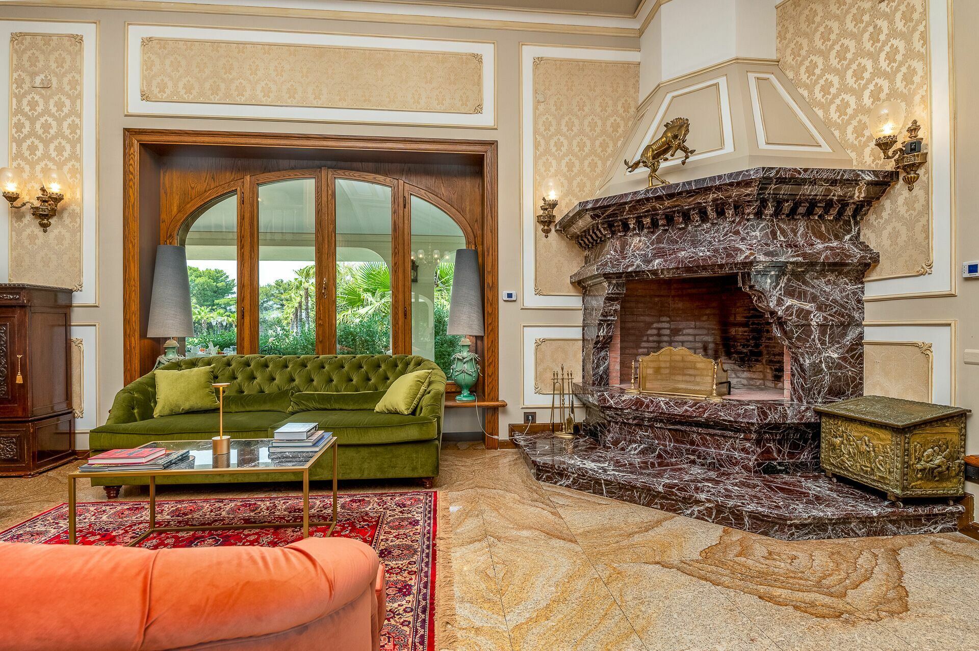 Piano terreno: ingresso, ampio soggiorno con camino, cucina principale, seconda cucina con accesso diretto all’esterno, 1 camera matrimoniale (letto king size) con bagno privato con doccia ed accesso a veranda privata con ulteriore accesso a giardino privato, 1 camera matrimoniale (letto king size) con bagno privato con doccia e vasca idromassaggio e accesso a veranda privata con ulteriore accesso a giardino privato