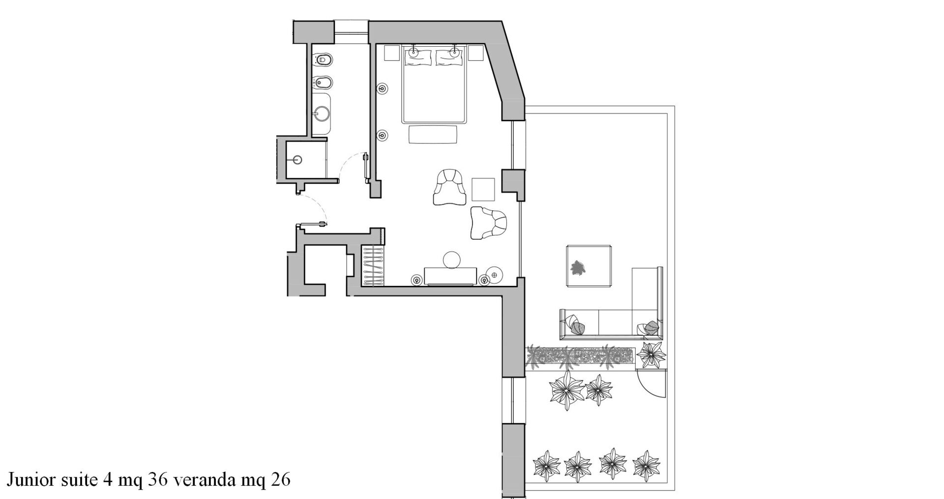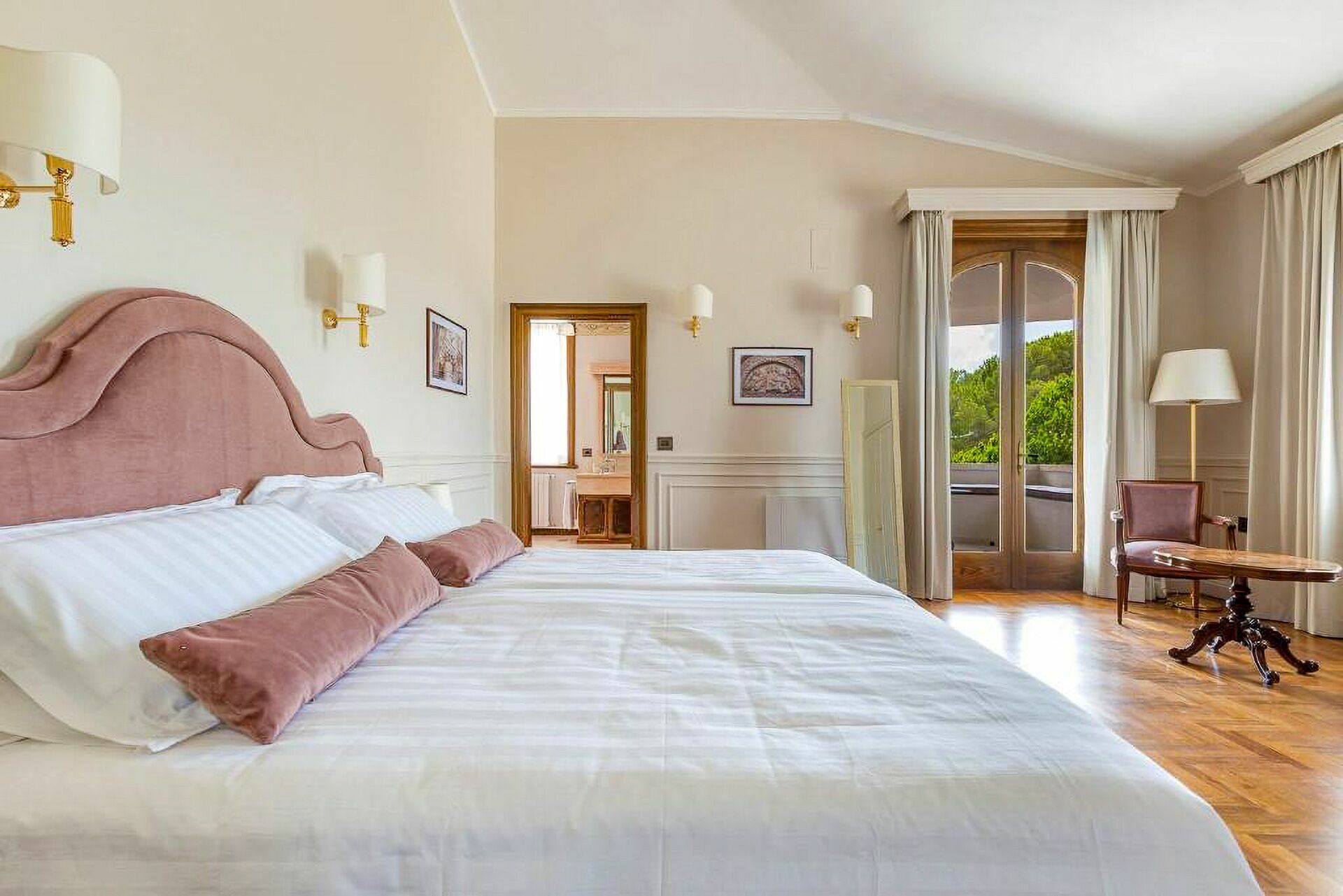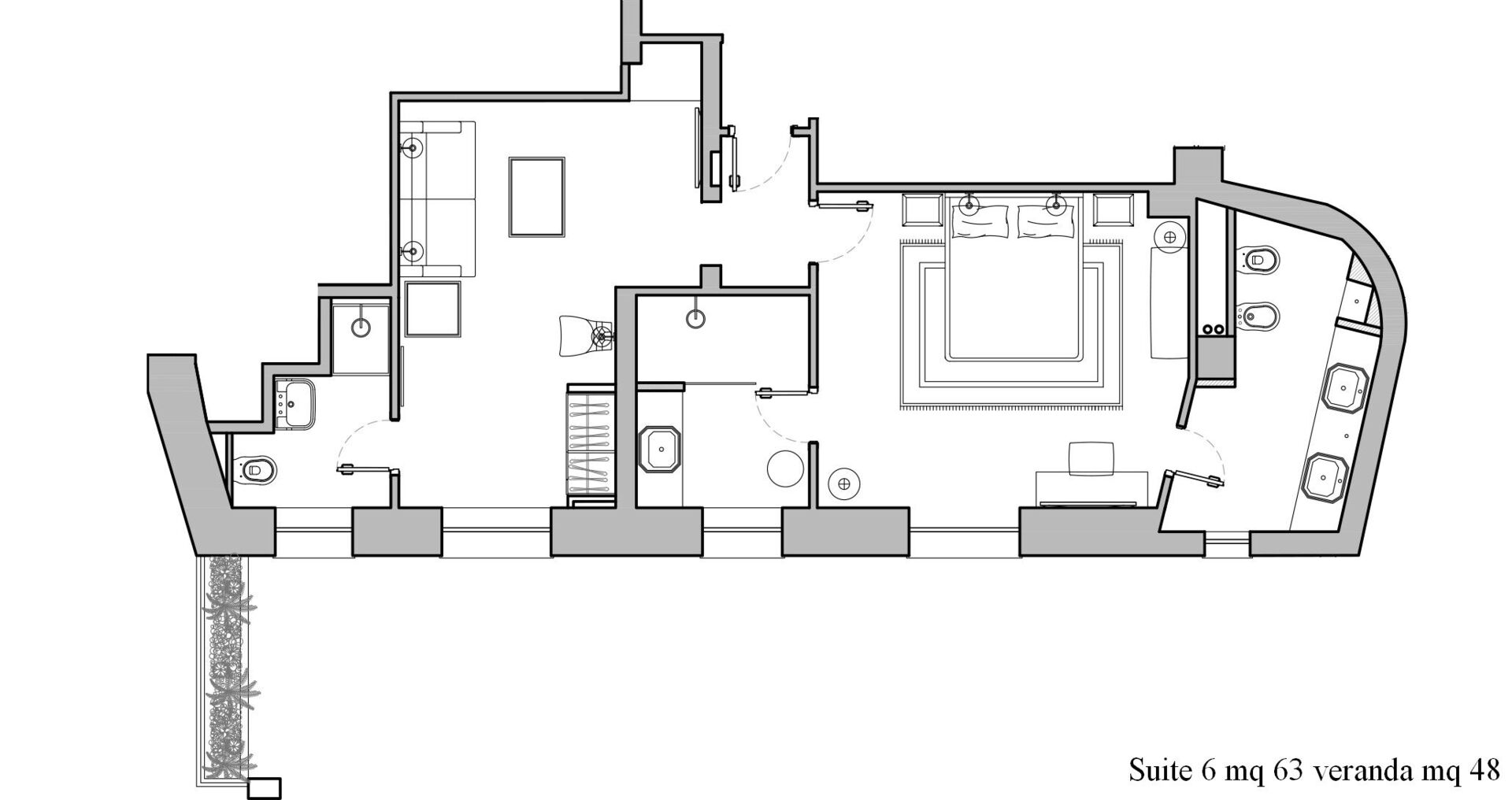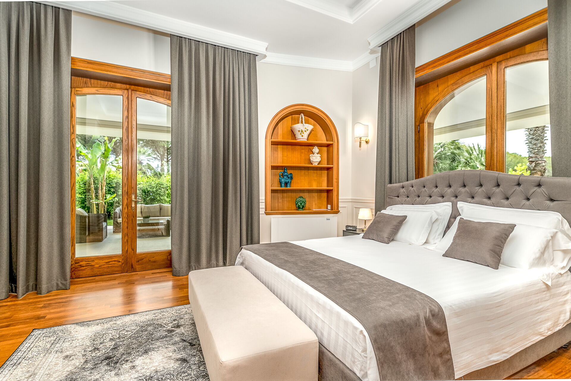 Piano primo: 1 camera matrimoniale (letto super king size) con bagno privato con vasca idromassaggio e doccia ed accesso a terrazzo privato, 1 camera matrimoniale (letto king size) con bagno privato con doccia; 1 camera matrimoniale (letto king size) con bagno privato con doccia e accesso a terrazzo privato, 1 camera matrimoniale (letto super king size) con bagno privato con doccia e accesso a terrazzo privato.