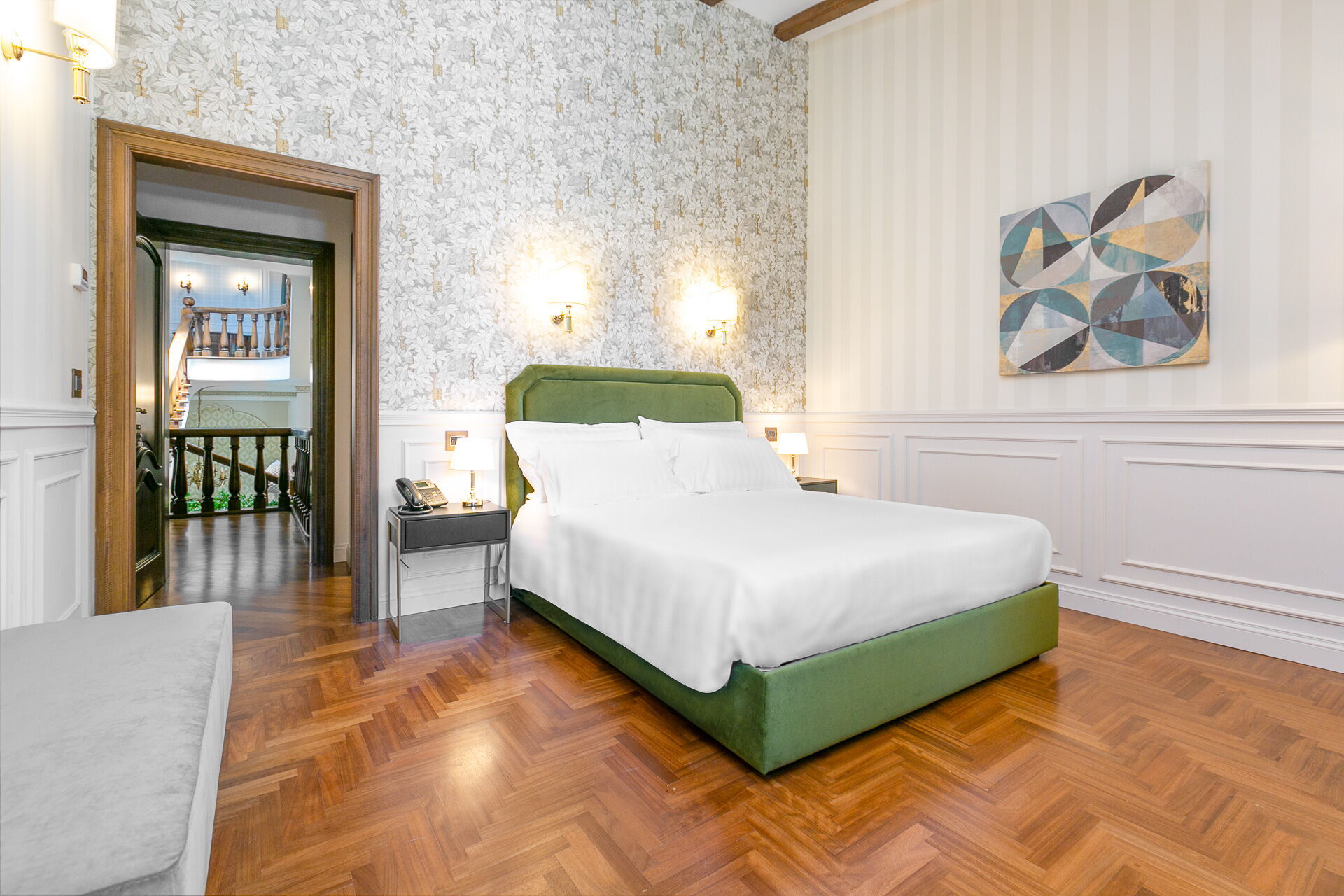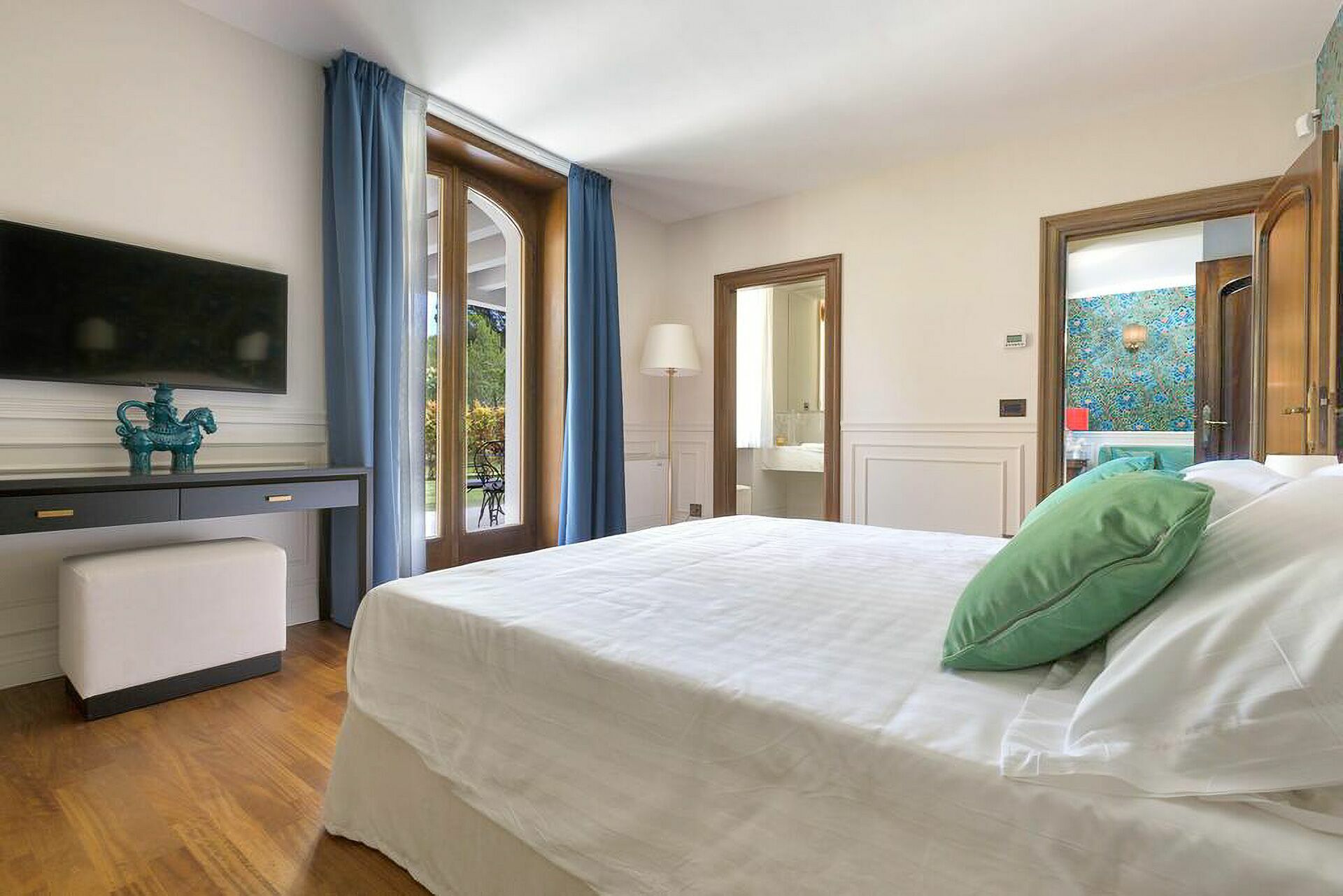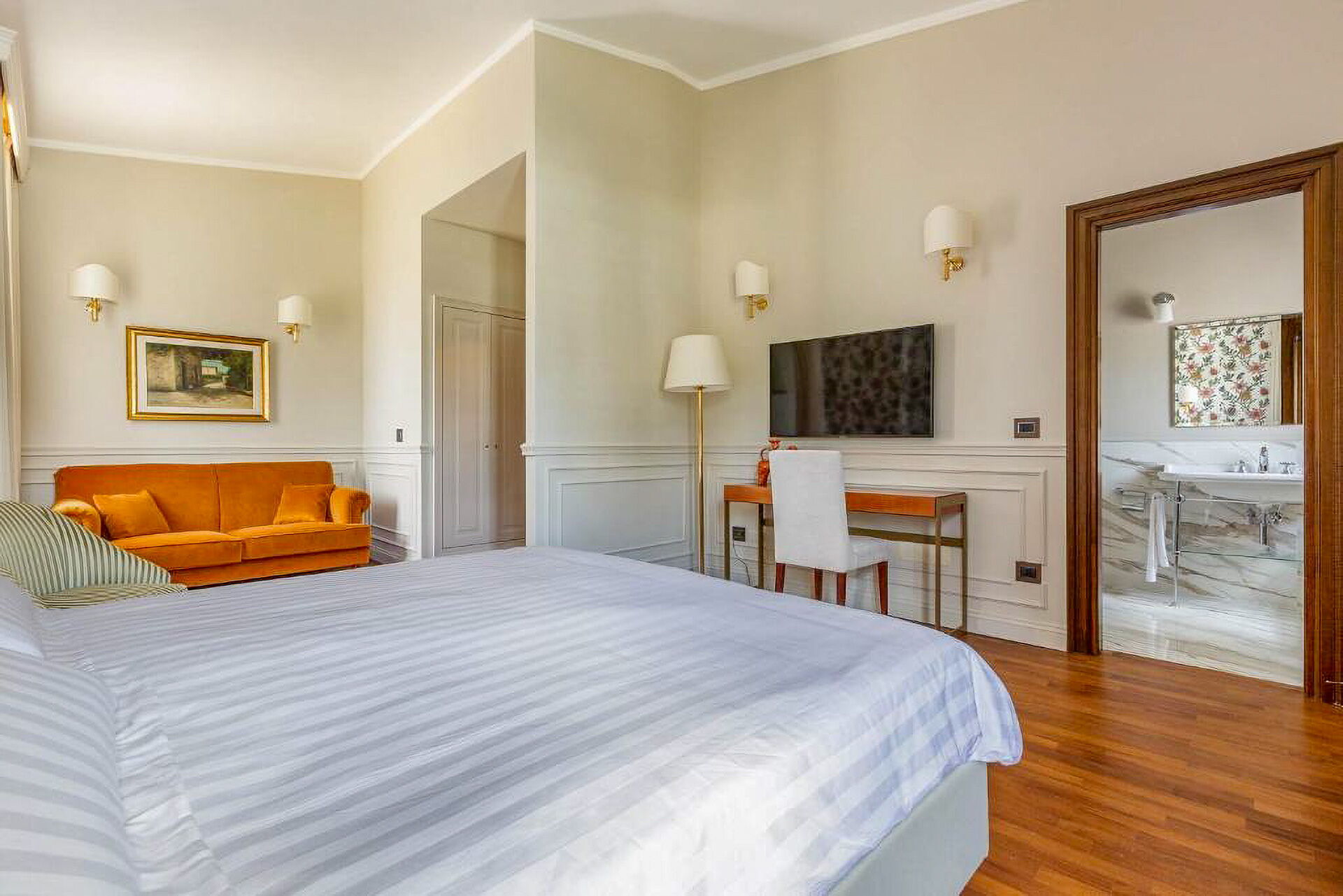 Piano primo: 1 camera matrimoniale (letto super king size) con bagno privato con vasca idromassaggio e doccia ed accesso a terrazzo privato, 1 camera matrimoniale (letto king size) con bagno privato con doccia; 1 camera matrimoniale (letto king size) con bagno privato con doccia e accesso a terrazzo privato, 1 camera matrimoniale (letto super king size) con bagno privato con doccia e accesso a terrazzo privato.