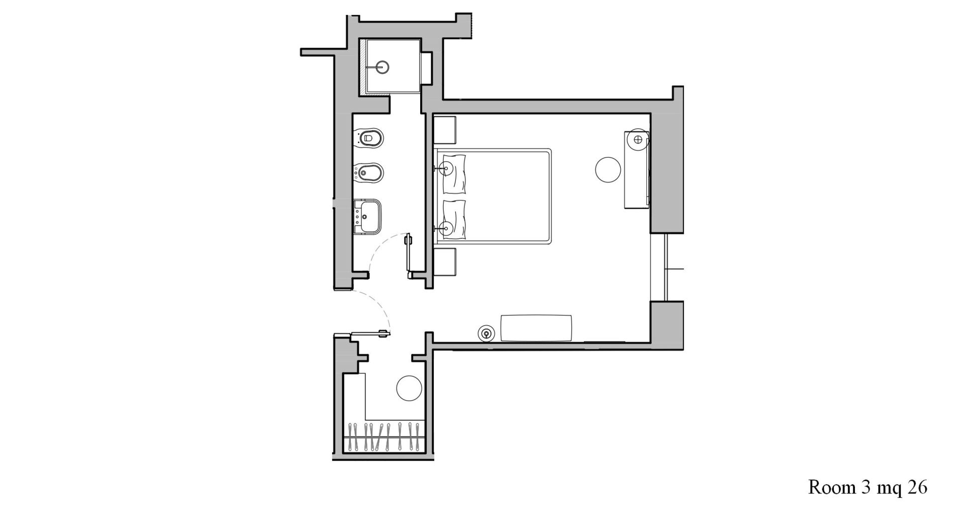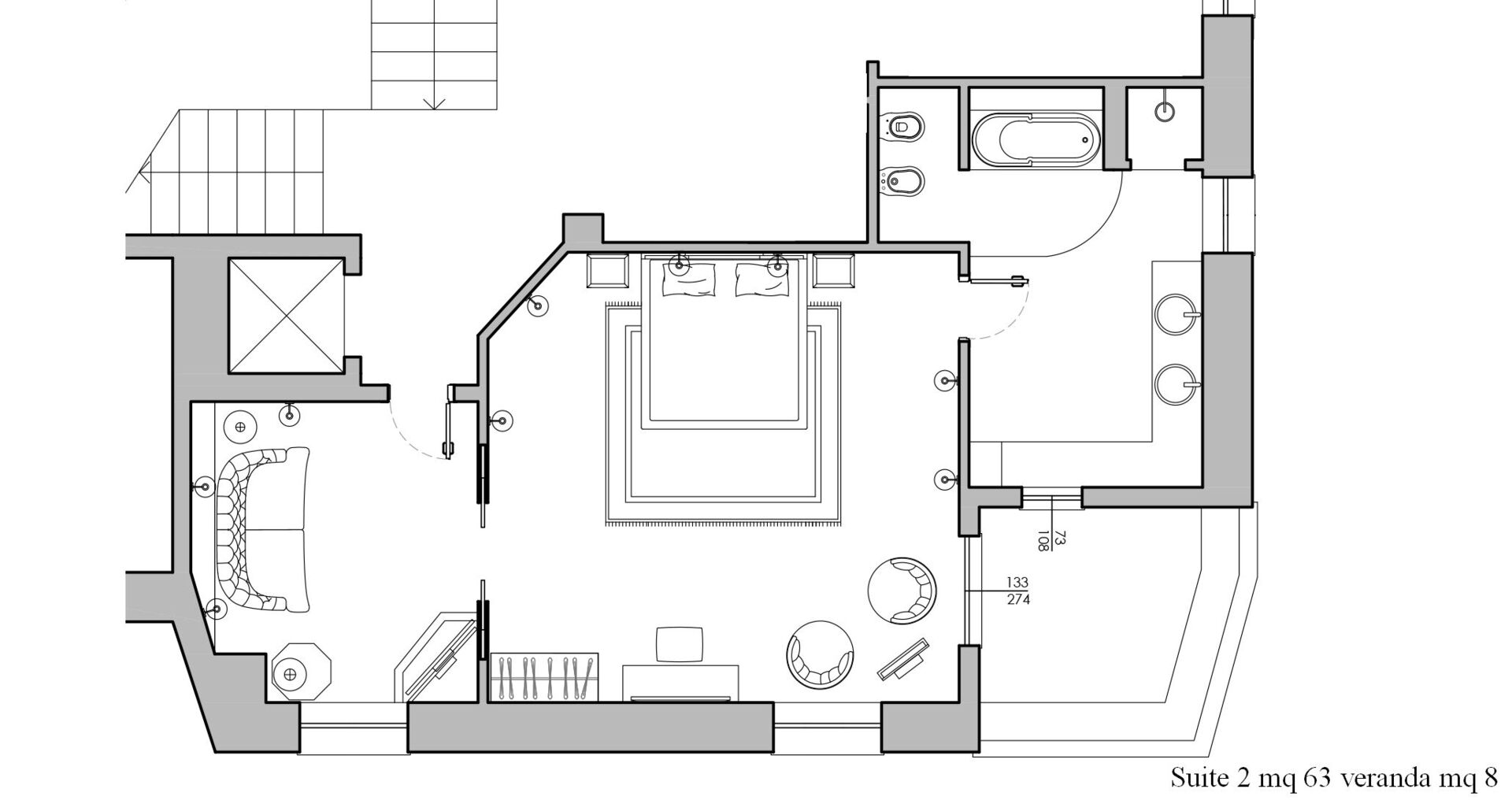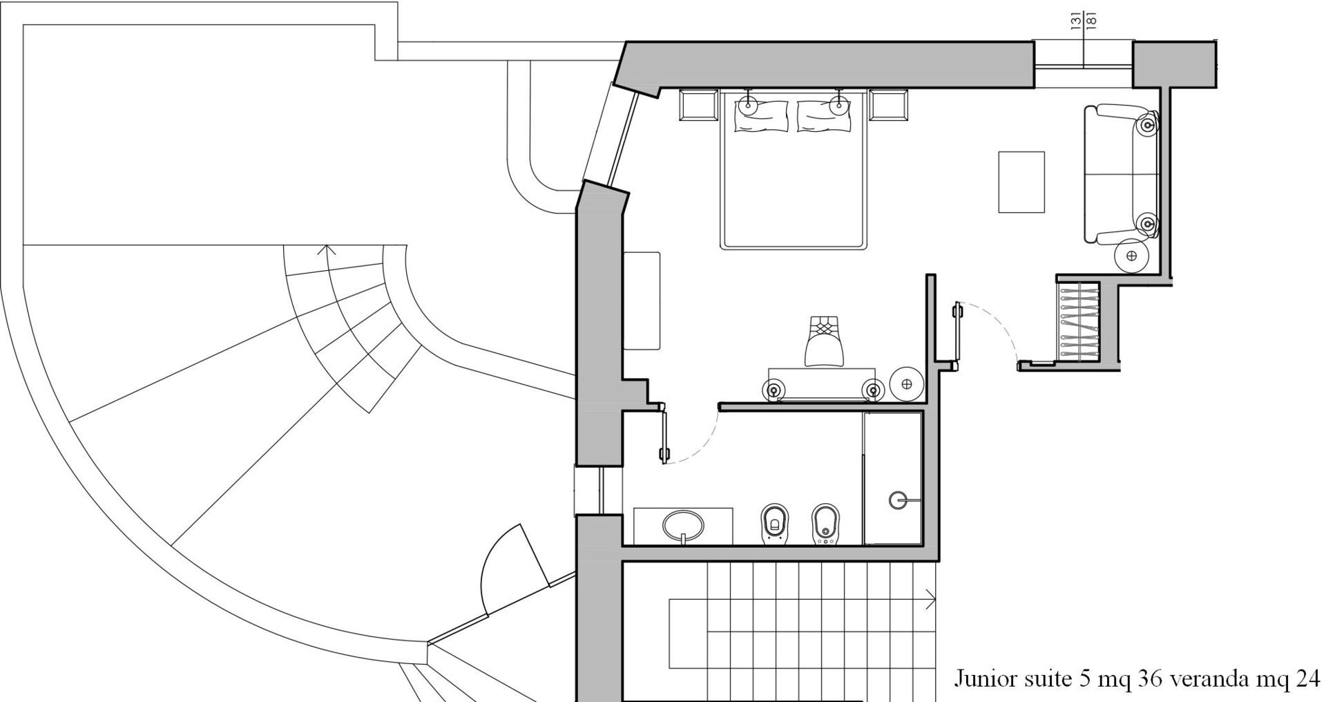 Piano secondo: 1 camera matrimoniale (letto super king size) con bagno privato con doccia ed accesso a terrazzo privato.