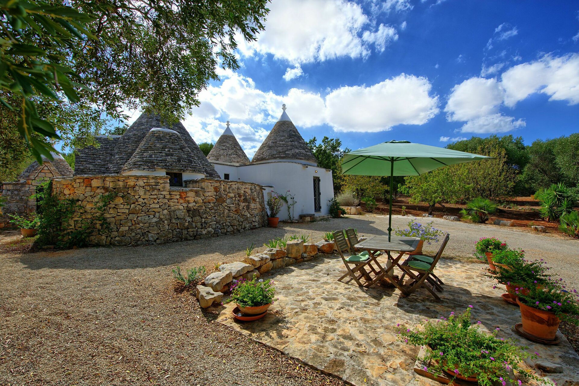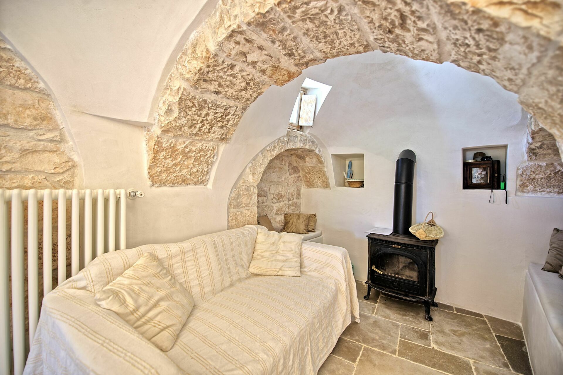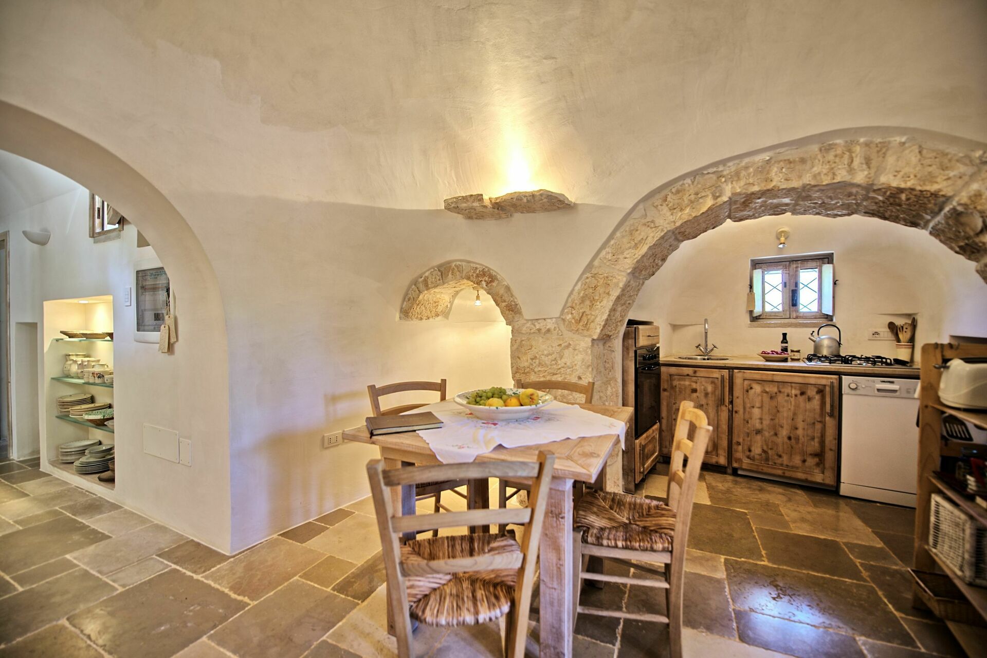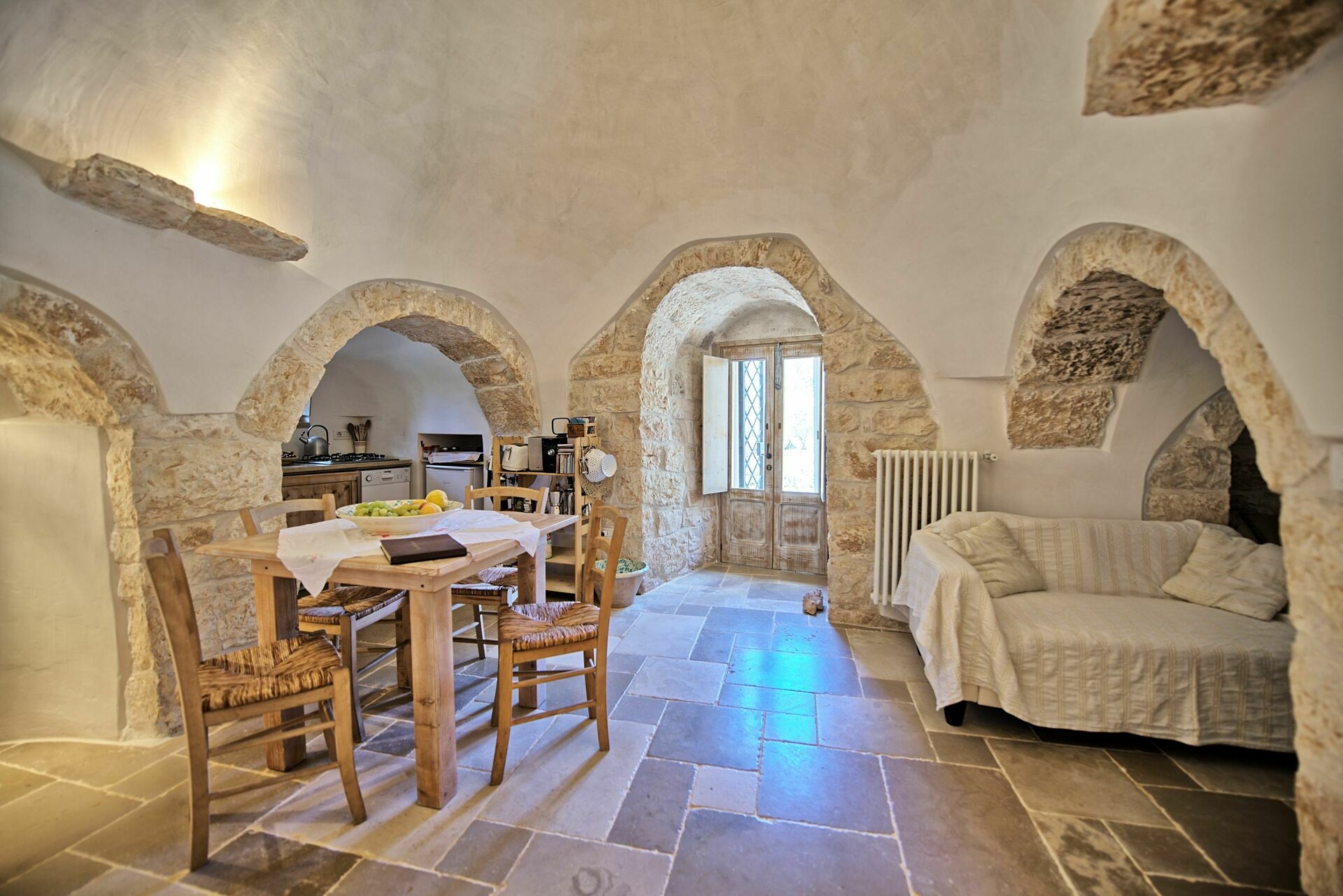 Nei mesi più freddi il riscaldamento e una stufa a legna vi terranno al caldo mentre nei mesi più caldi le grandi pareti manterranno all'interno del trullo una temperatura gradevole.