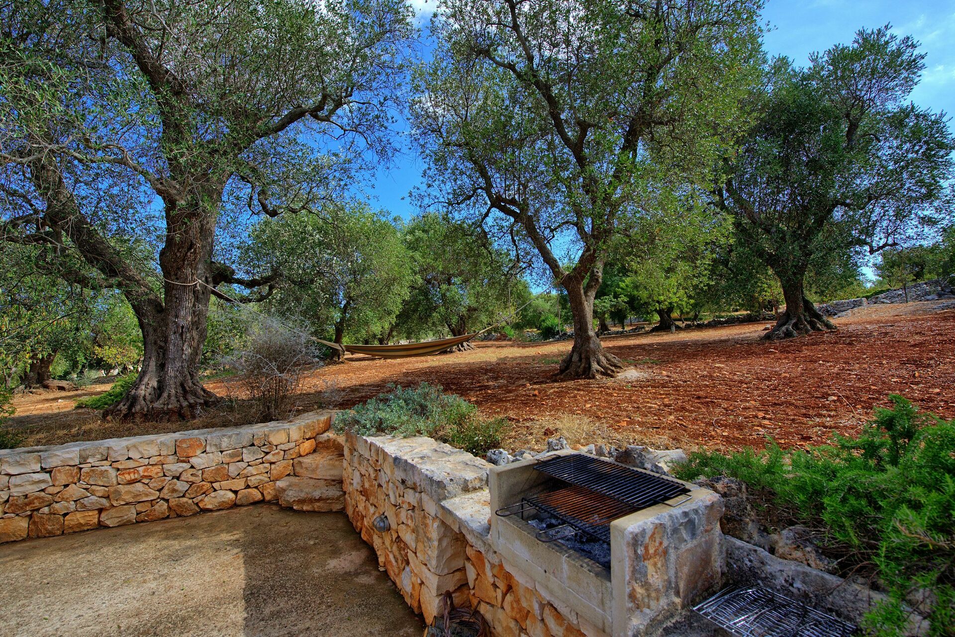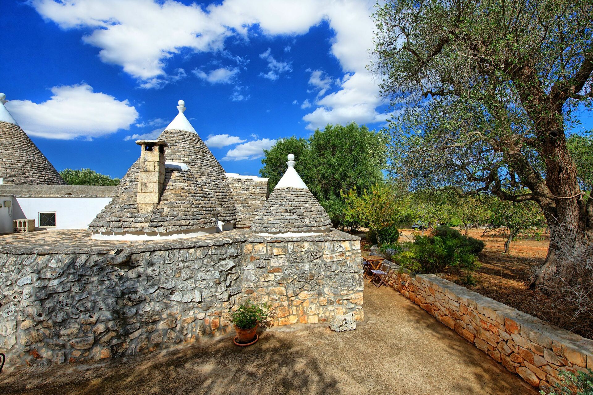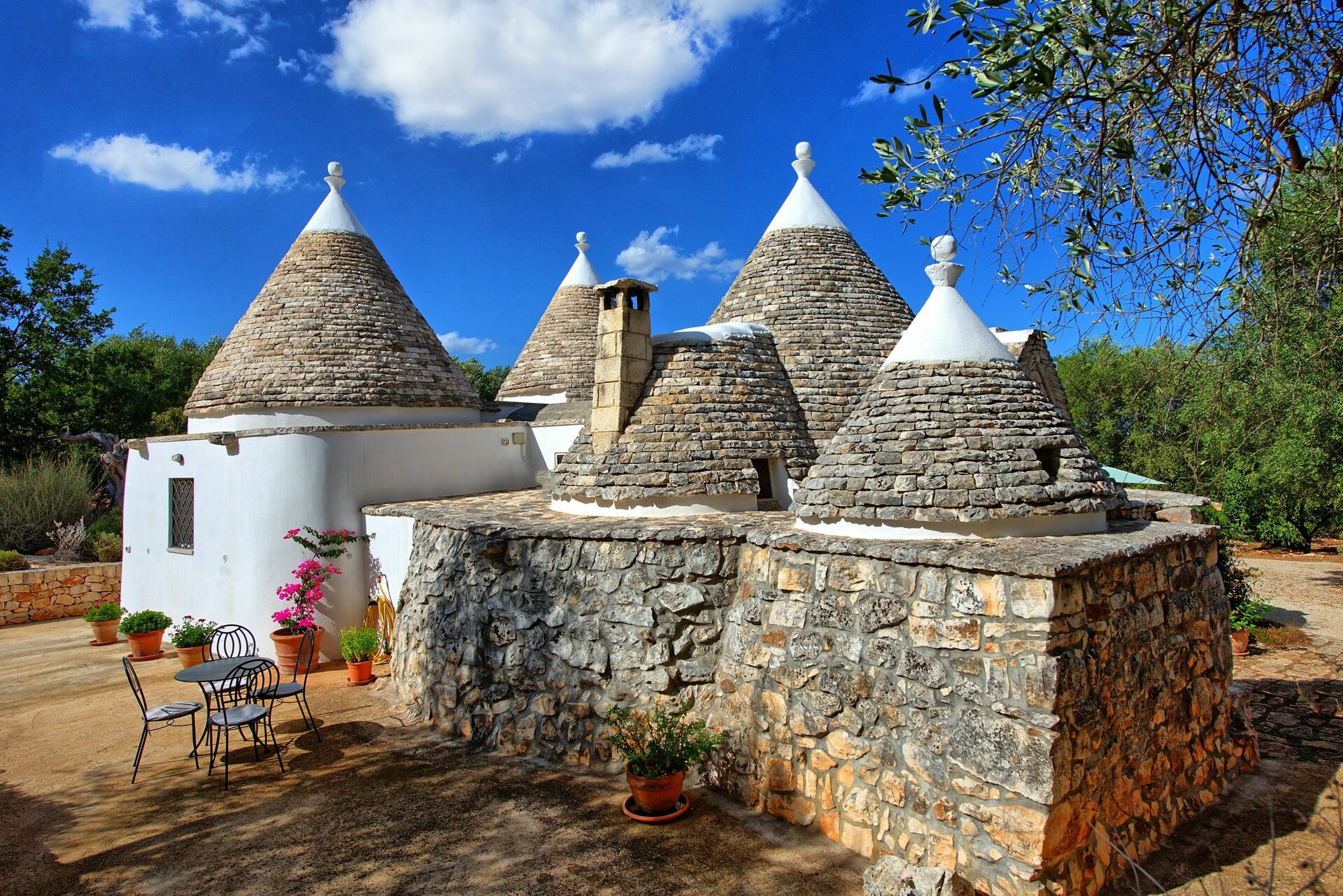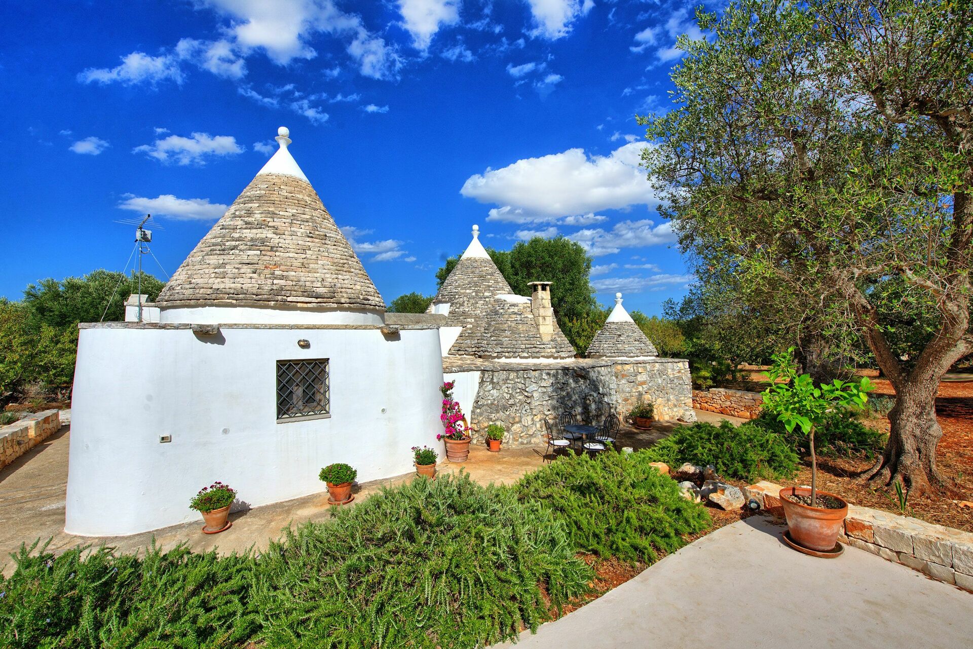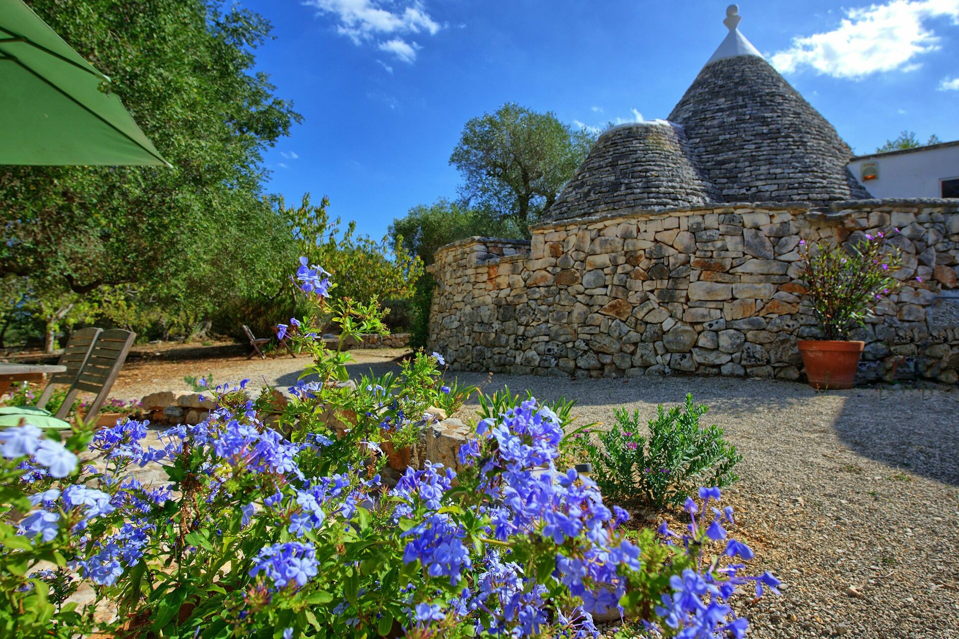 Nei mesi più freddi il riscaldamento e una stufa a legna vi terranno al caldo mentre nei mesi più caldi le grandi pareti manterranno all'interno del trullo una temperatura gradevole.