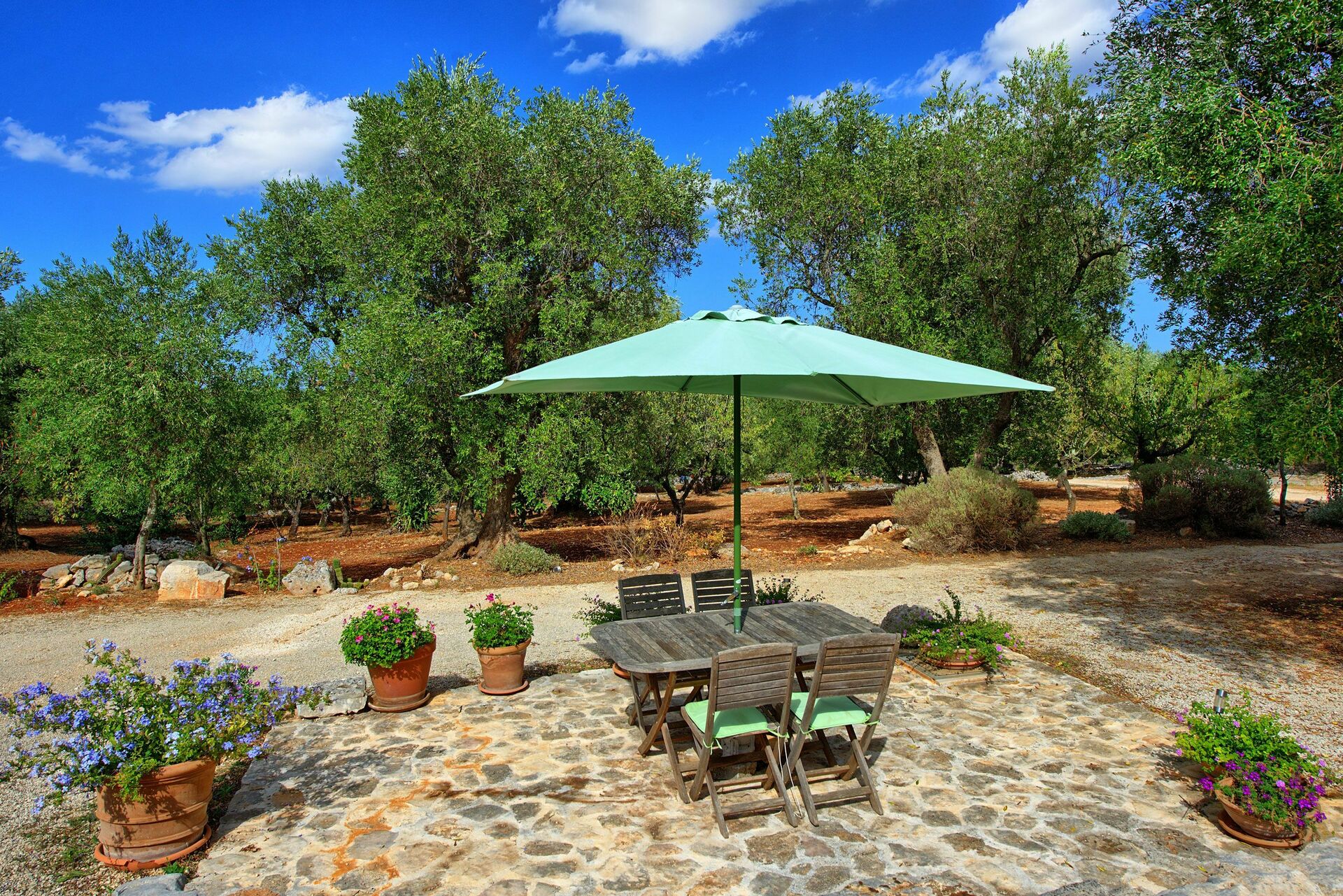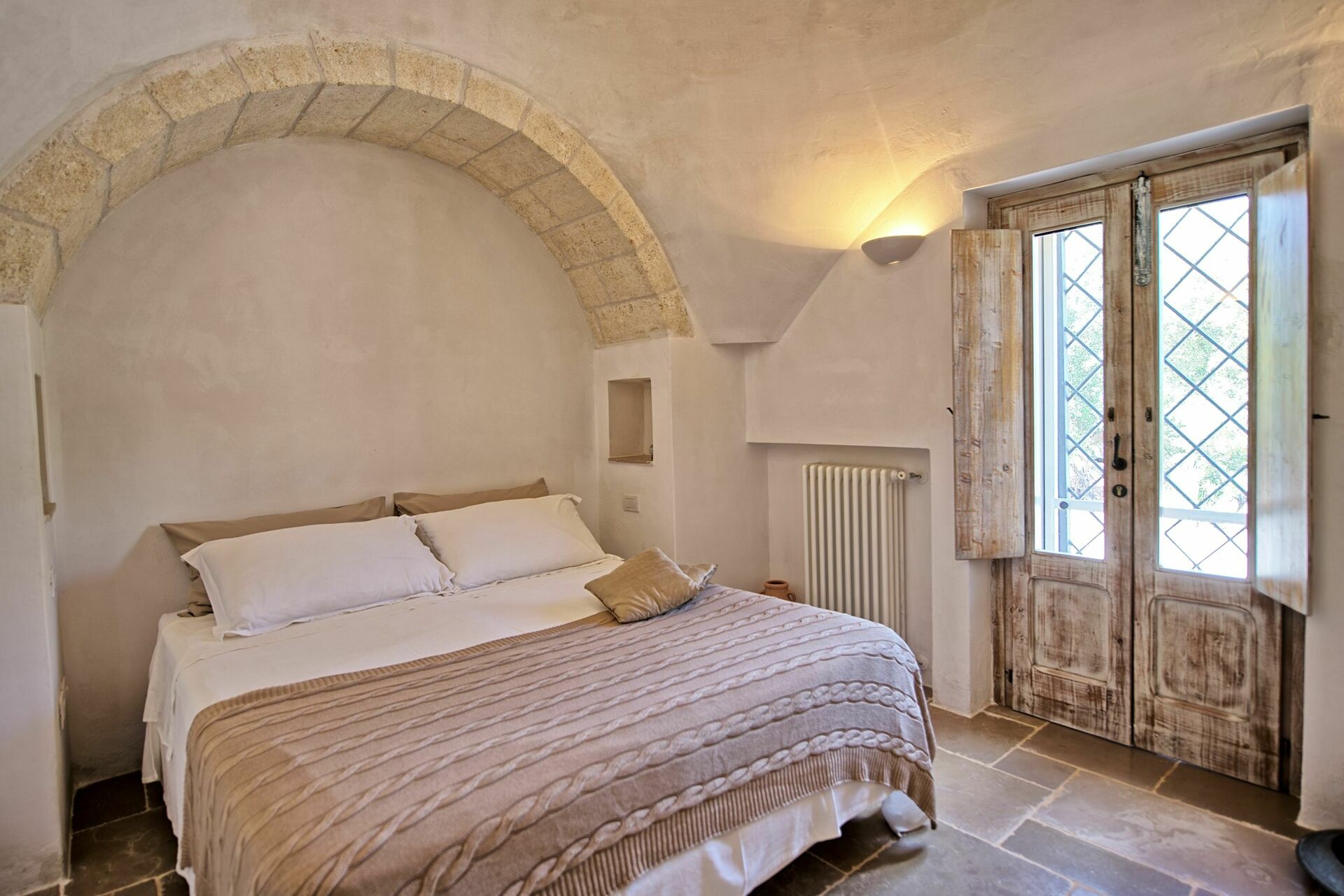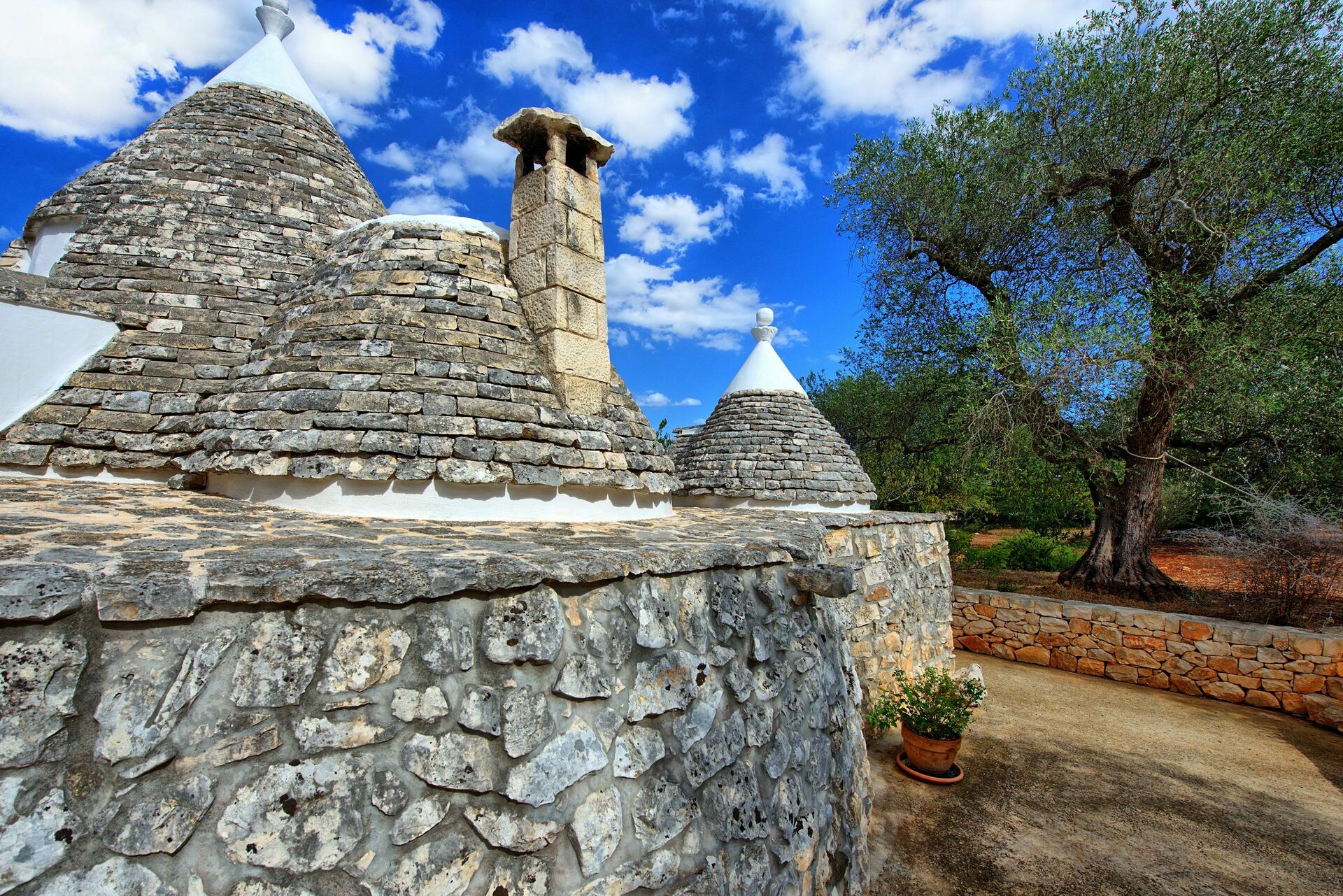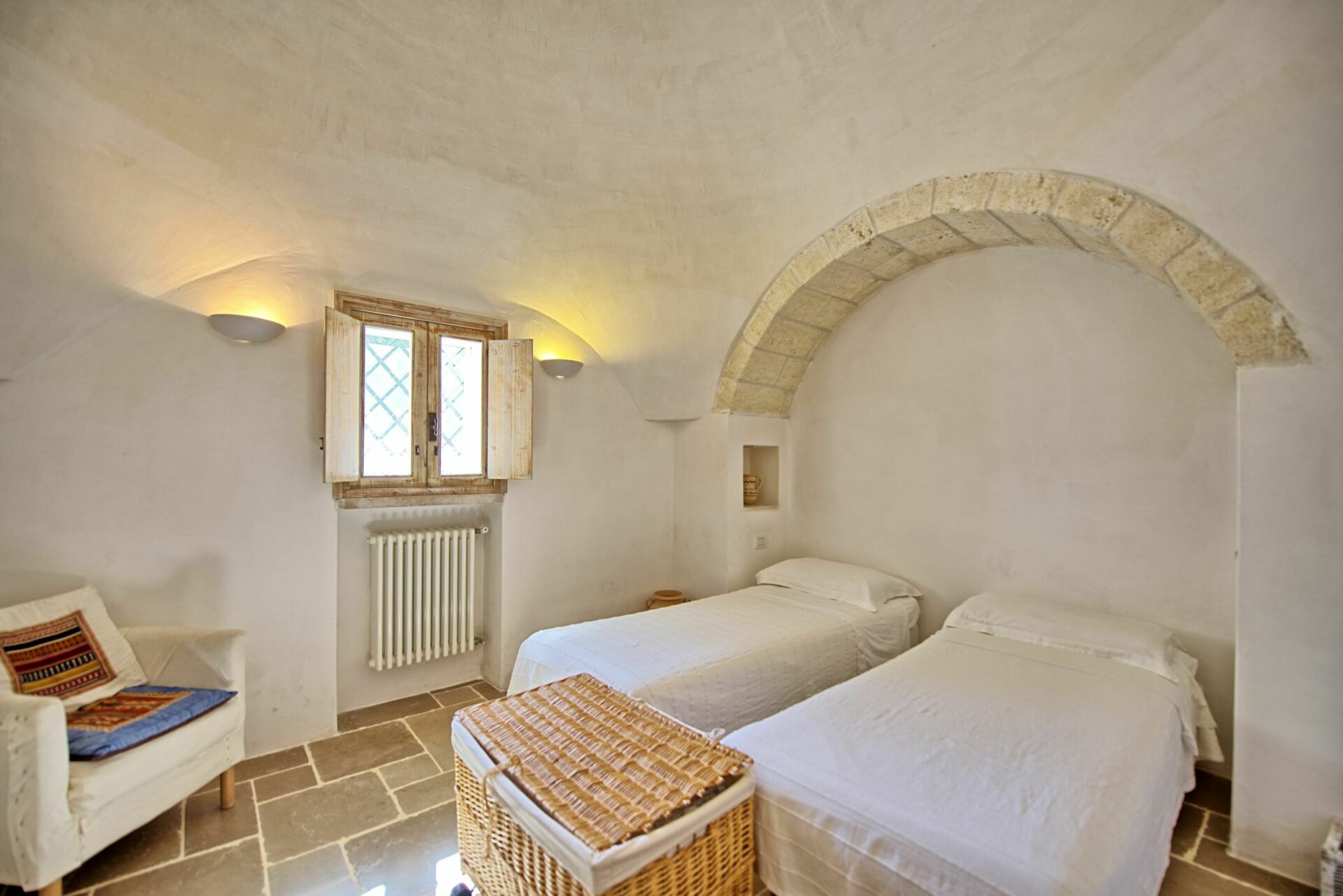 Nei mesi più freddi il riscaldamento e una stufa a legna vi terranno al caldo mentre nei mesi più caldi le grandi pareti manterranno all'interno del trullo una temperatura gradevole.