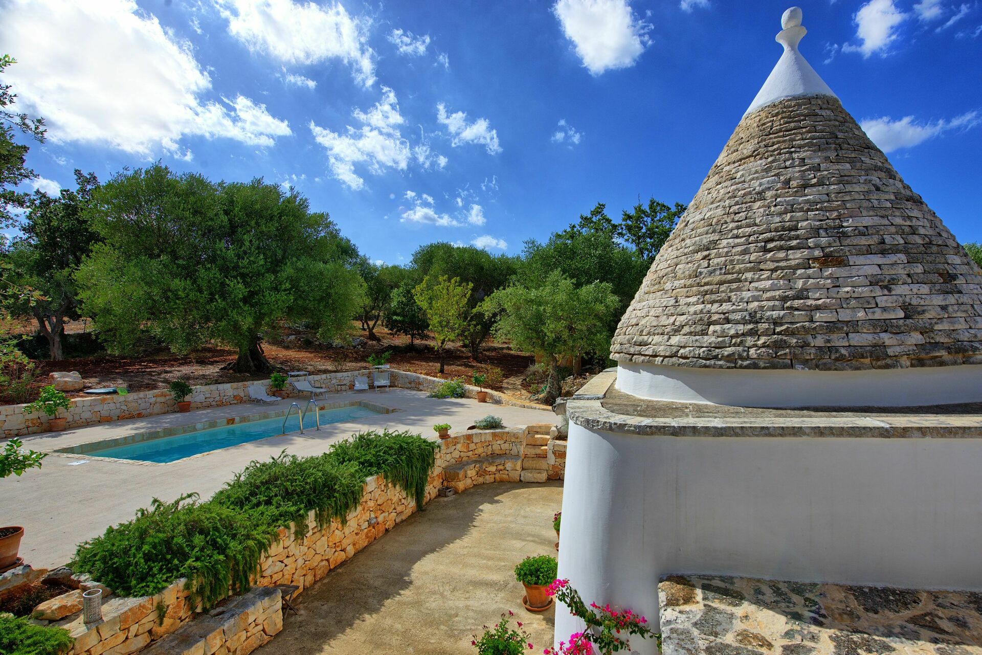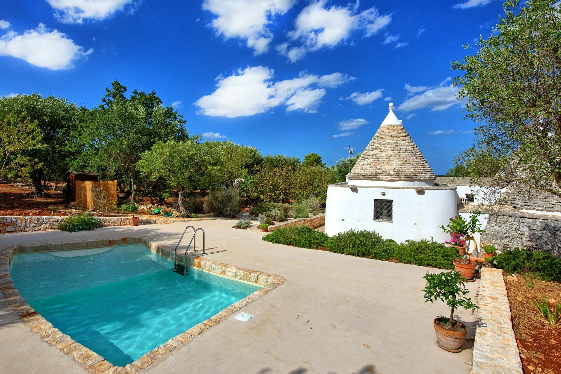 Trullo Pascarosa ha una bella piscina privata e un giardino dover poter passare indimenticabili vacanze; la proprietà si trova all'interno di 5 ettari di terreno coltivato con 150 ulivi e tanti alberi da frutta. Sarete immersi nella tipica campagna pugliese e questo magnifico trullo vi impressionerà per la sua tipicità e storia.