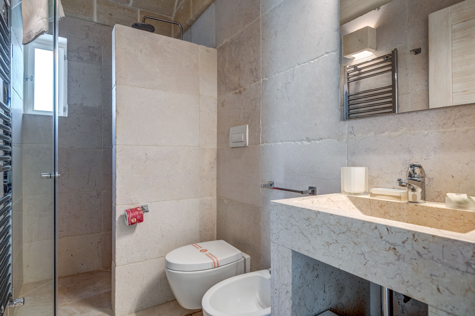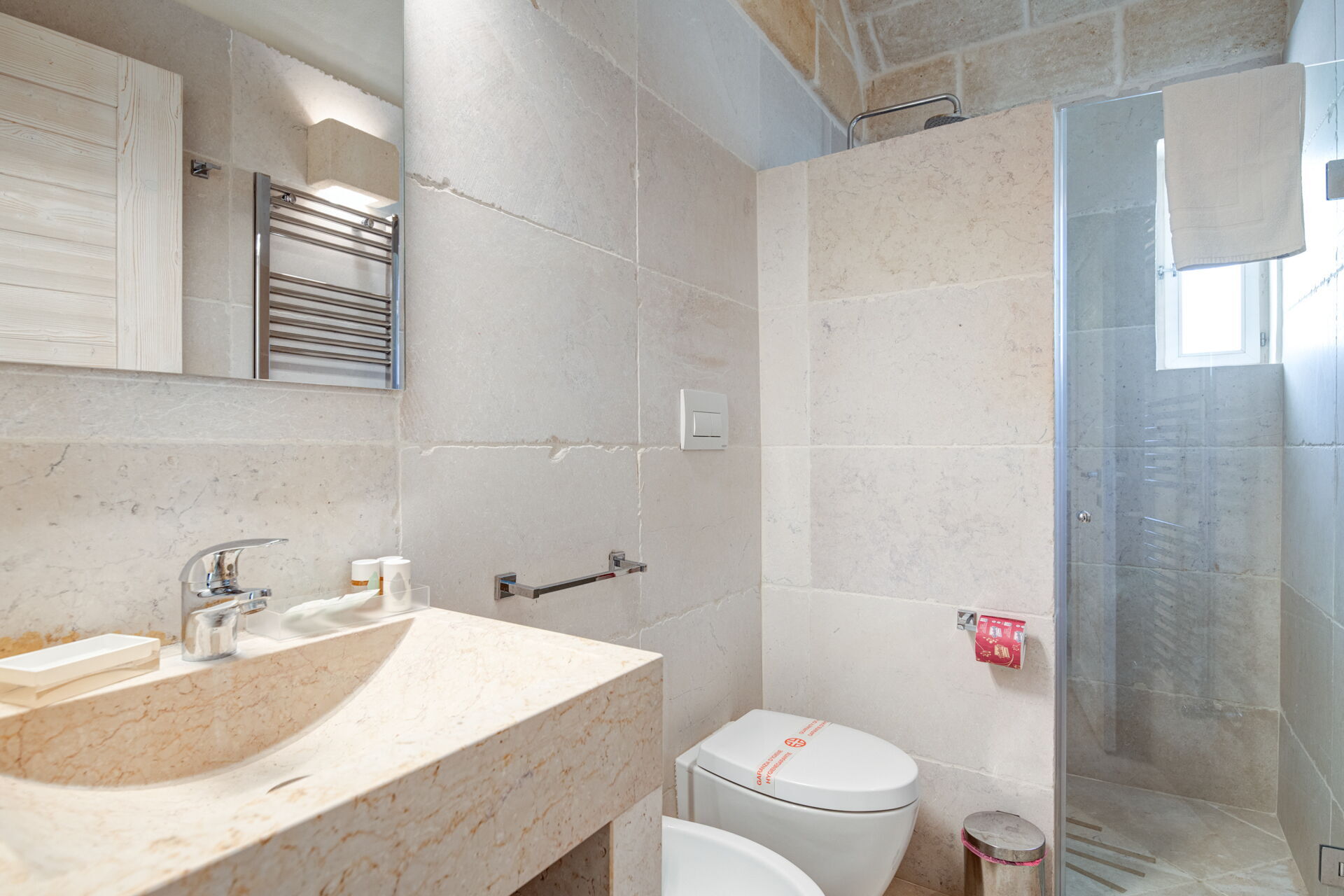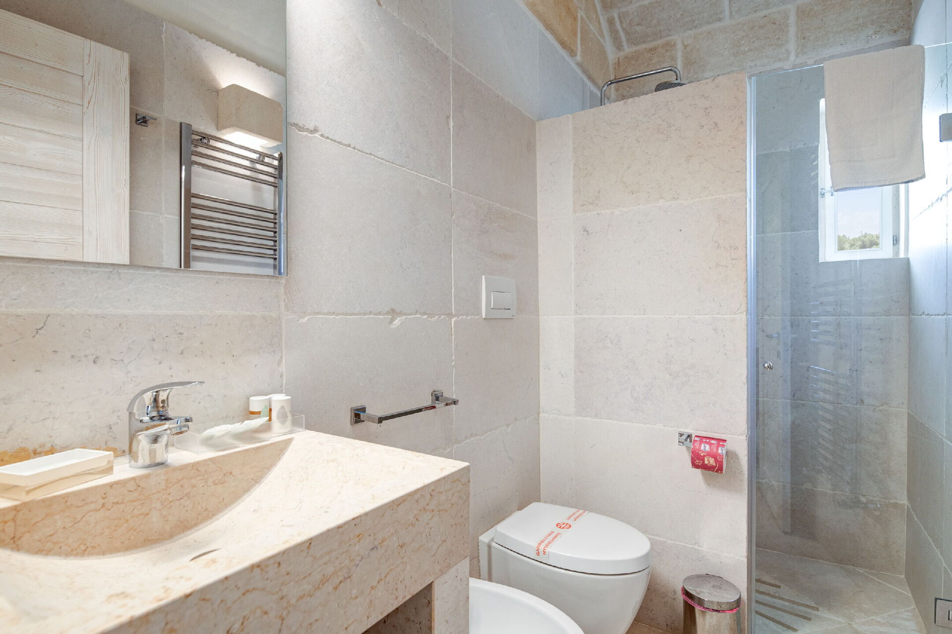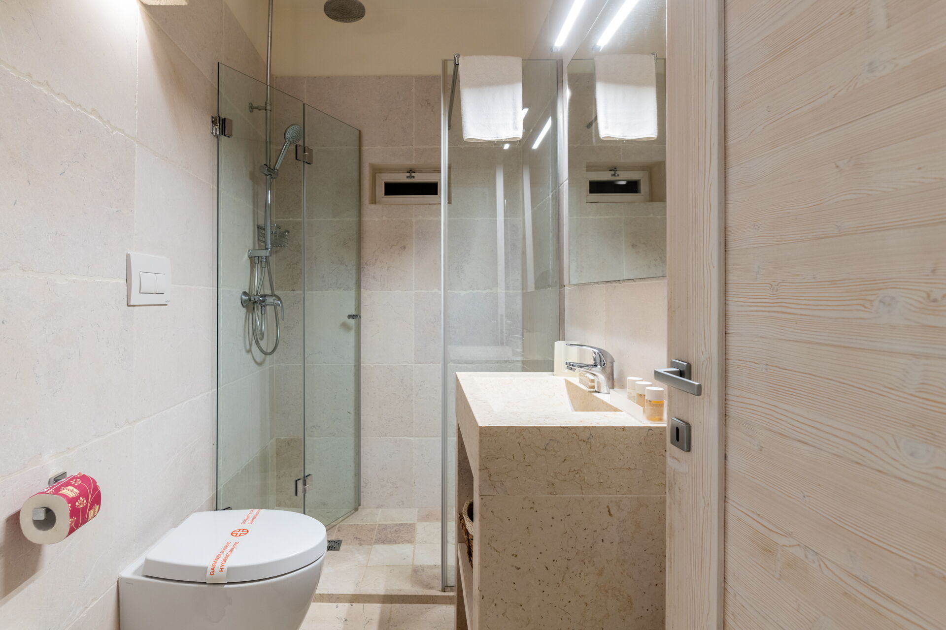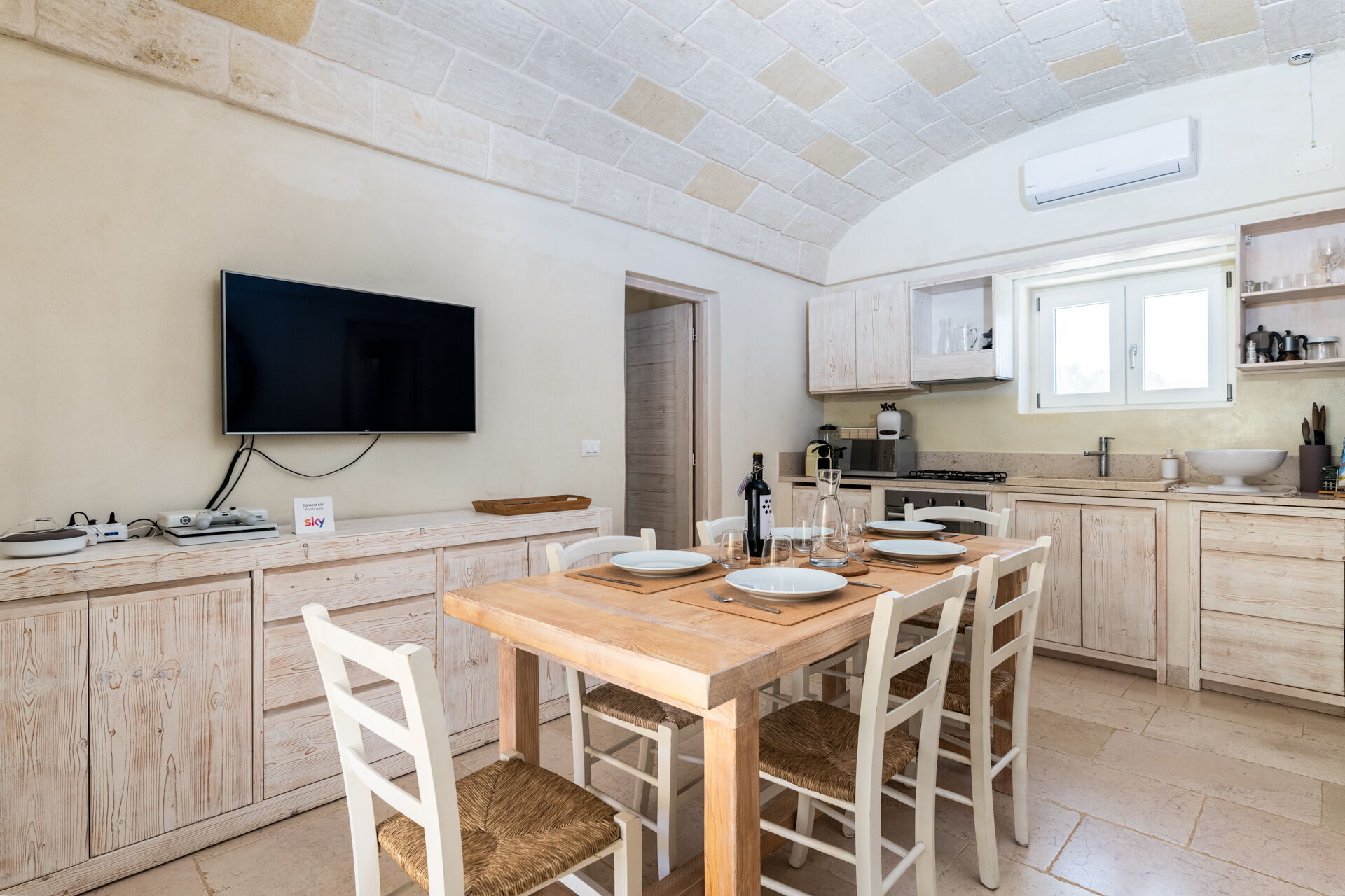 Piano inferiore (accesso tramite scala esterna): camera matrimoniale con aria condizionata e bagno privato con doccia; stanza di servizio con lavatrice.