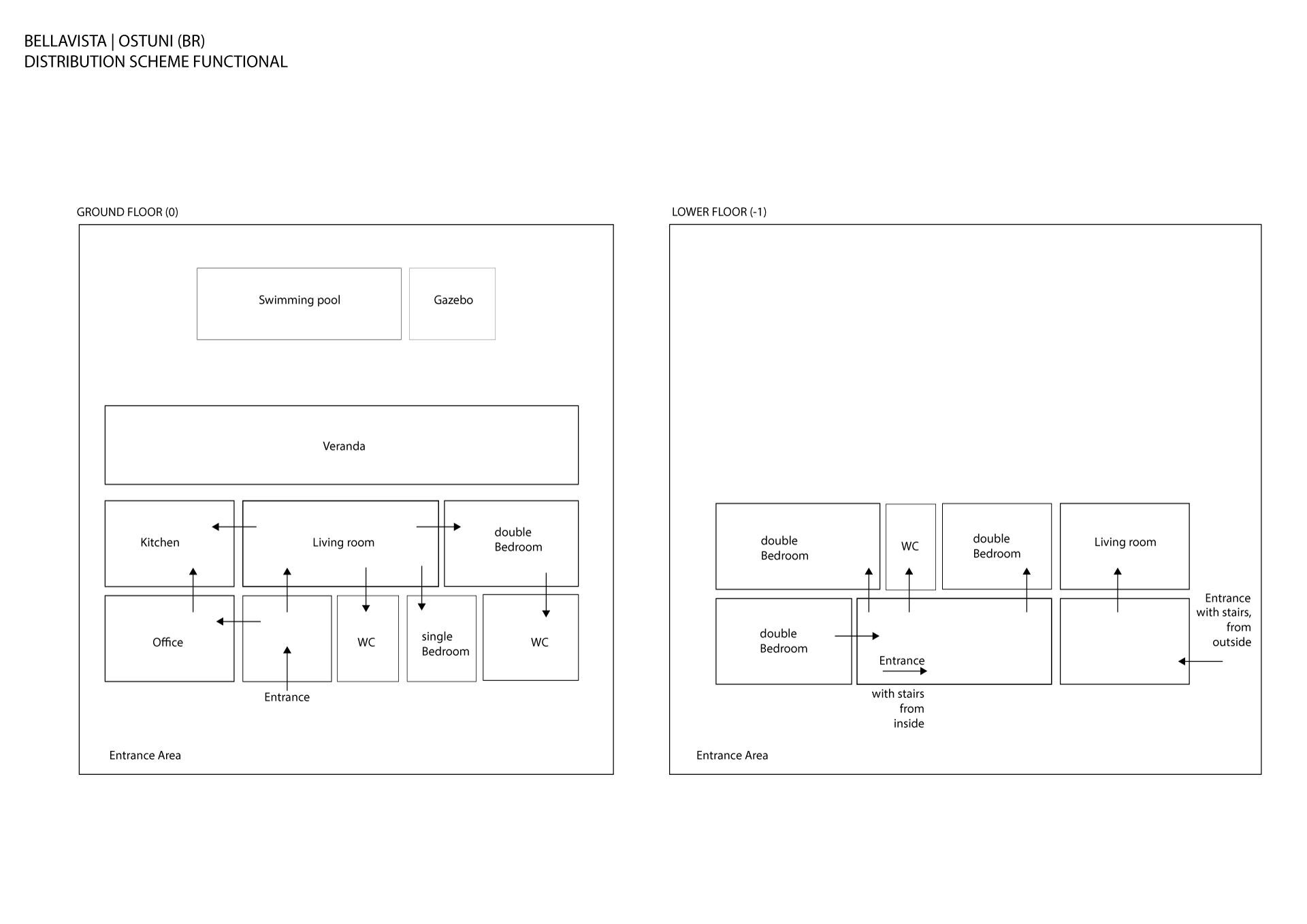 Piano terreno: ingresso dal portico, ampia zona living con caminetto, soggiorno, cucina (lavastoviglie), bagno con doccia, camera singola con letto alla francese, ampia camera matrimoniale con bagno privato con vasca e doccia.