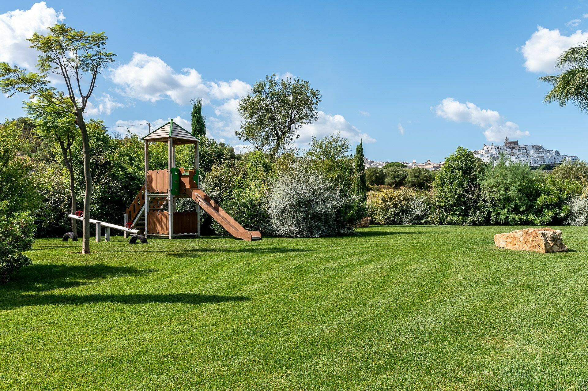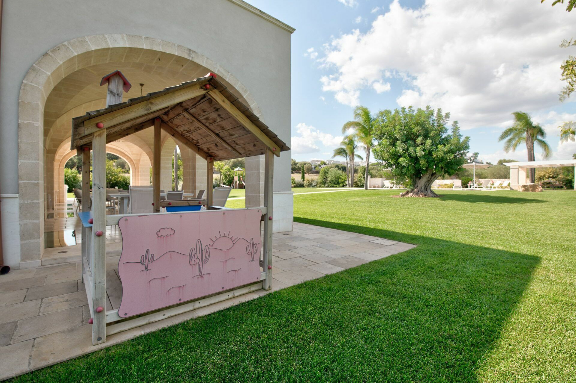 A lato della piscina è situato un moderno gazebo con tavolo da pranzo, mentre un’ampia veranda con vista piscina, con altra zona pranzo e zona relax, corre su tutto il lato della villa. Completa le zone esterne un piccolo parco giochi per i più piccoli, a pochi passi dalla piscina.