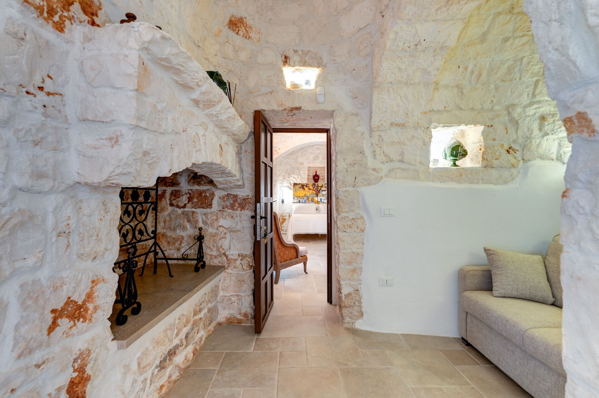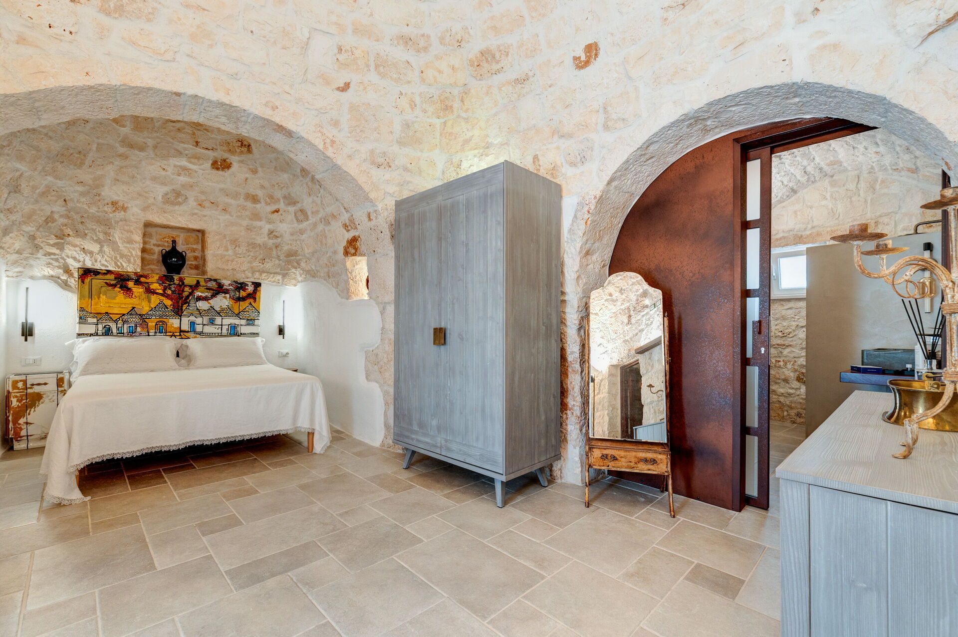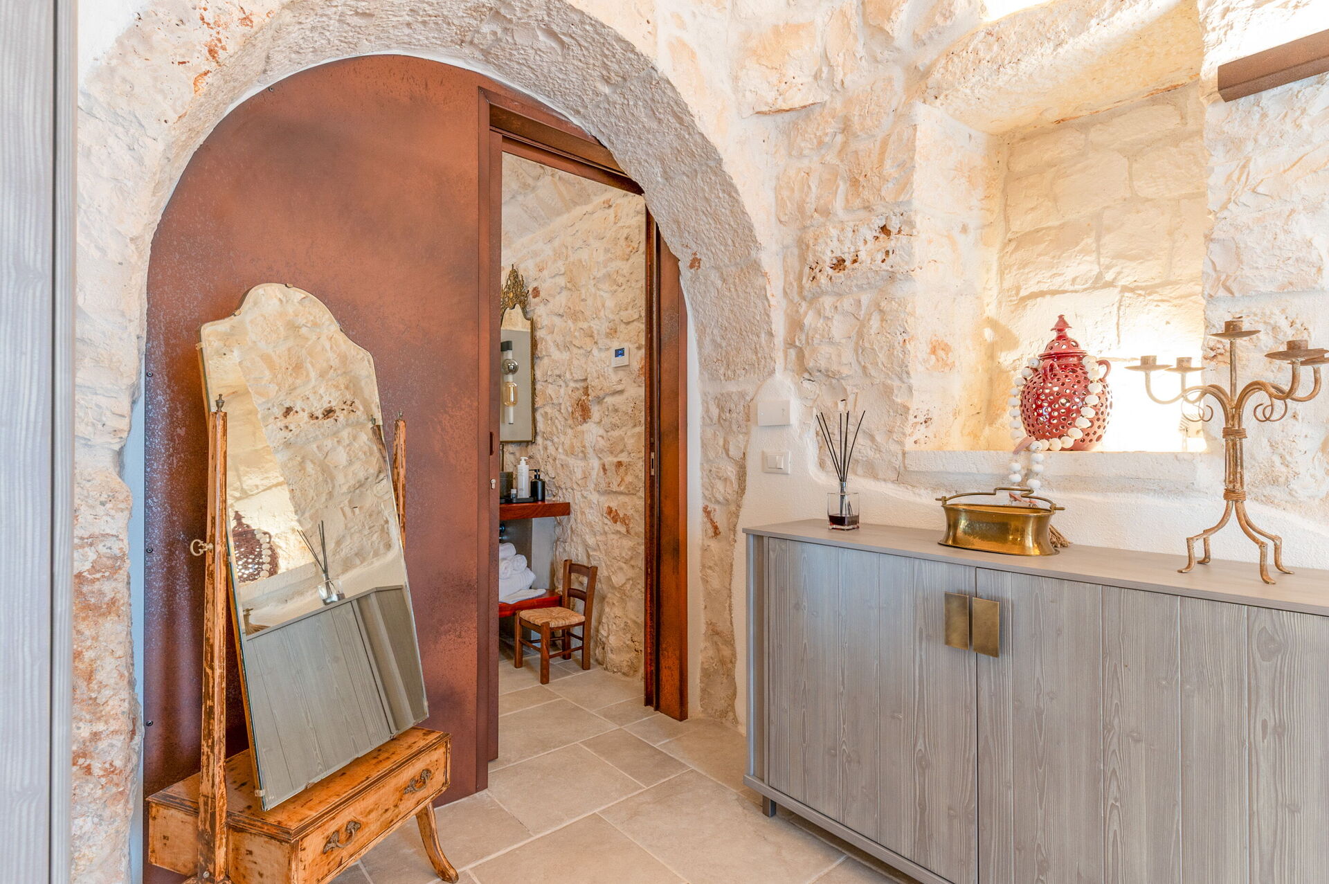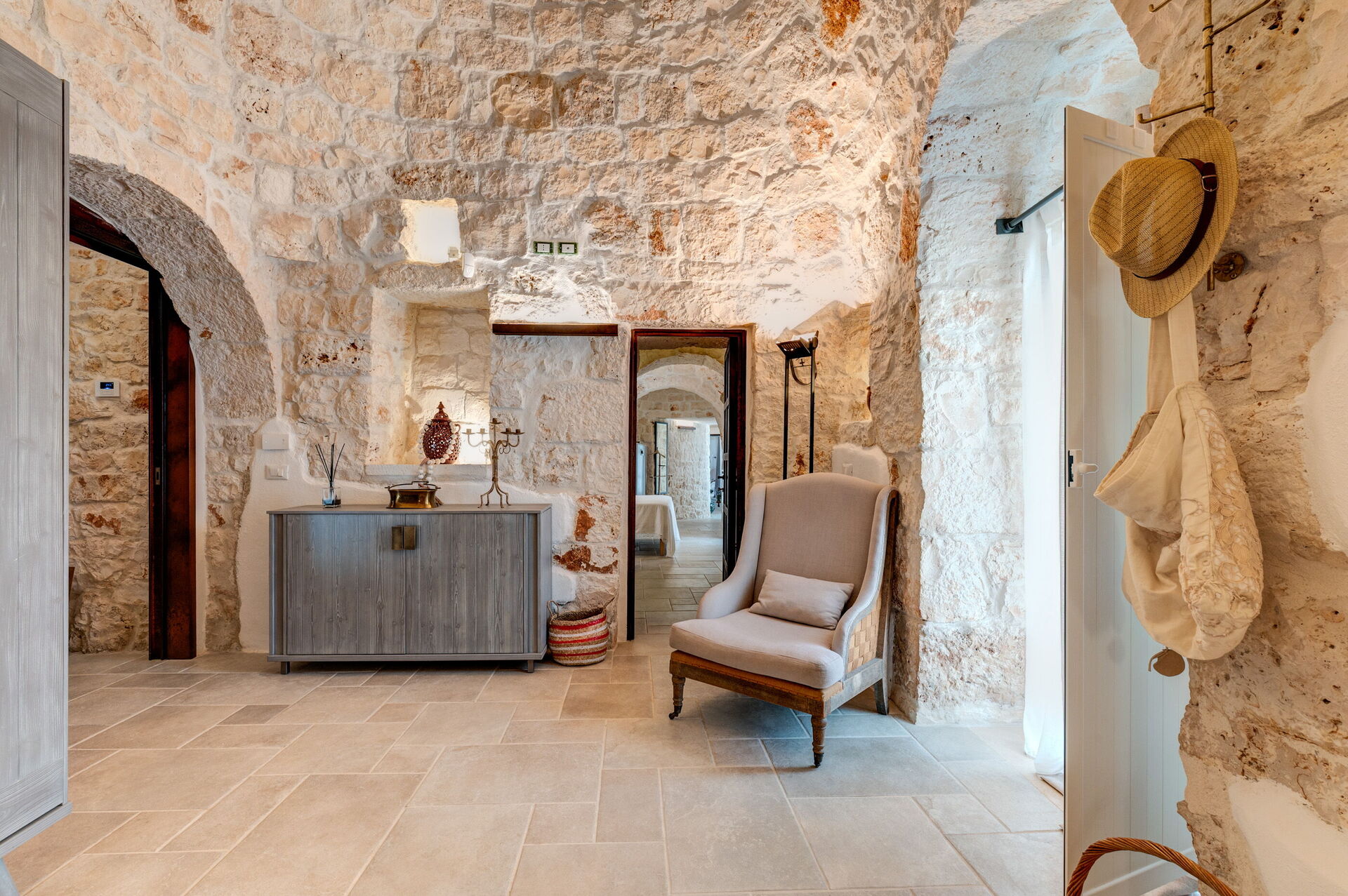 Internamente è stata finemente arredata con gusto e semplicità, creando un contrasto tra lo stile classico e i materiali tradizionali come la pietra locale e il legno.