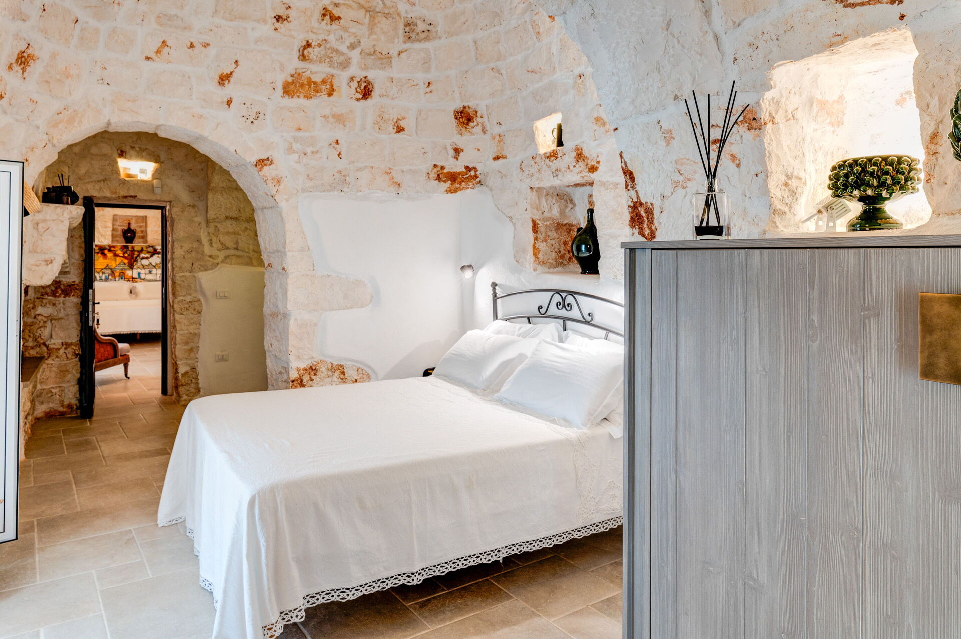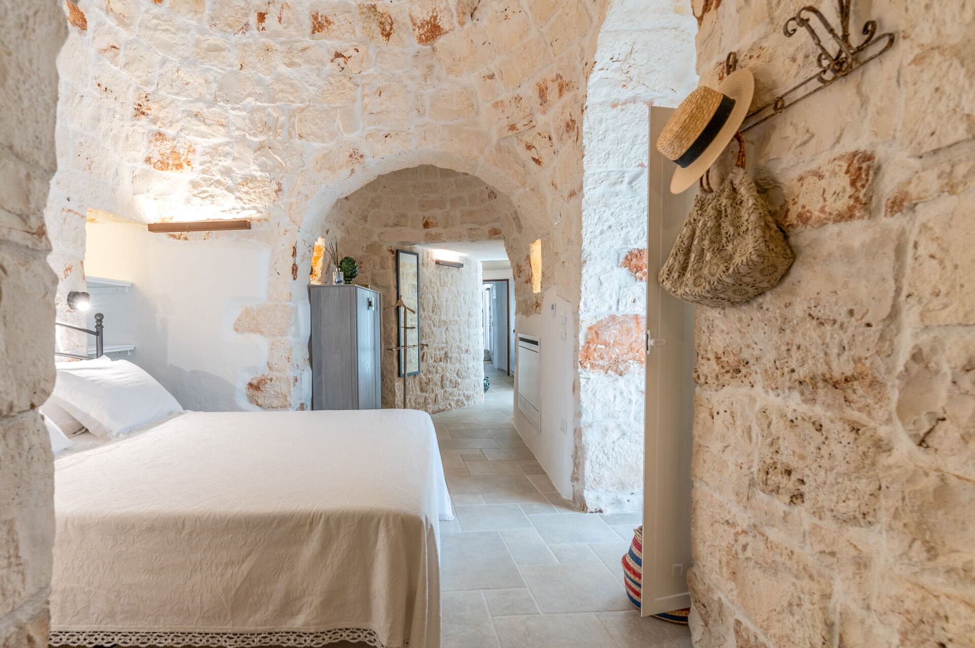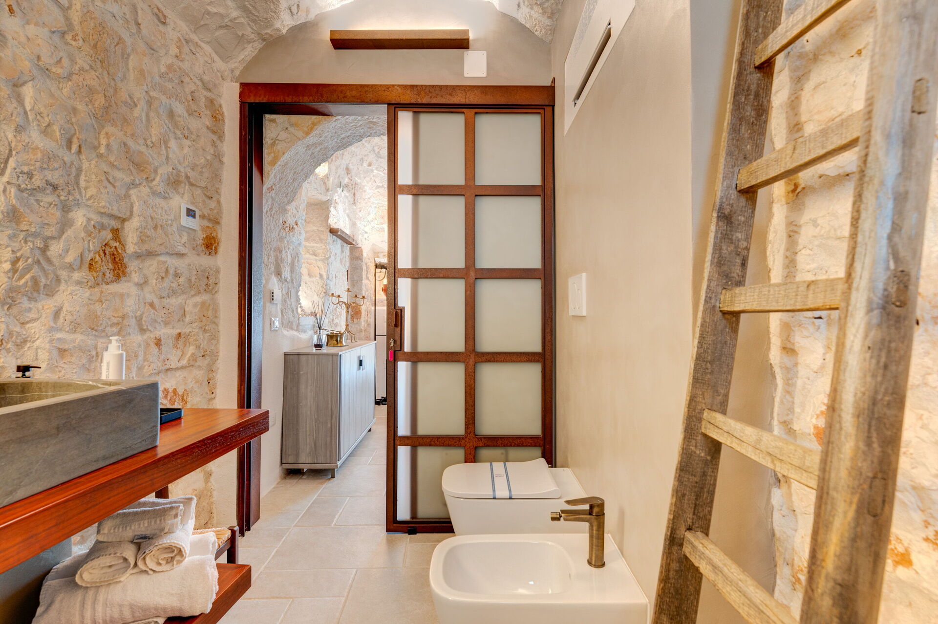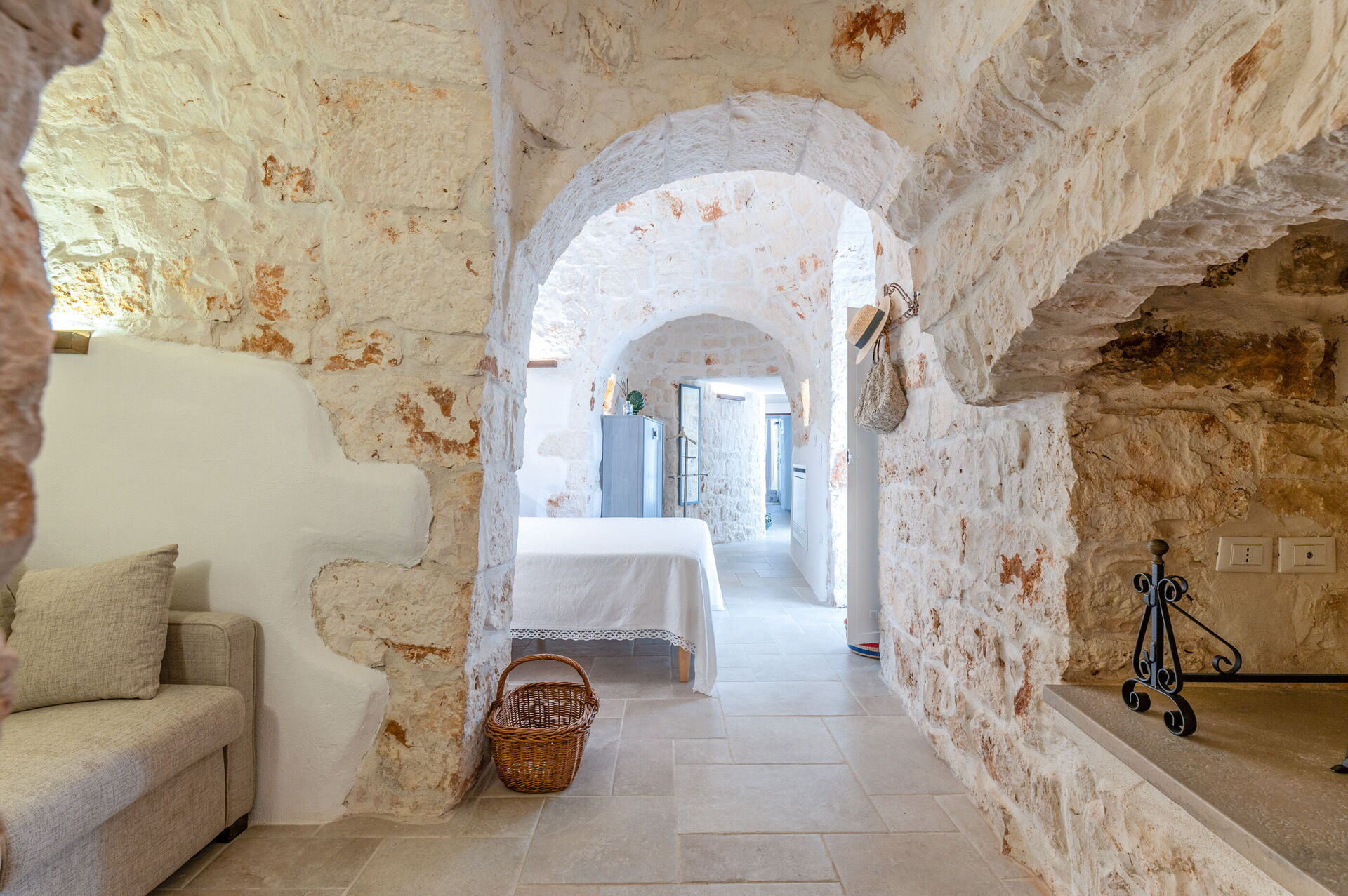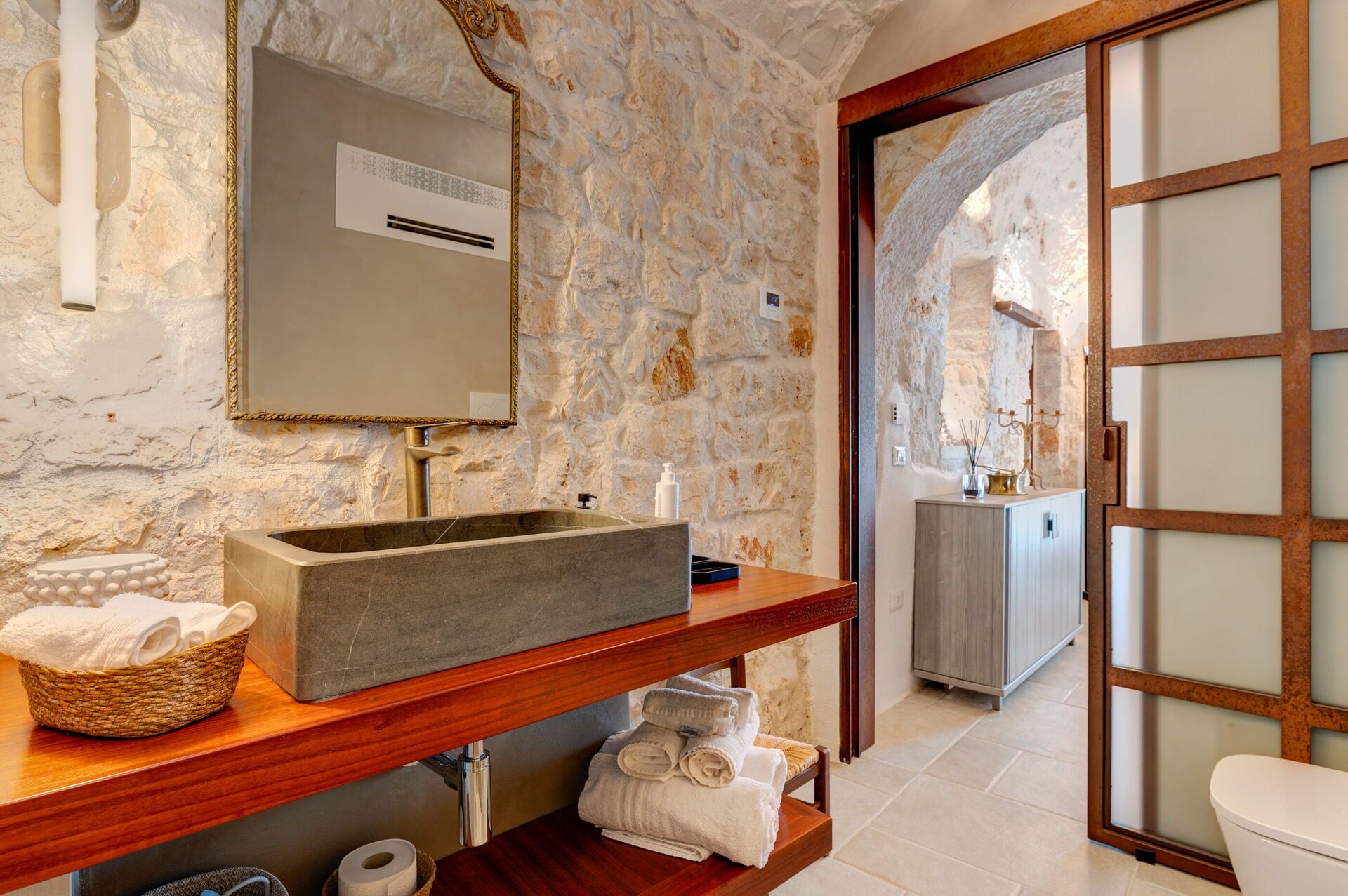 Internamente è stata finemente arredata con gusto e semplicità, creando un contrasto tra lo stile classico e i materiali tradizionali come la pietra locale e il legno.