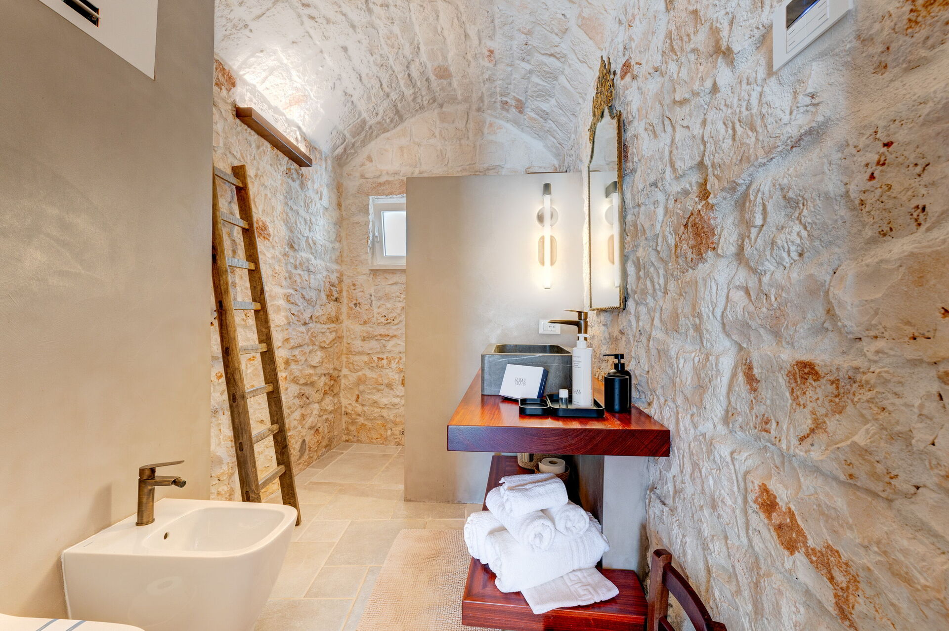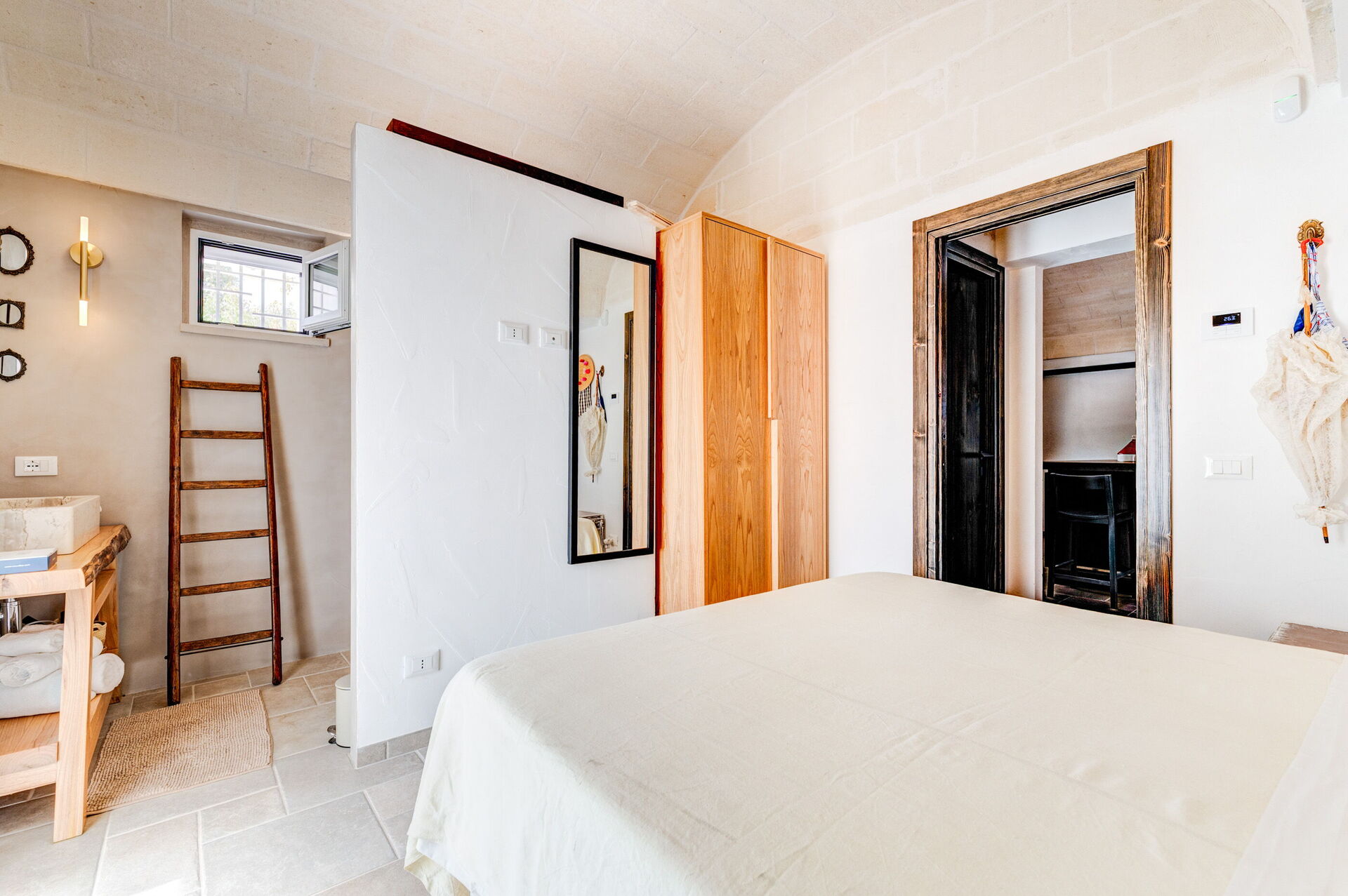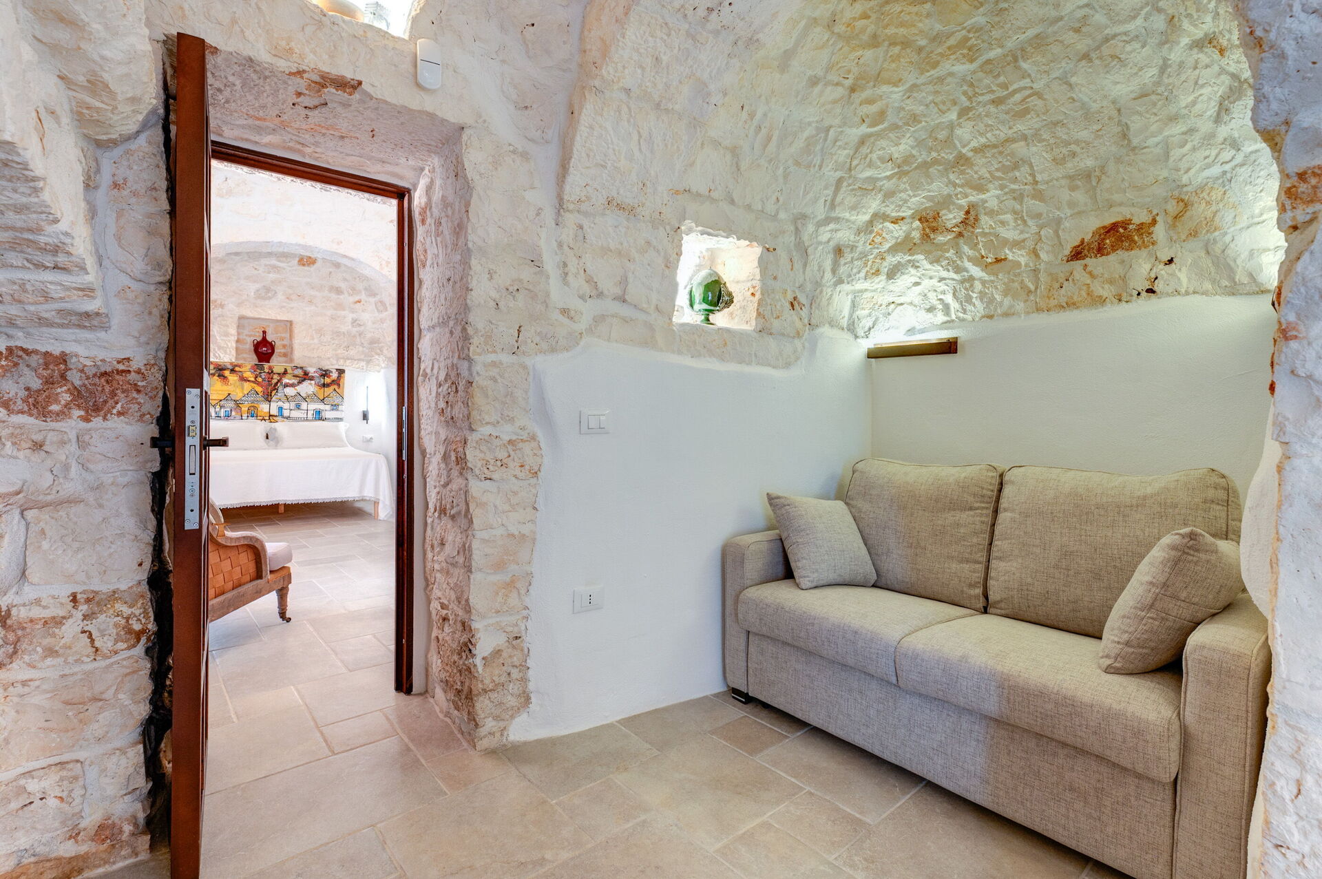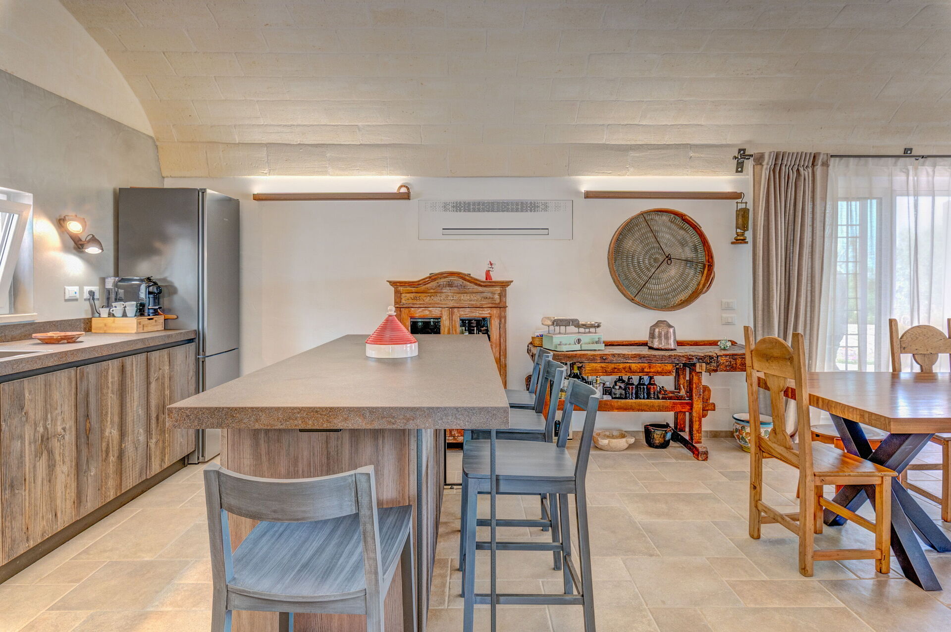 Internamente è stata finemente arredata con gusto e semplicità, creando un contrasto tra lo stile classico e i materiali tradizionali come la pietra locale e il legno.