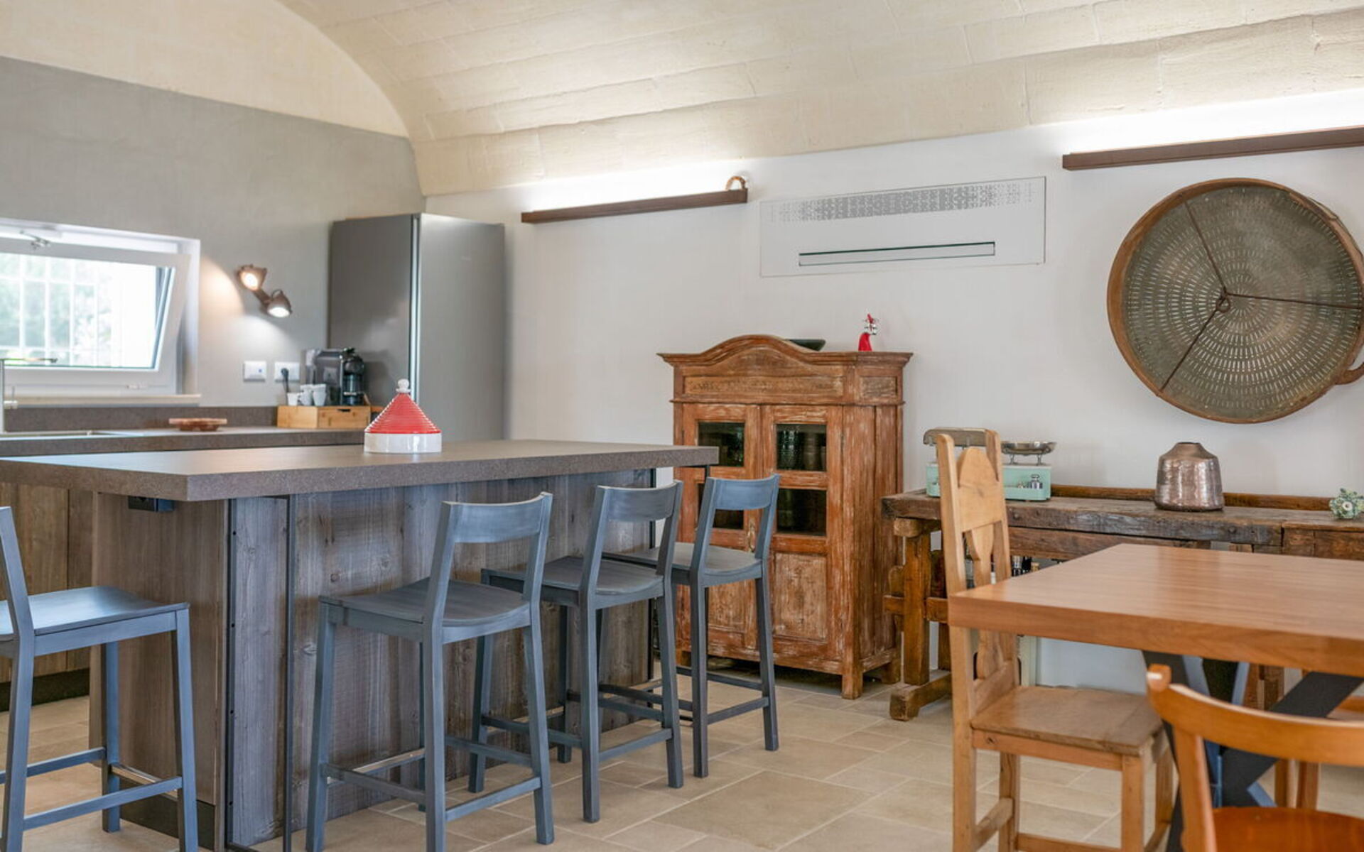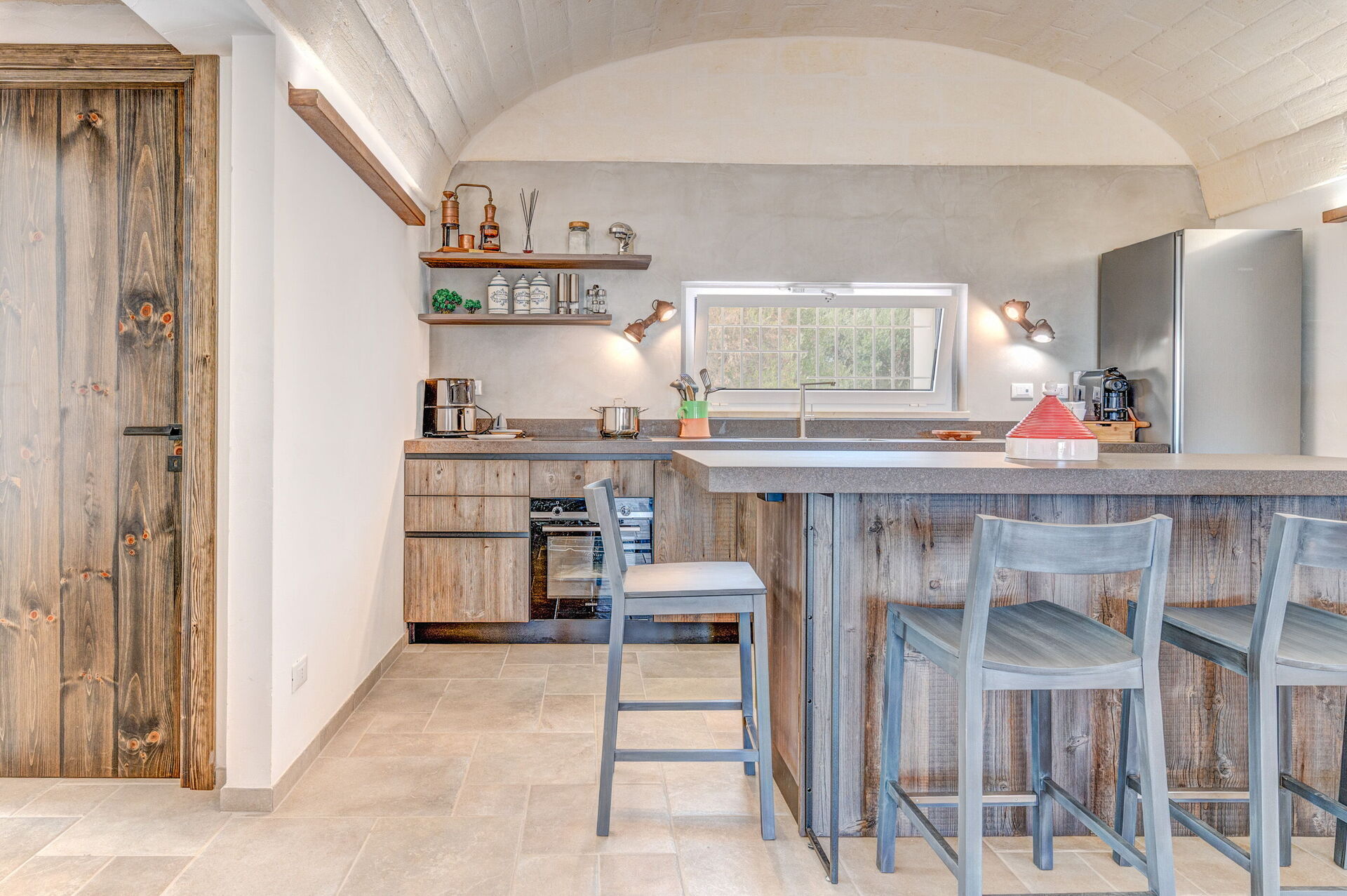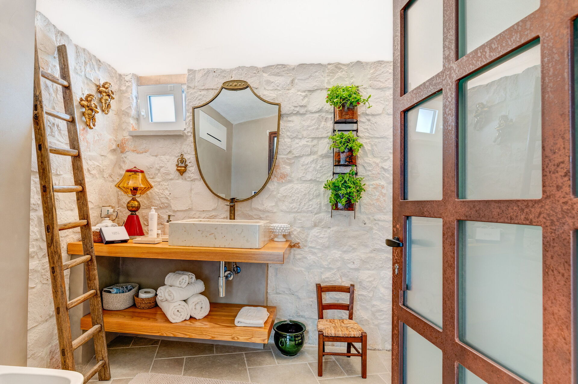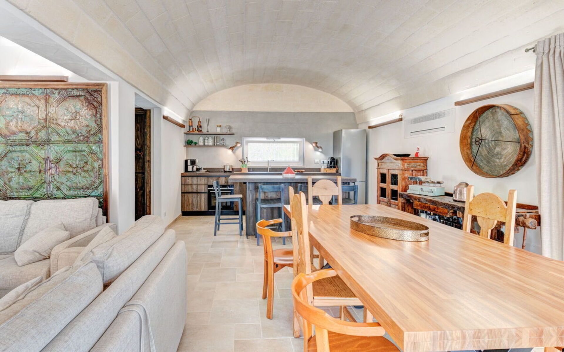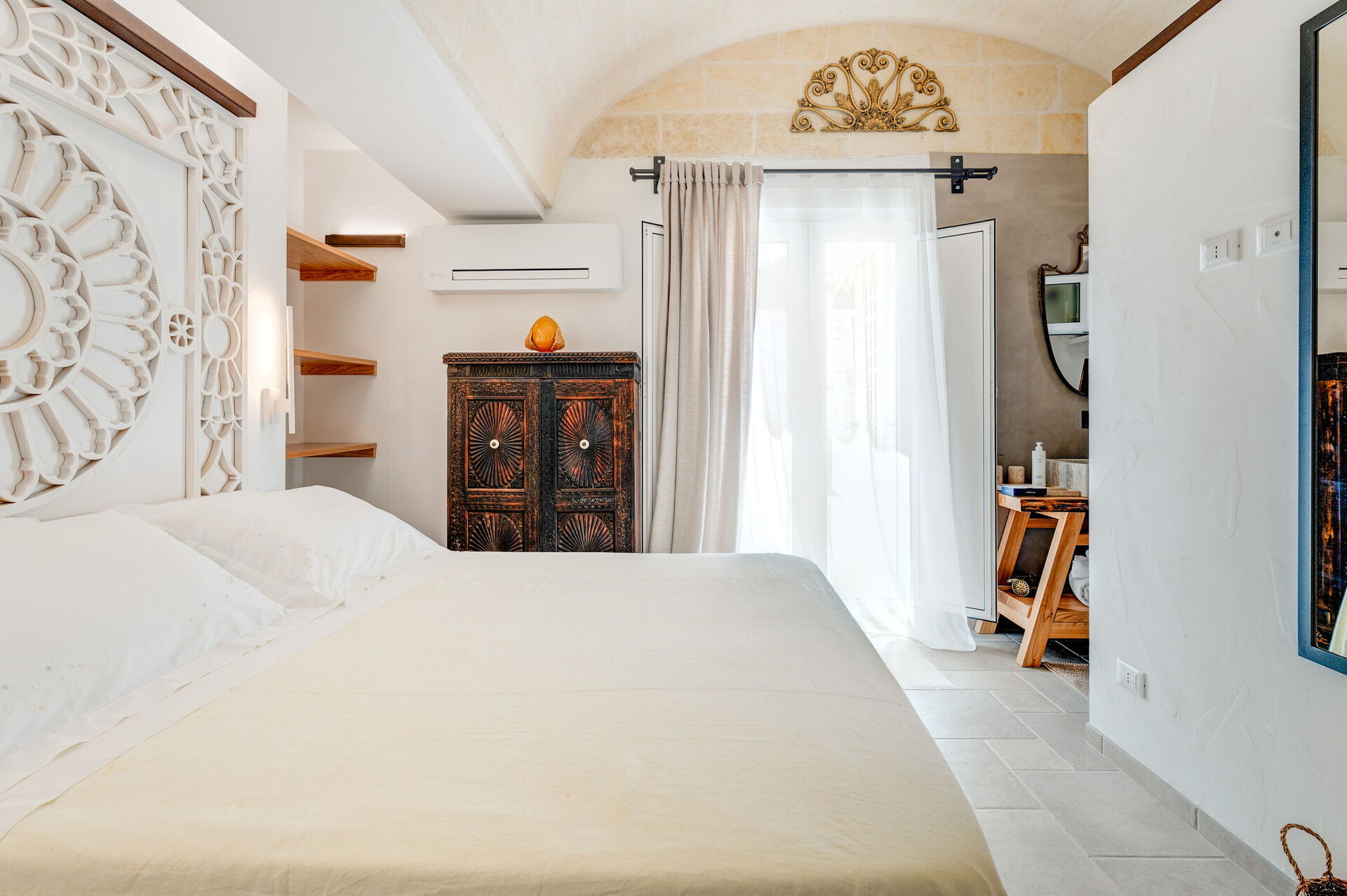 Internamente è stata finemente arredata con gusto e semplicità, creando un contrasto tra lo stile classico e i materiali tradizionali come la pietra locale e il legno.