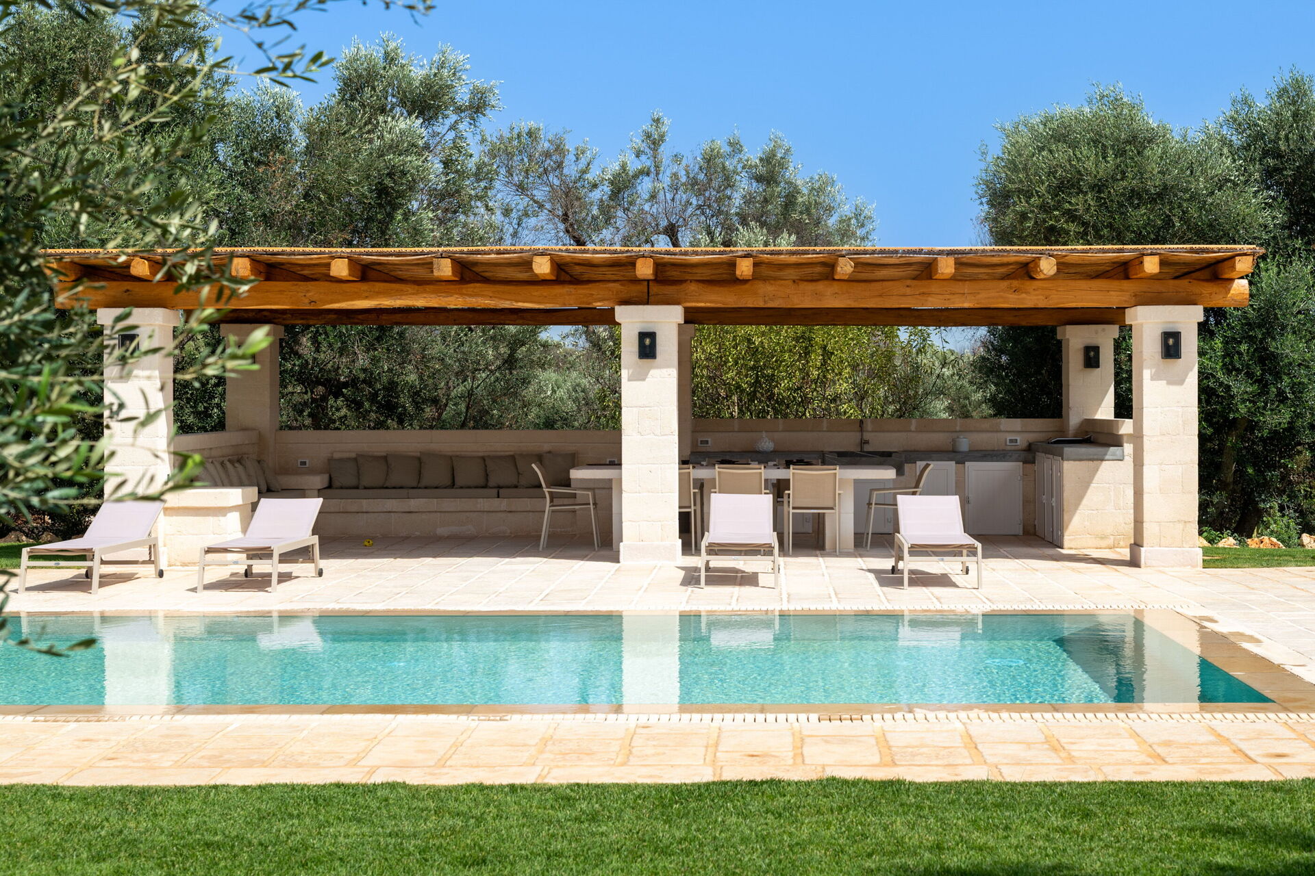 Esternamente, oltre ad una bella piscina ad uso esclusivo degli ospiti, la proprietà dispone di ampie zone per poter trascorrere una vacanza all’aria aperta: una grande veranda vicino alla piscina con cucina esterna, barbecue e una bella zona relax sono a completa disposizione degli ospiti.