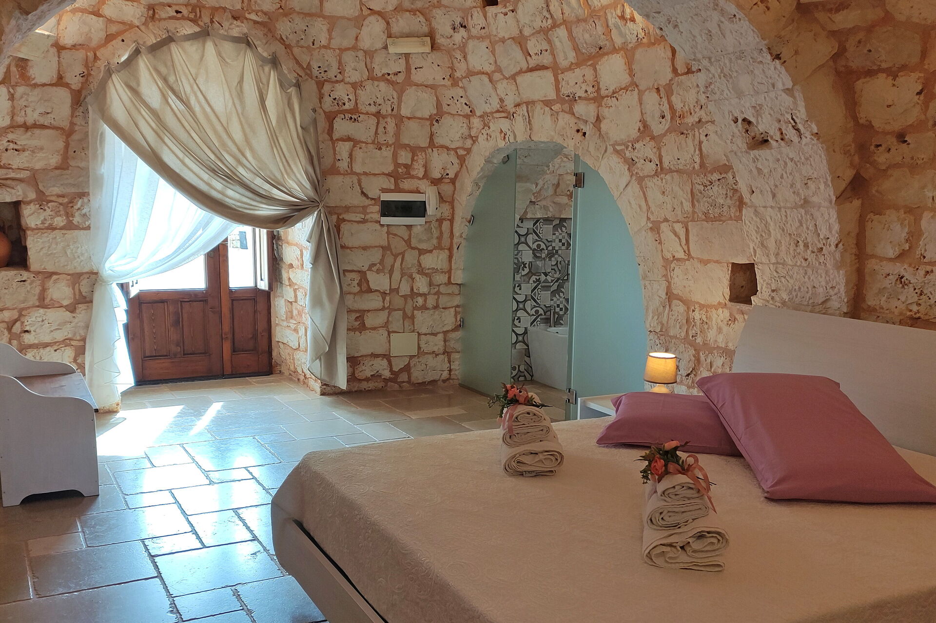 Attraverso l'ultima camera si raggiunge un'altra camera matrimoniale con bagno privato con doccia: è possibile raggiungere questa quarta camera anche direttamente dall'esterno.